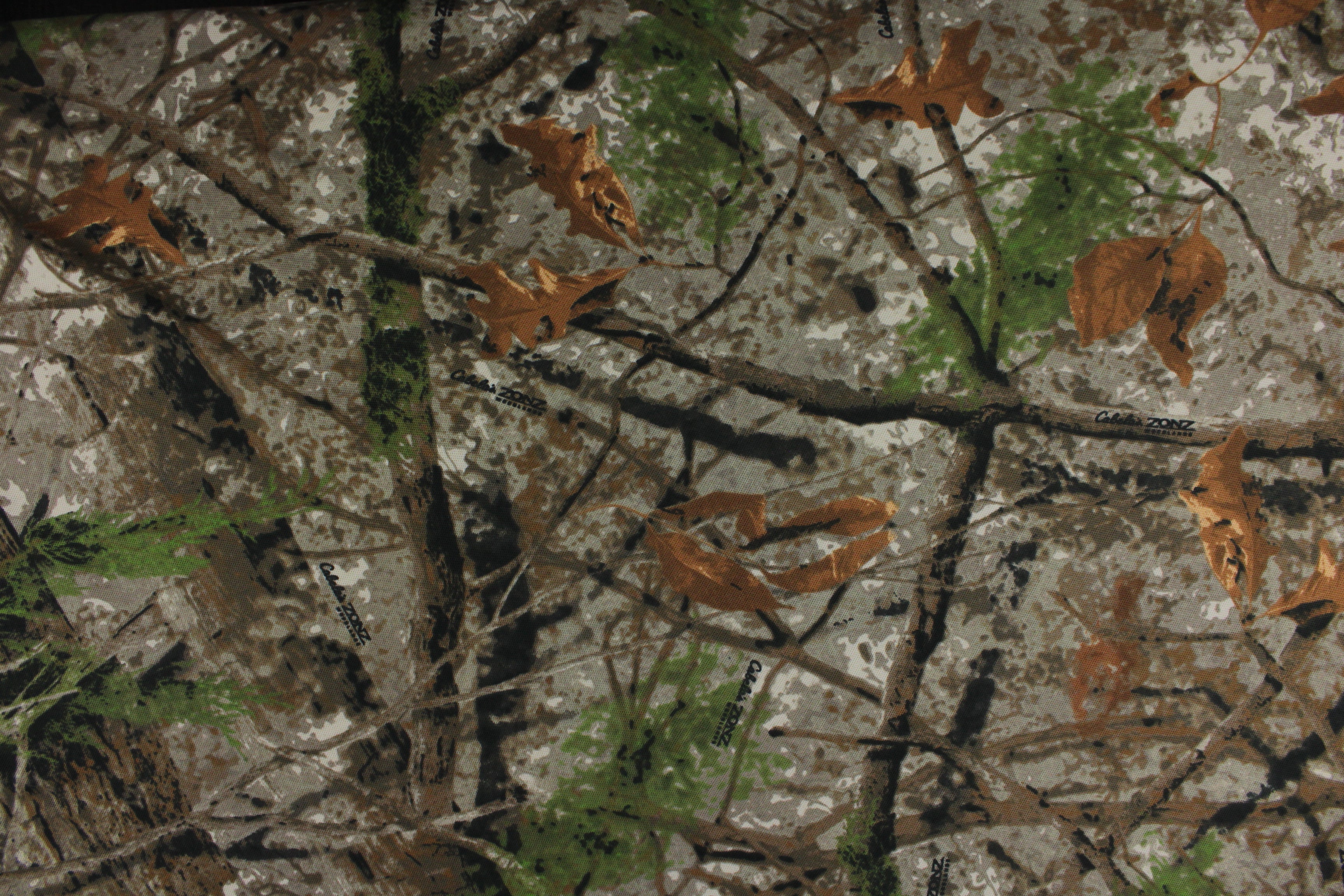 DESCRIPTION: Cabela's Zonz Camouflage Mesh Fabric in in Tan design incorporates an intricate mix of realistic elements including tree bark, exposed wood grain, overlapping branches, twigs, and both fall-colored (brown/orange) and evergreen (green) leaves on a 98% Cotton / 2% Spandex mesh look fabric
