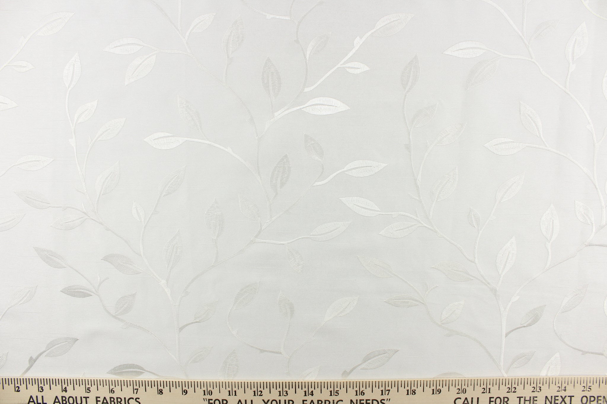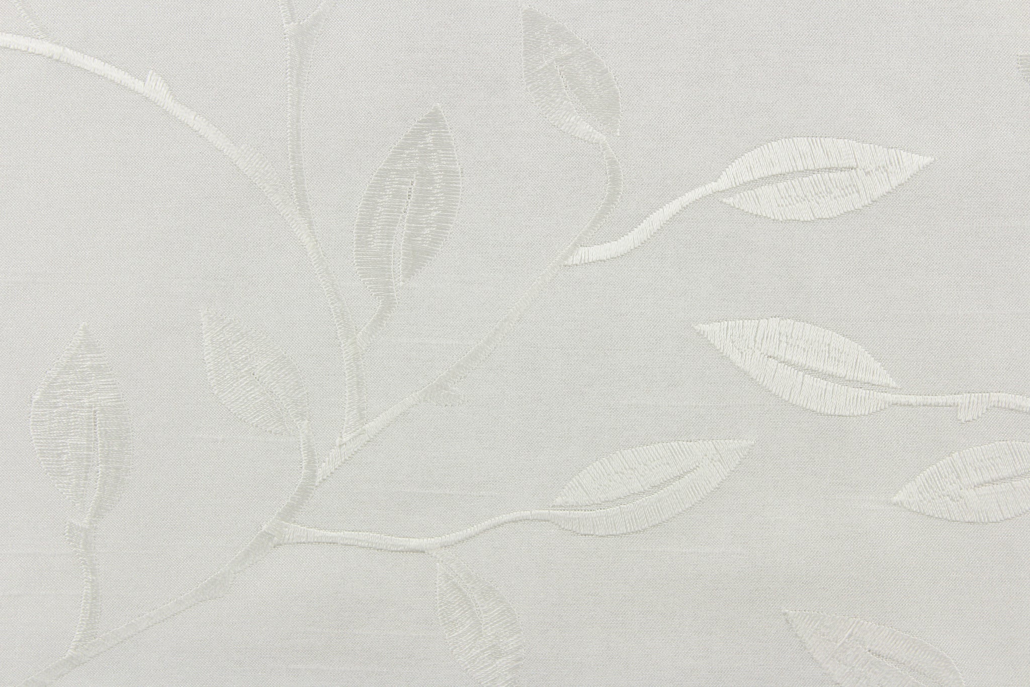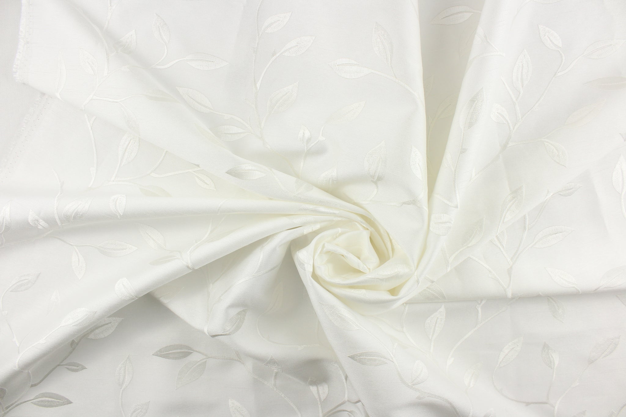 DESCRIPTION: This luxurious duotone fabric features embroidered foliage on a silky white background. Uses include drapery, pillows, light upholstery, table runners, bedding, headboards, home decor and apparel. We offer this fabric in several different colors.
