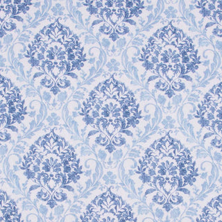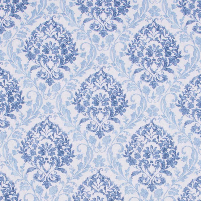 DESCRIPTION: A calming and stylish damask floral design by Carole Fabric. The color registration shows a light blue and dark blue on an off-white background.