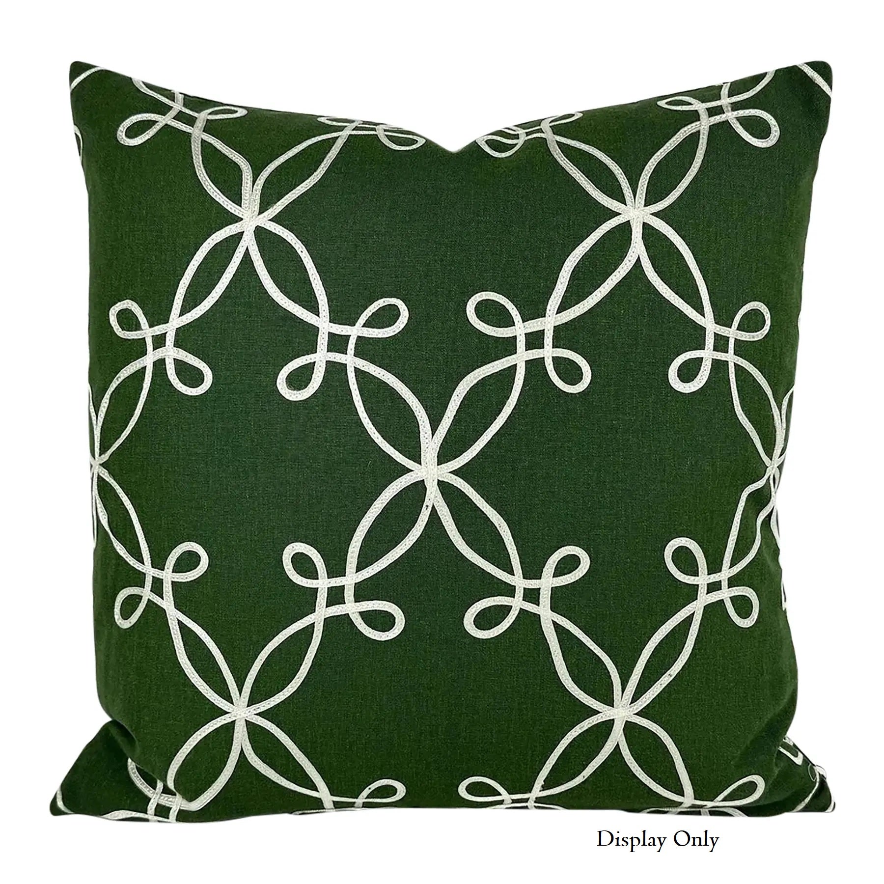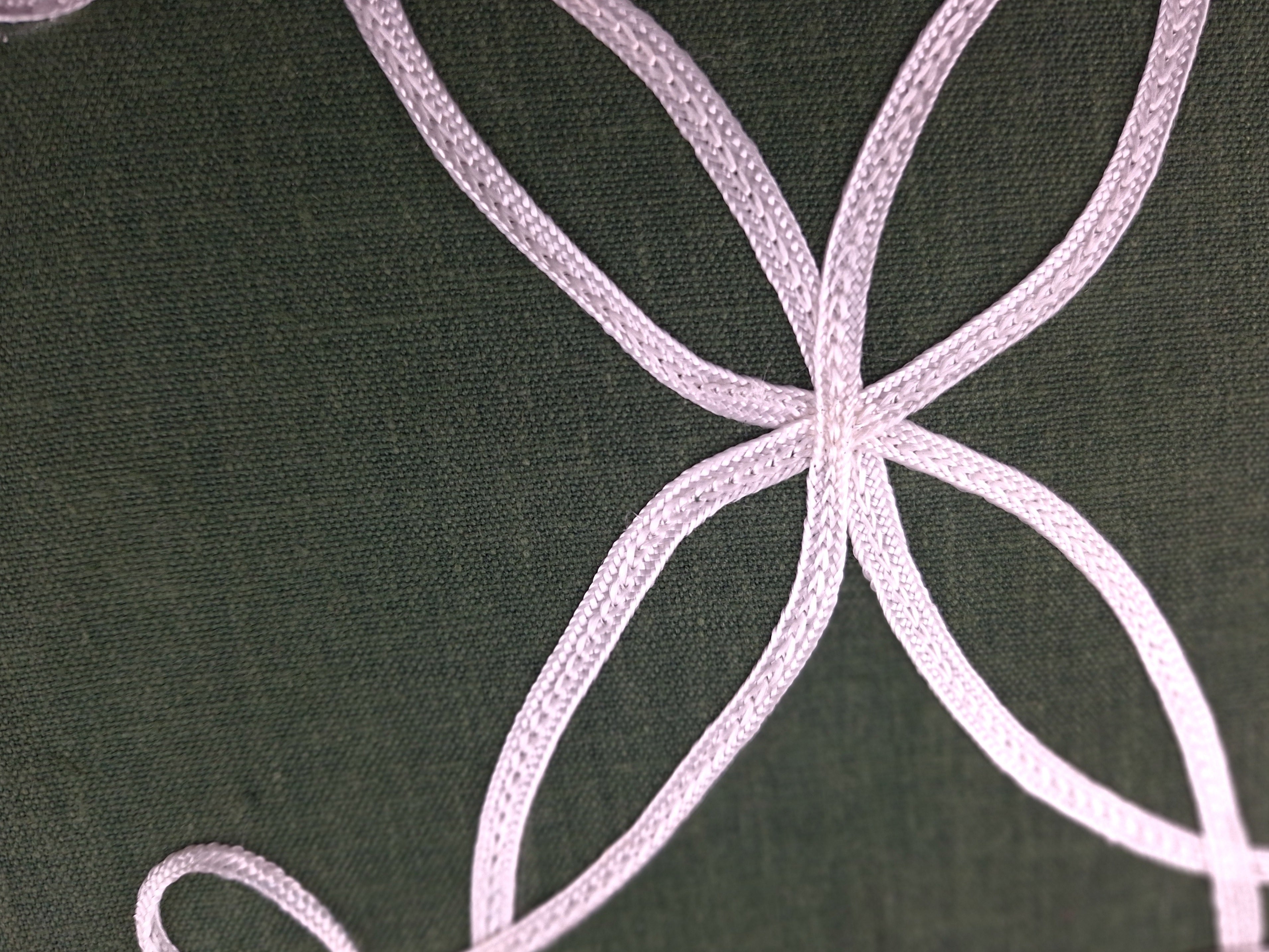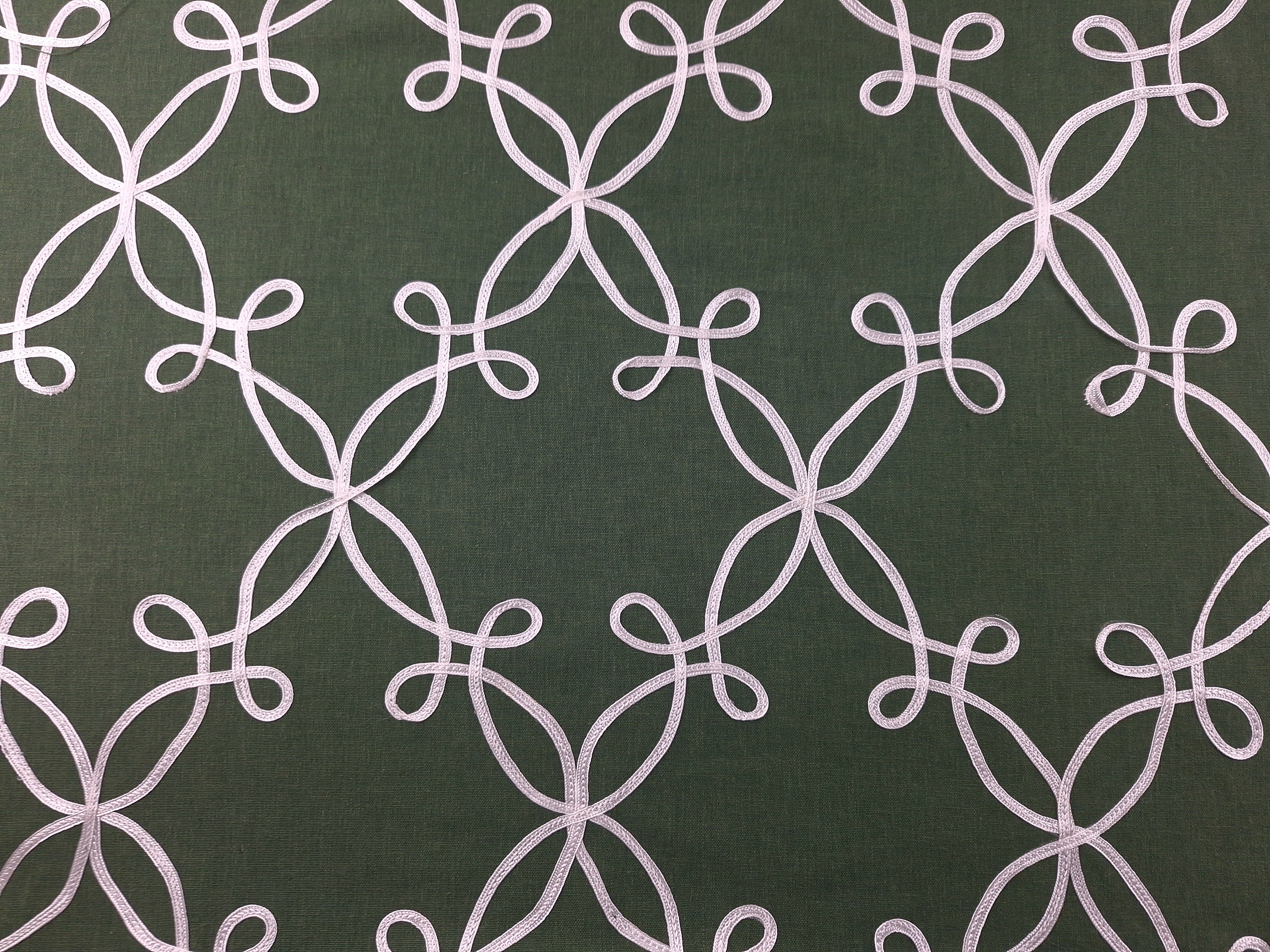 DESCRIPTION: Carole Fabric Precise Applique Fabric in True Green is a fabric where white applique has been applied in a scroll design on a dark green fabric.