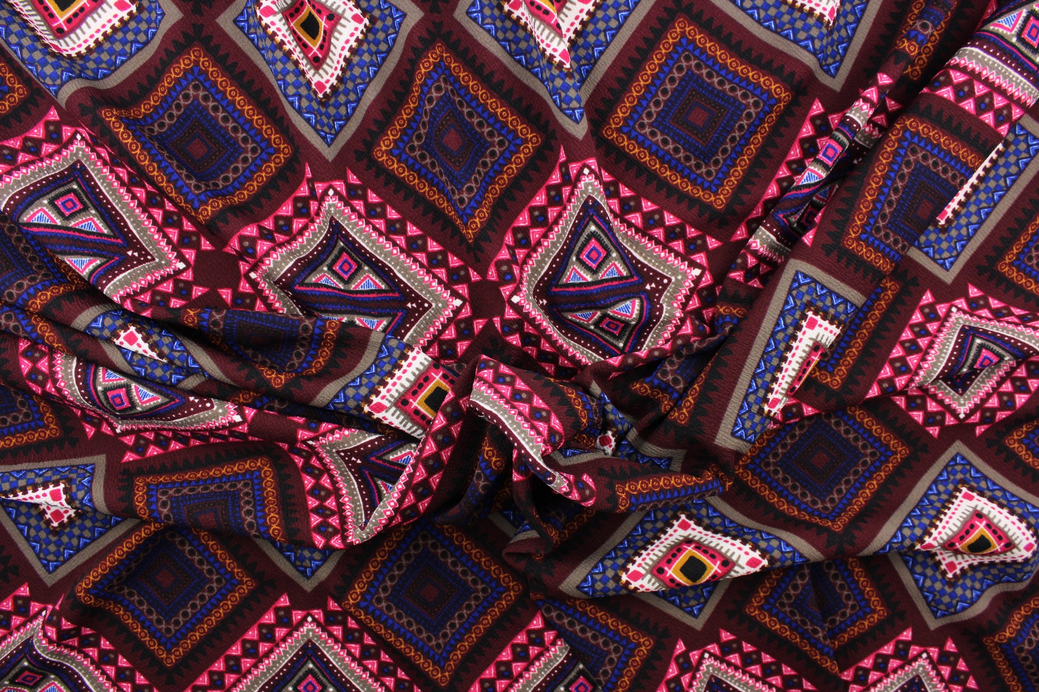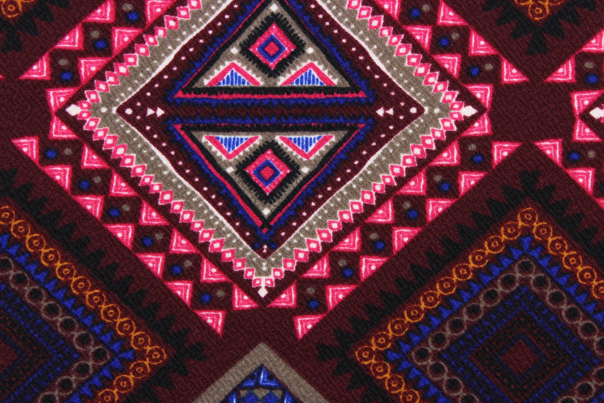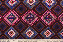 DESCRIPTION: This 2 way lycra blend fabric features a Aztec design in hot pink, black, taupe, royal blue, gray, golden tan, white and burgundy. Use this for apparel, etc. We offer serval lycra fabrics.