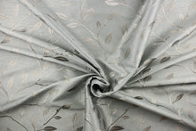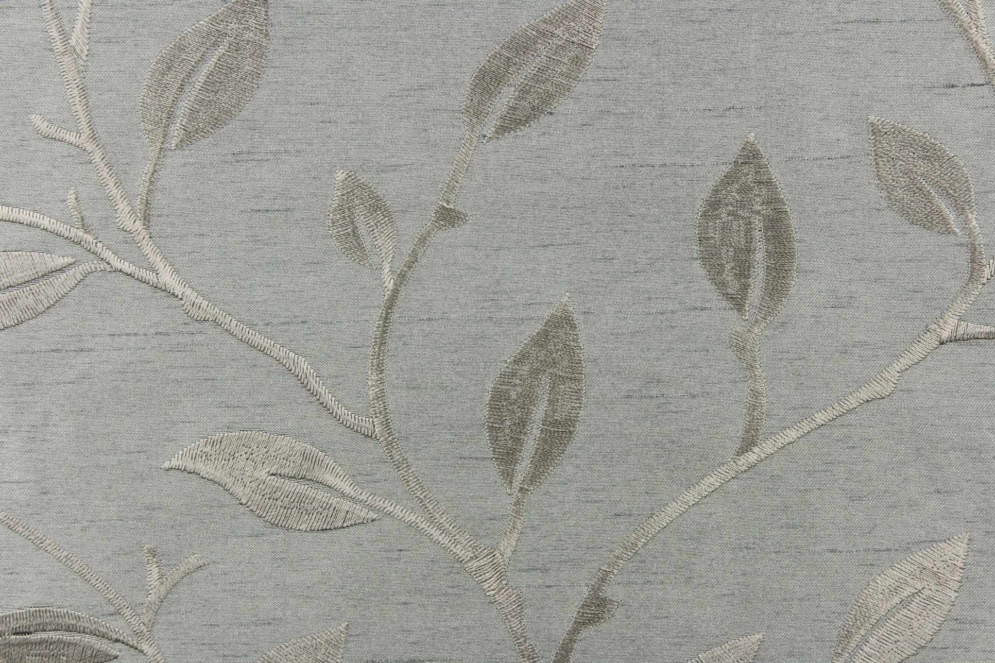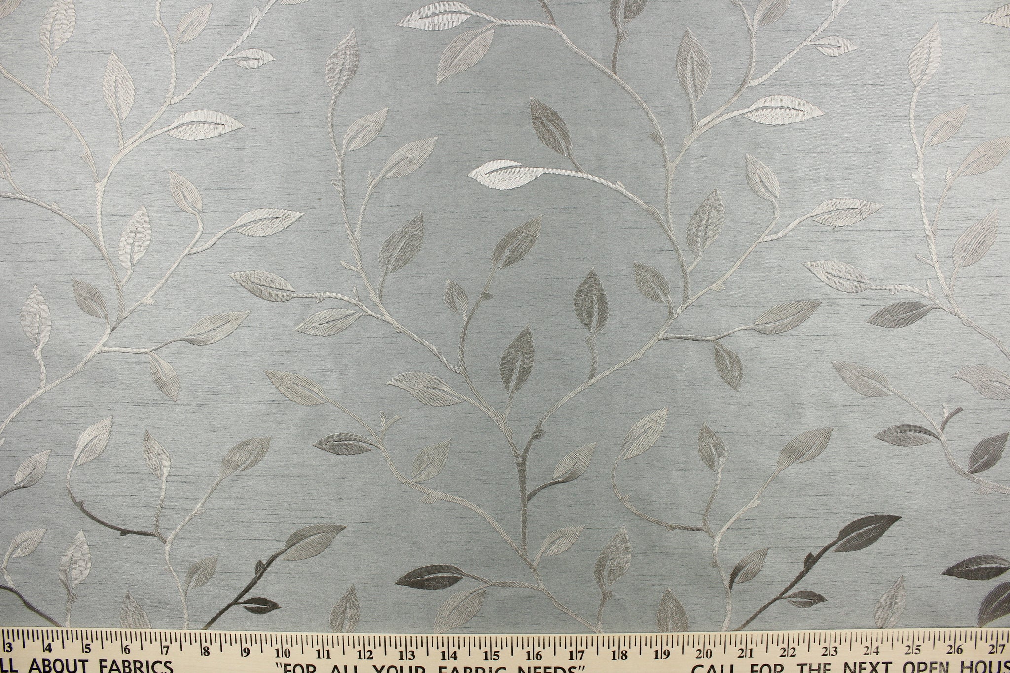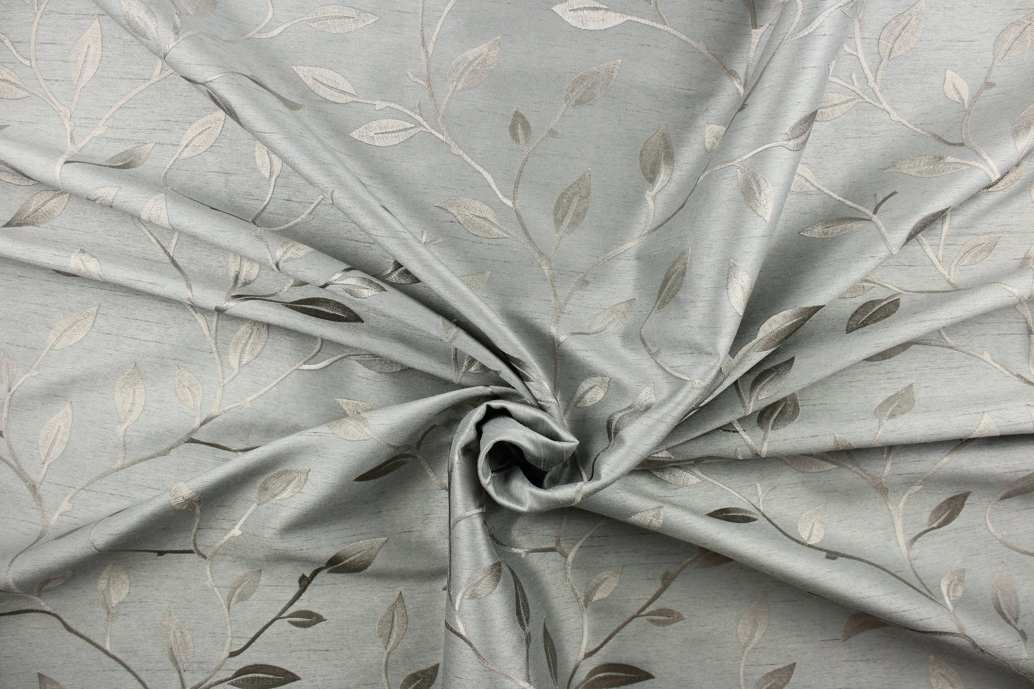 DESCRIPTION: This luxurious duotone fabric features embroidered foliage on a silky slate gray background. Uses include drapery, pillows, light upholstery, table runners, bedding, headboards, home decor and apparel. We offer this fabric in several different colors.