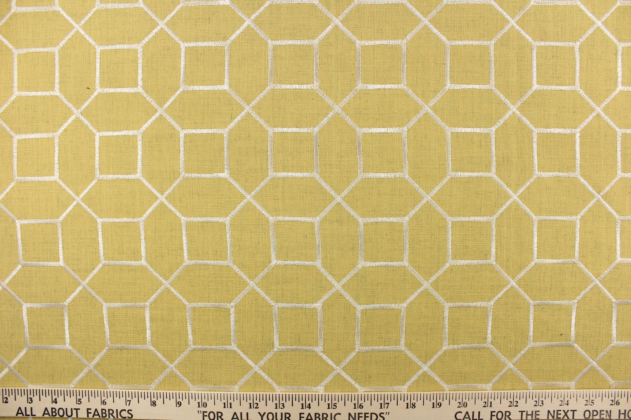 DESCRIPTION: This embroidered fabric features a geometric design in white against a mustard yellow. Use this for drapery, pillows, upholstery, bedding, etc.. The white embroidery has a sheen to it enhancing the design.