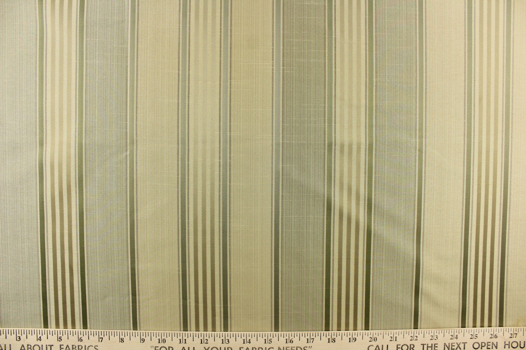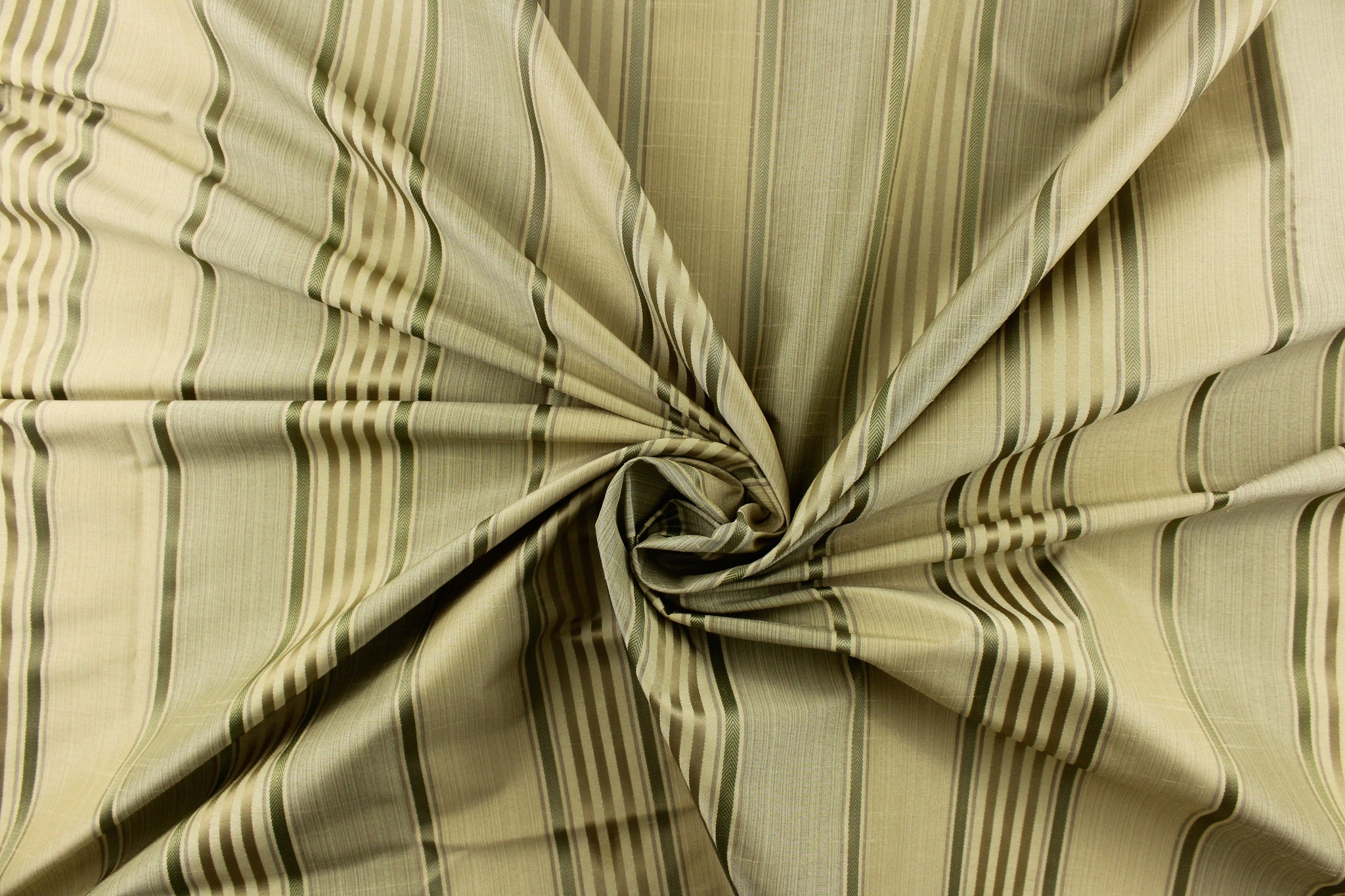 DESCRIPTION: Light weight and formal best portray this yarn dye fabric. Offering  varying  width striped pattern in colors of light green and light khaki or beige along with a slight sheen to enhance the various colors.  This fabric has a  unique look with some stripes woven into the fabric and some stripes printed. It will add a rich bold  appearance to any design. The 100% polyester fabric means it is durable, strong, wrinkle resistant and has a structured but smooth feel. This fabric would compliment any room whether you use it for drapery or an accent chair. It is also perfect for throw pillows, home décor, duvet covers and apparel. The possibilities are endless. We offer this Holt striped pattern  in a wide variety of colors.