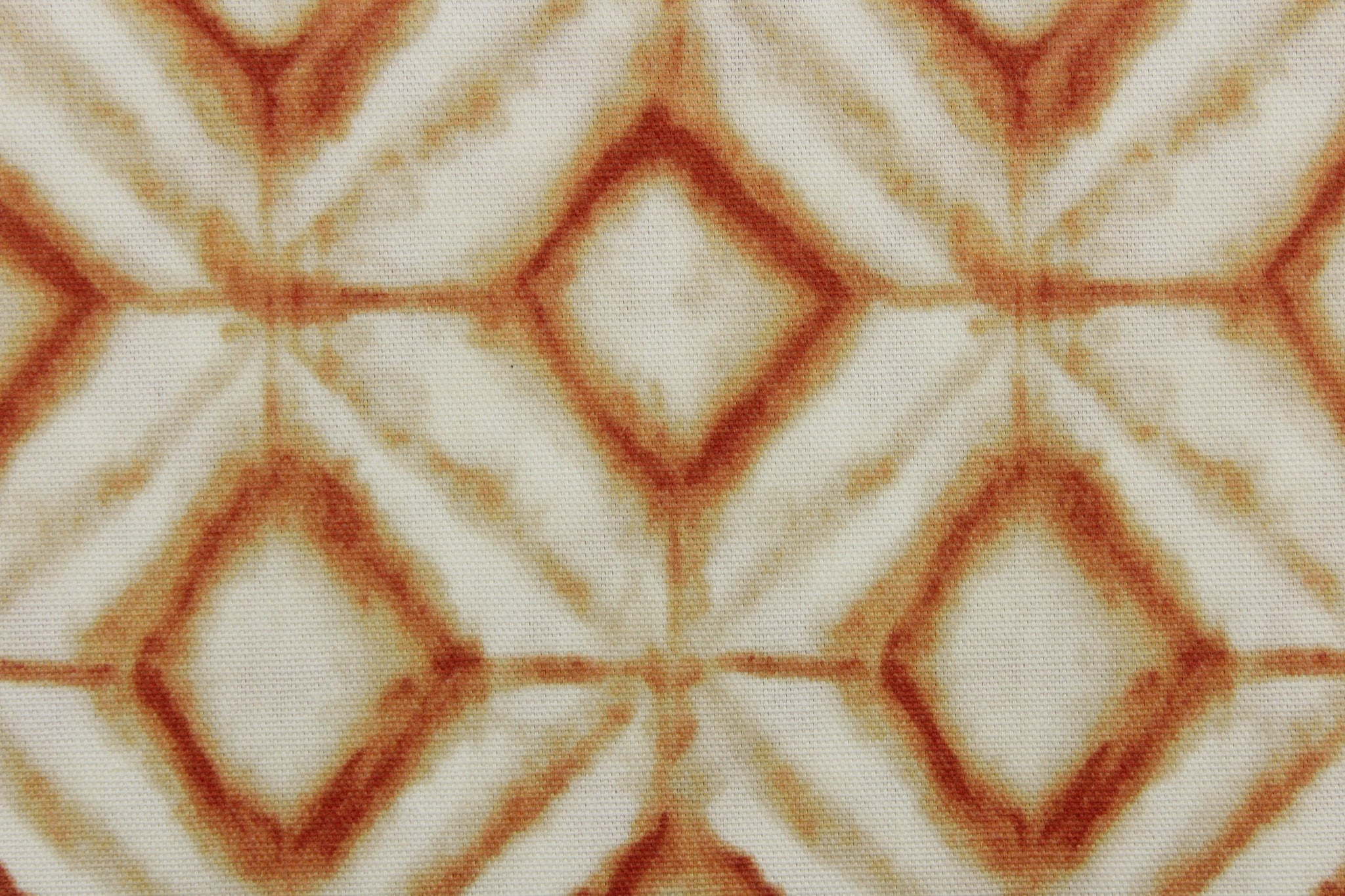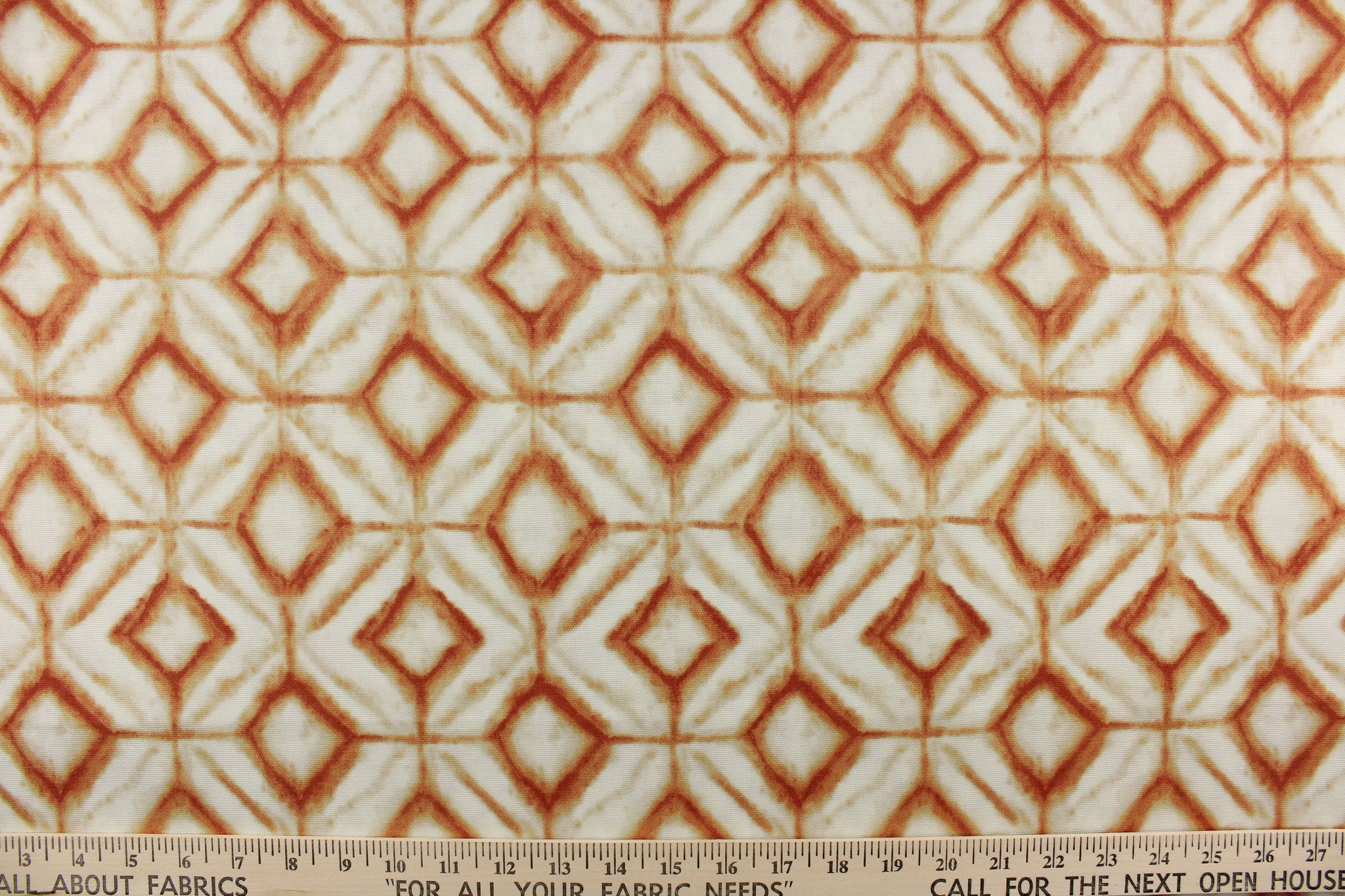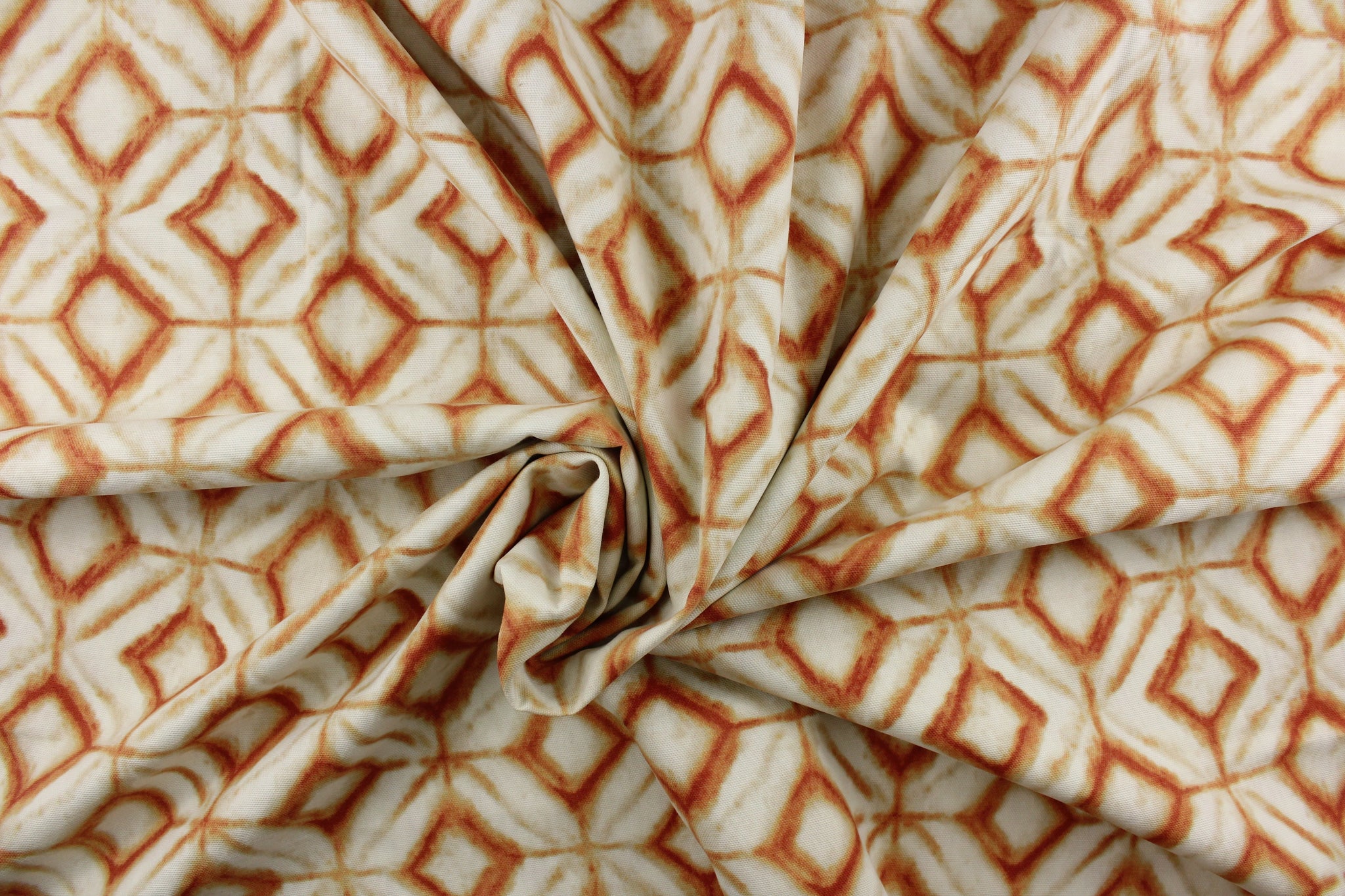 DESCRIPTION: This fabric features a geometric design of diamonds in shades of orange with light khaki shading on a off white background. Use this for drapery, pillows, totes, light upholstery, etc. This fabric has a soft workable feel yet is stable and durable. We offer this design in several different colors.