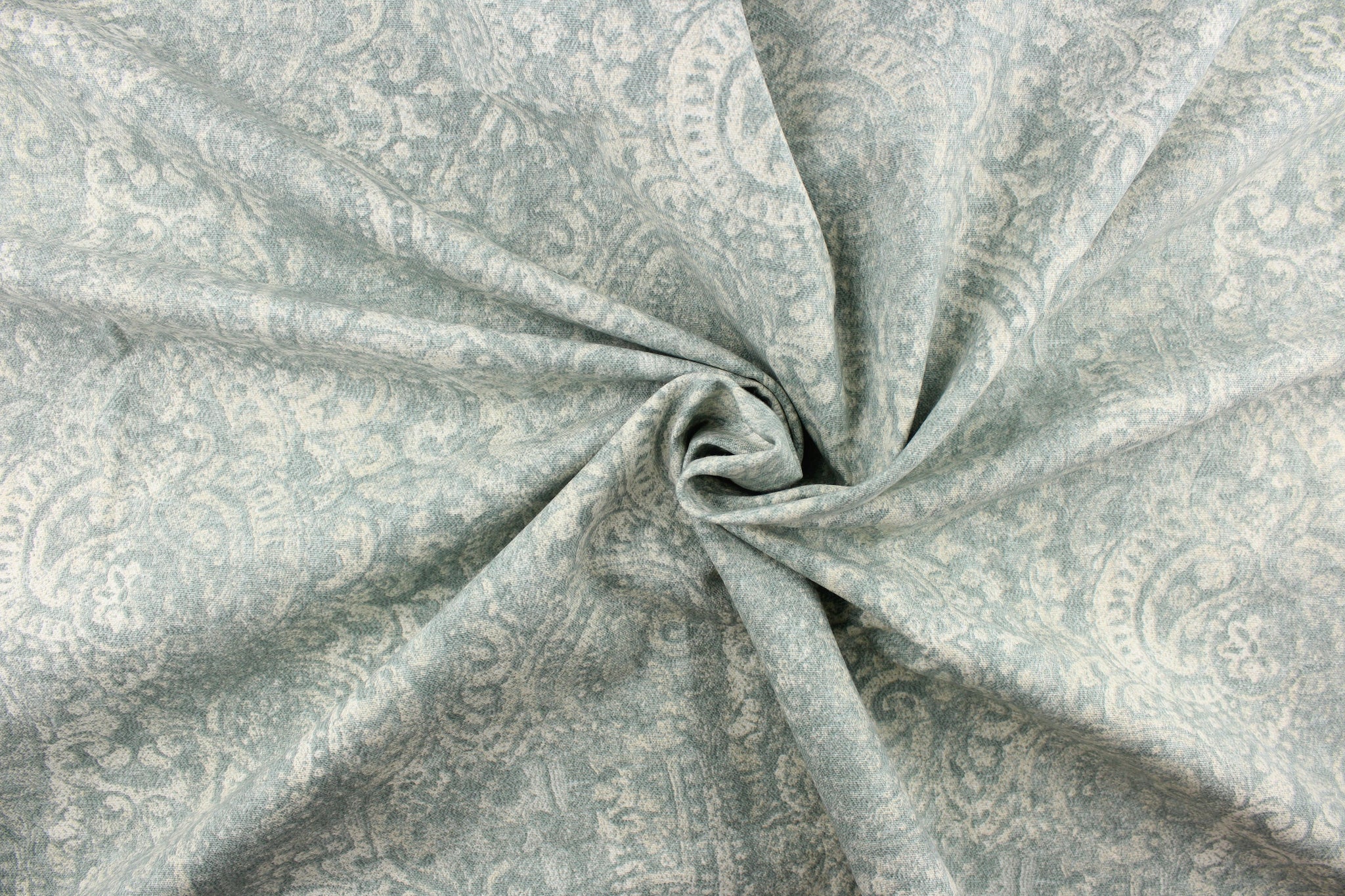 DESCRIPTION: This beautiful fabric features a damask design in a blue gray with hints of white. It also features a distress that enhances the design. Use this for drapery, upholstery, pillows, etc. We offer this design in several different colors.