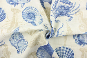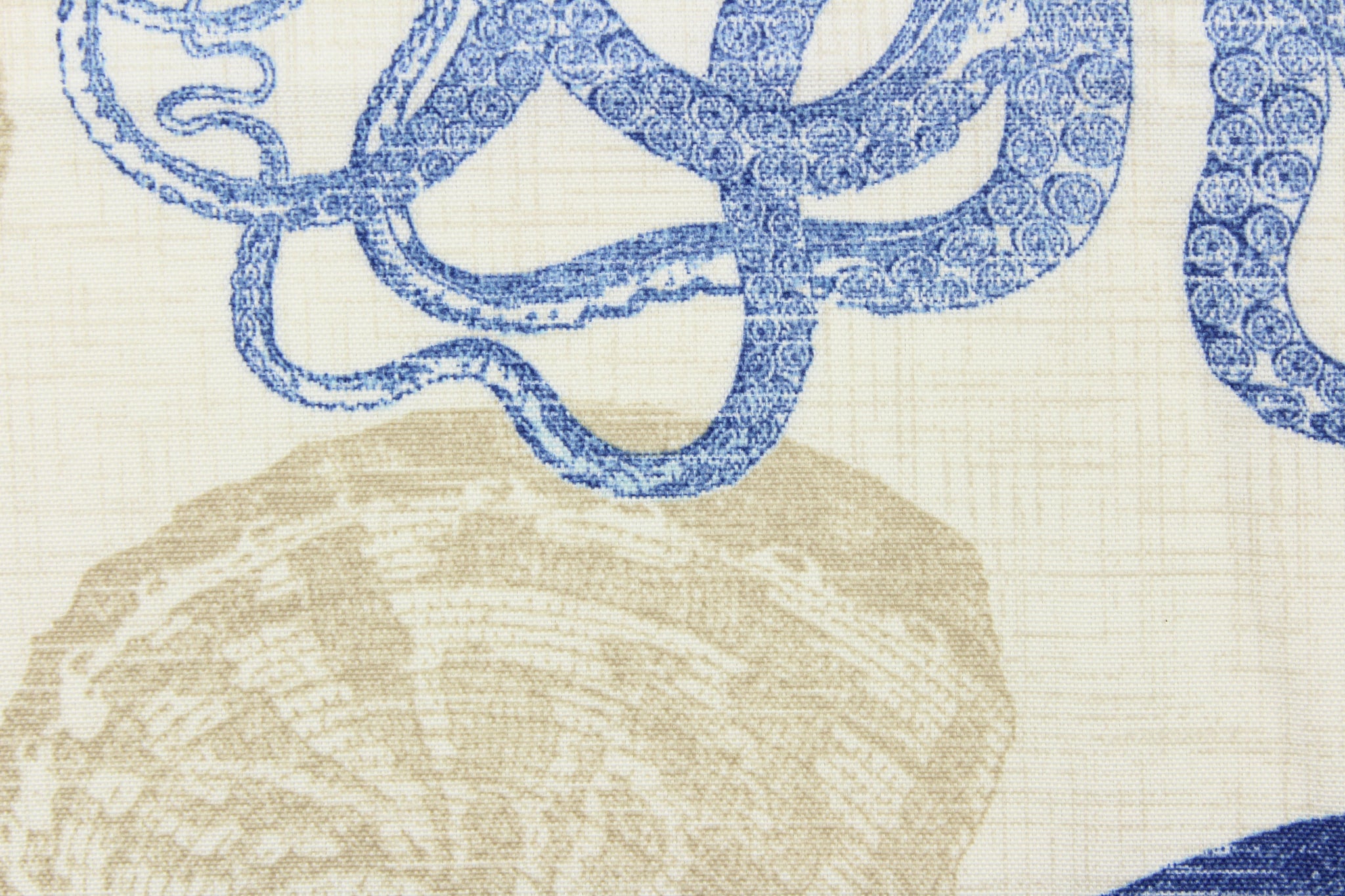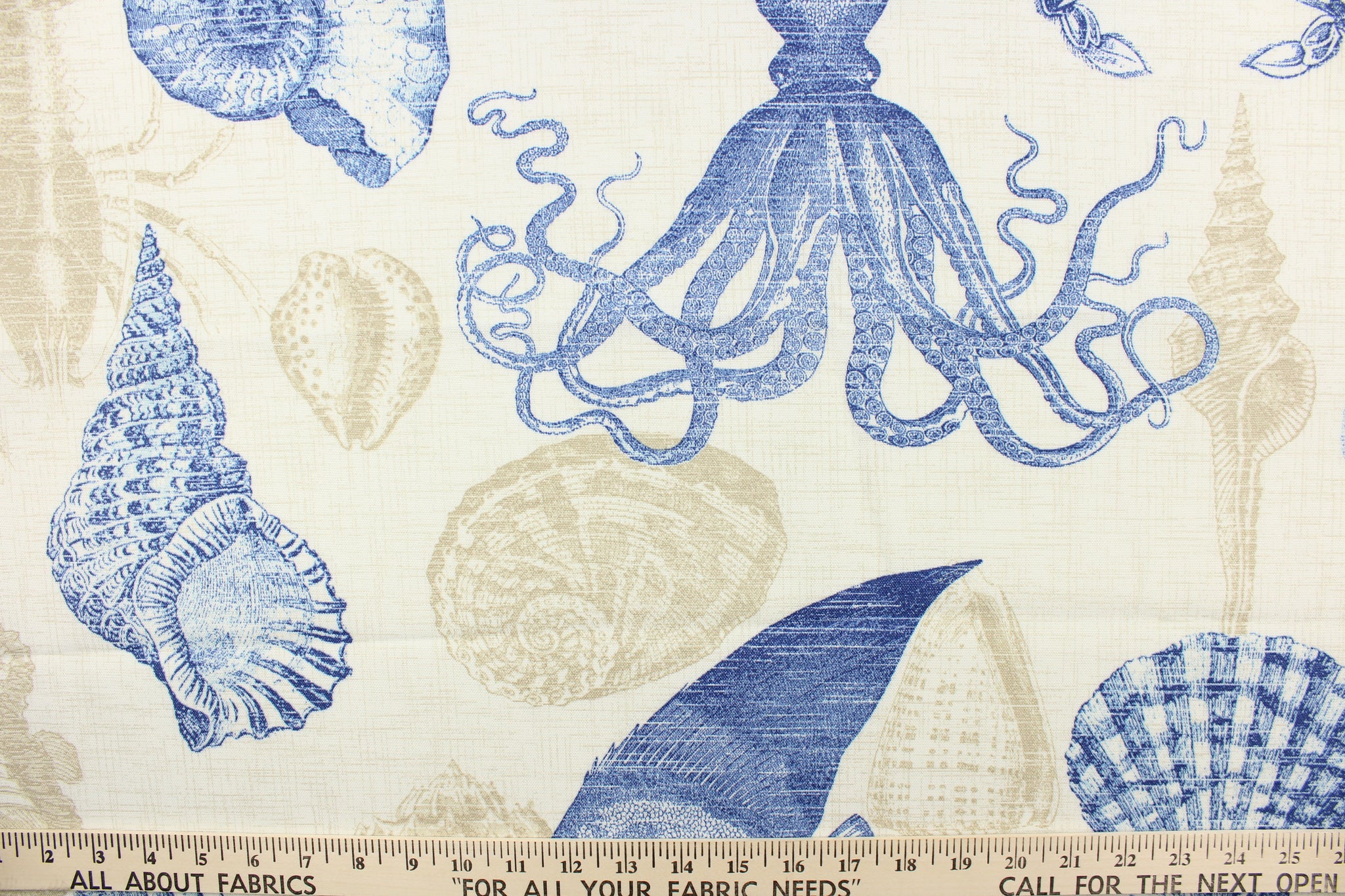 DESCRIPTION: This nautical theme fabric features sea life in navy blue and beige on a sand background. It has a slightly stiff feel but easy to work with. It is able to withstand up to 500 hours of sunlight, resists stains and is water resistant. Perfect for porches, patios, and poolside. Uses include toss pillows, cushions, upholstery, tote bags and more. With this durable fabric the ocean will never feel too far away.