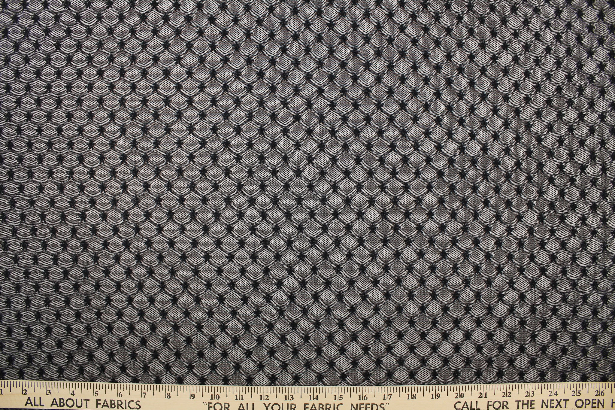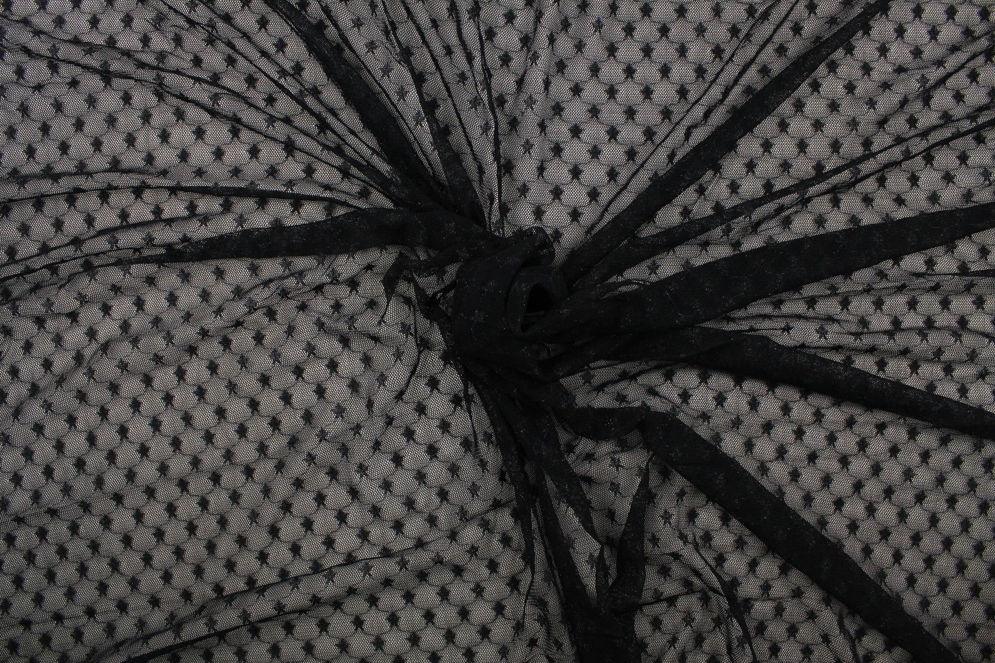 DESCRIPTION: This fabric is a sheer, black stretch lace with a repeating pattern. The pattern consists of small, solid black stars that are each enclosed within a hexagonal, net-like mesh. The fabric itself is strong but sheer, making it suitable for applications like sleeves or upper body areas on leotards.