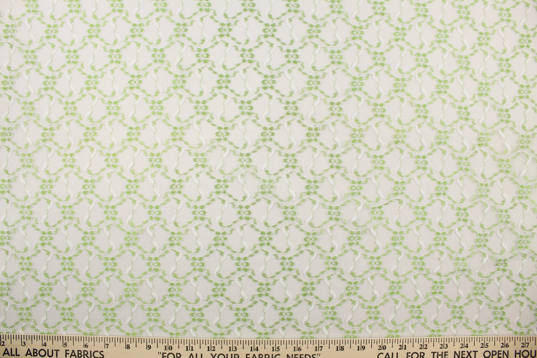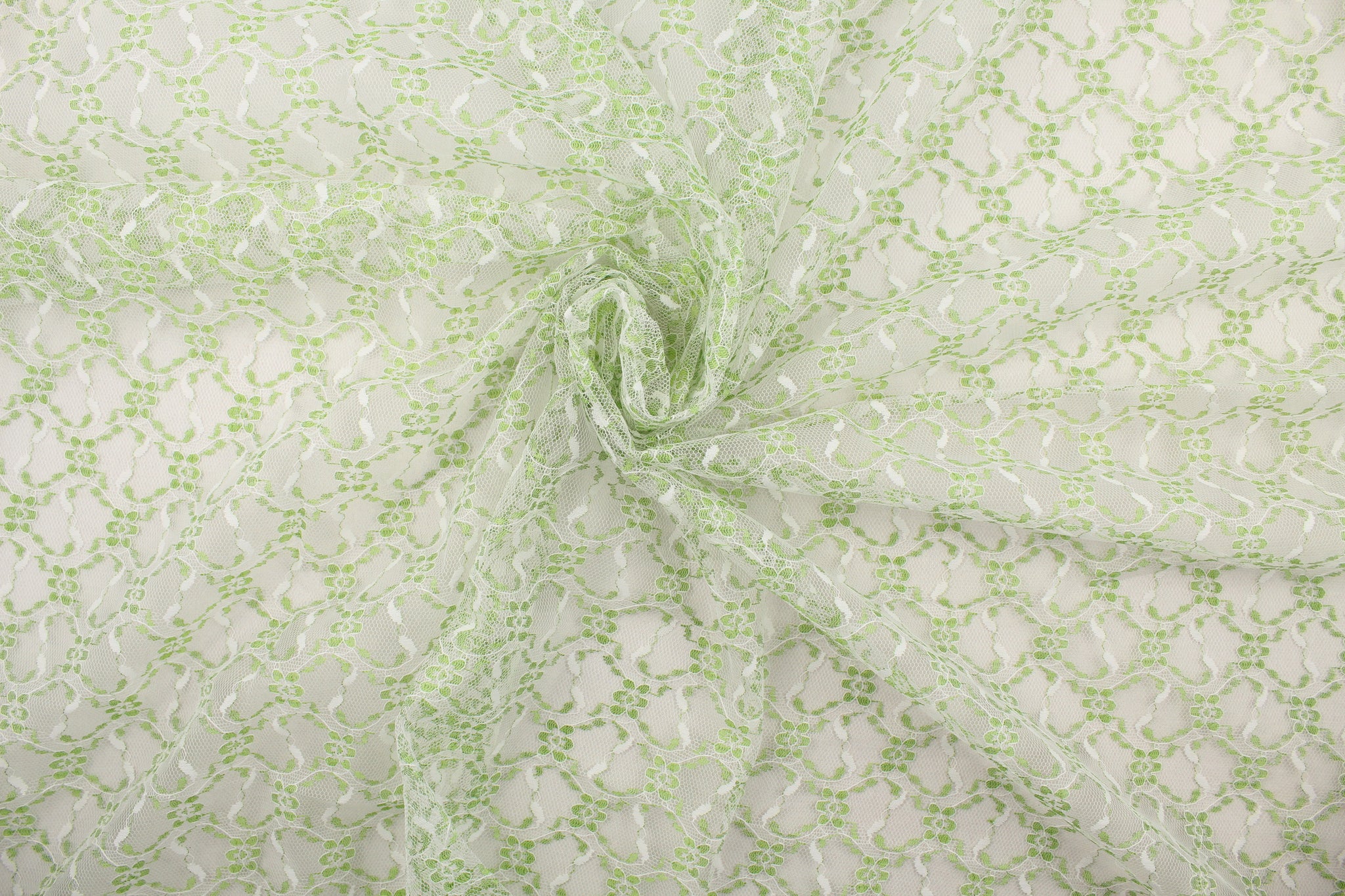 DESCRIPTION: This lace features a woven floral design in green and white . Use this for apparel, home décor, etc. We offer a wide variety of lace fabric.