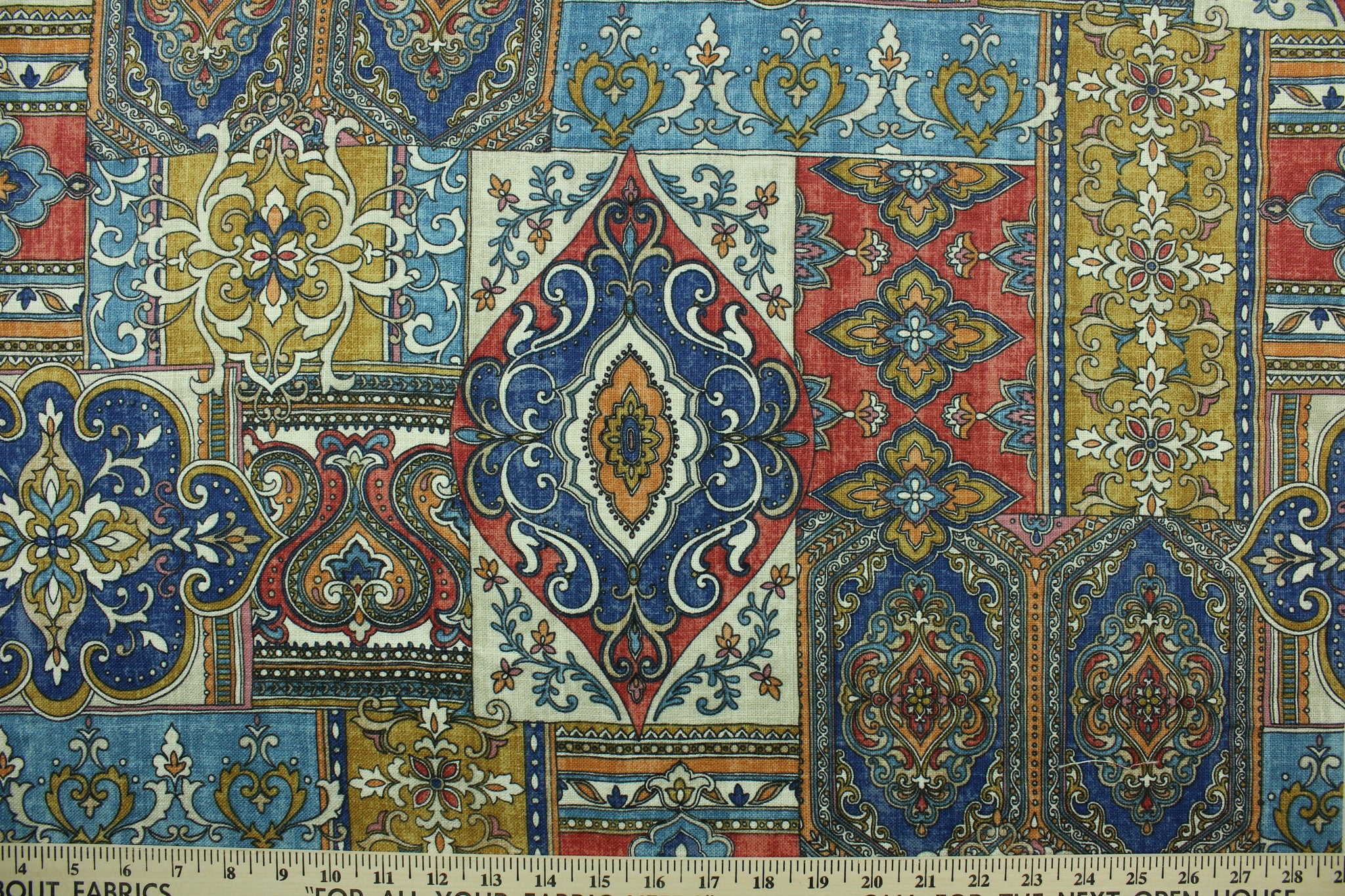 DESCRIPTION: This fabric features a mix design in royal blue, orange, pale beige, golden tan, black, blue, and washout red. Use this for drapery, pillows, bedding, upholstery, etc.