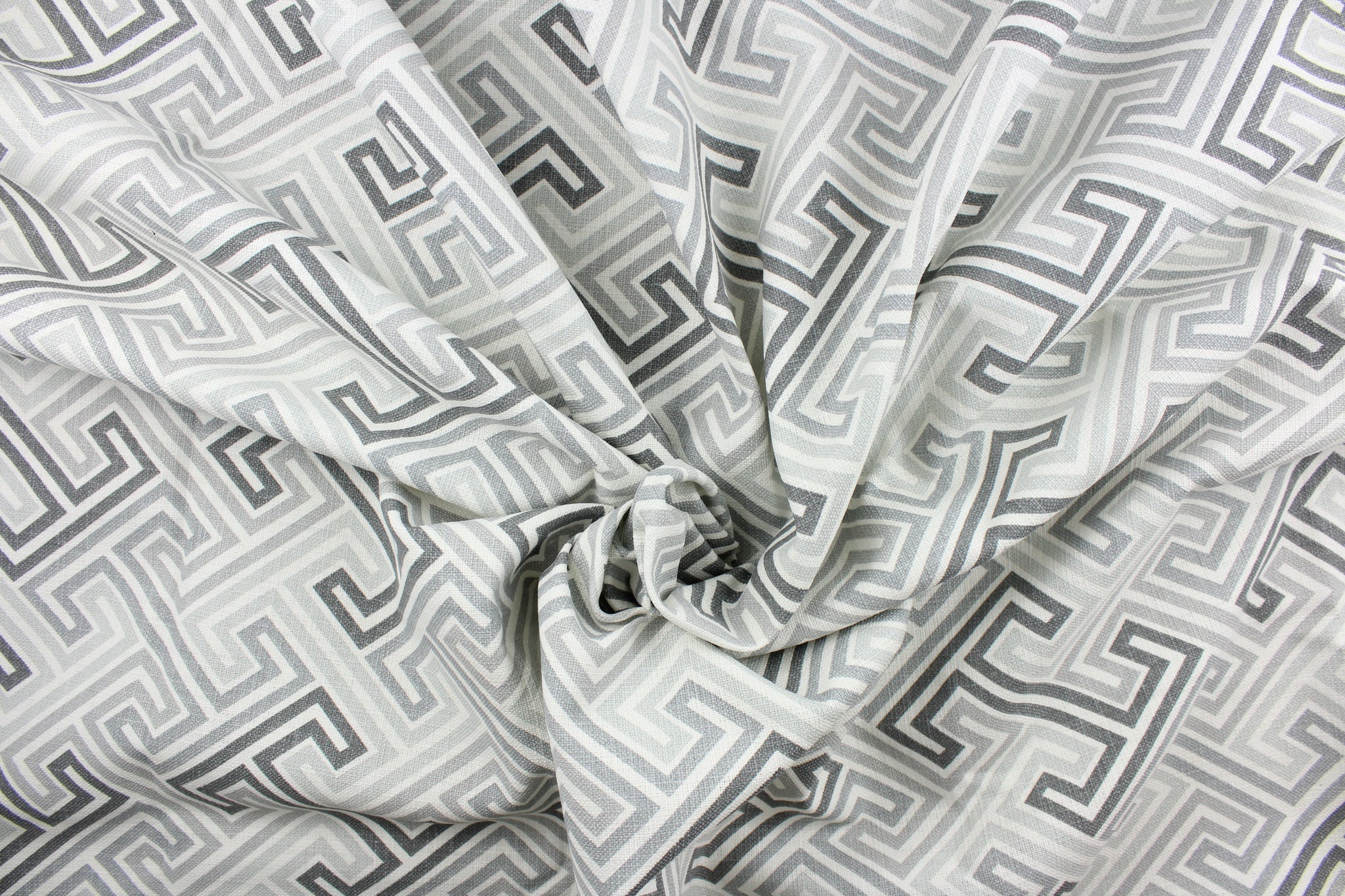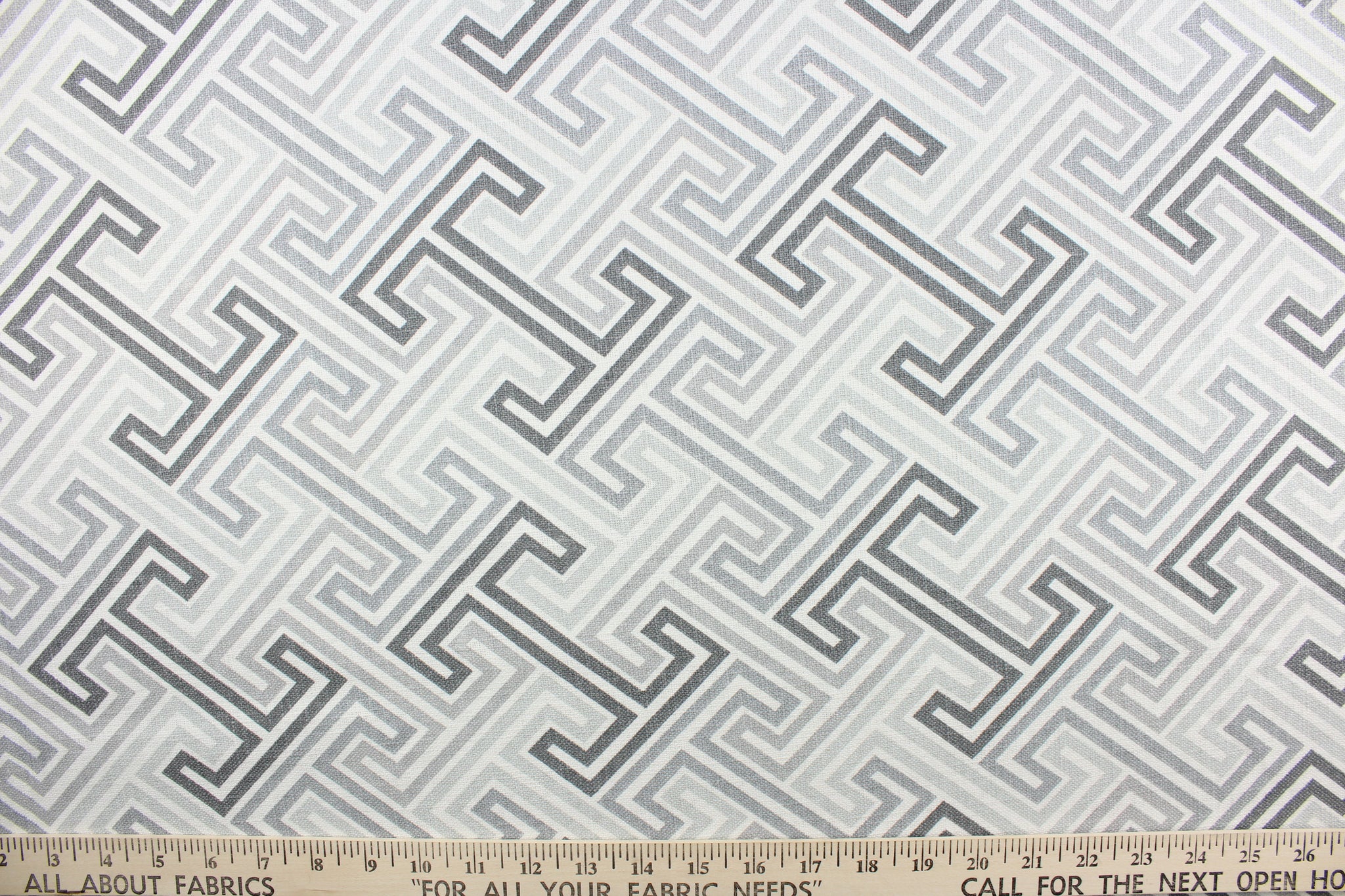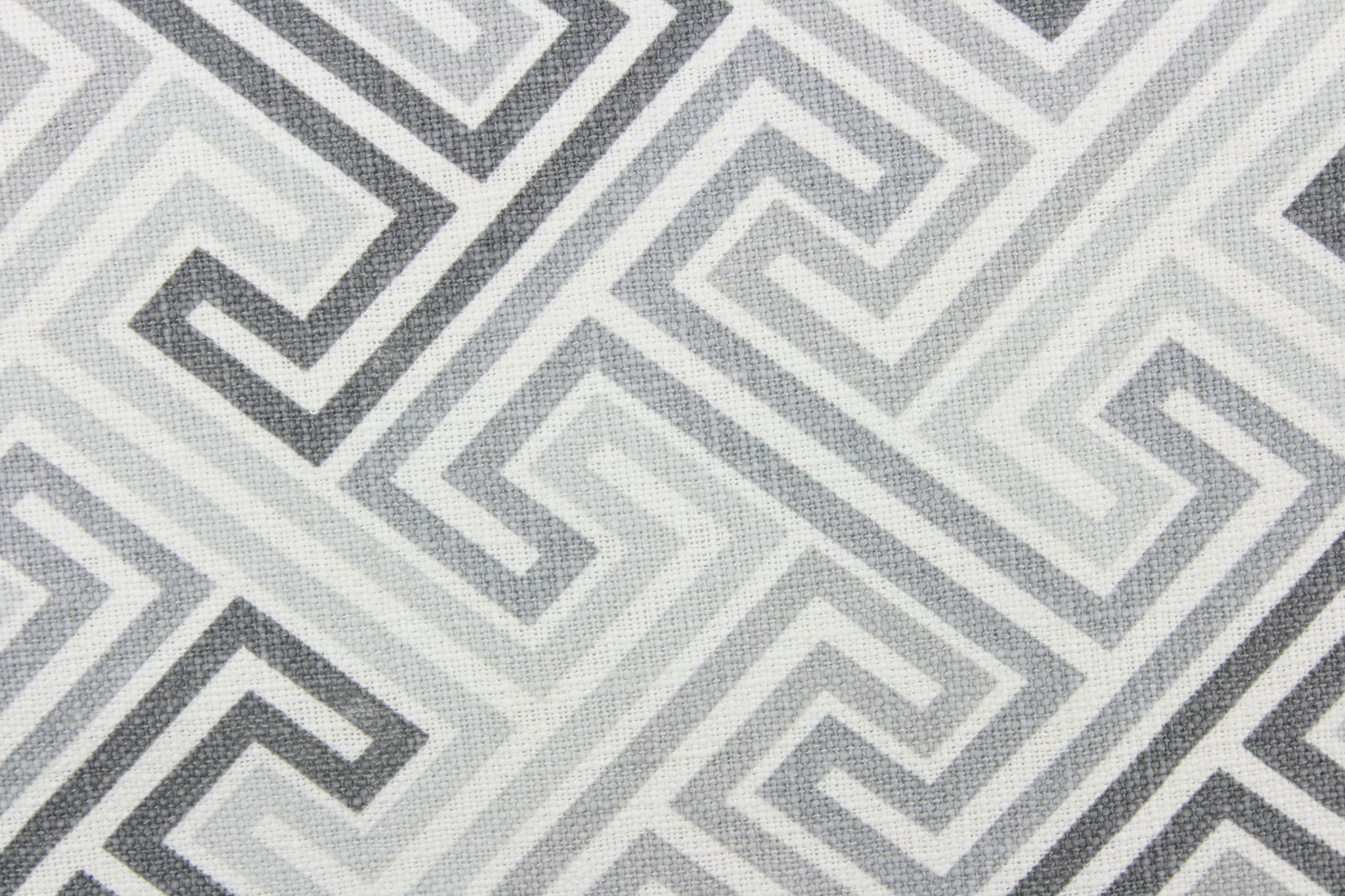 DESCRIPTION: This fabric features a geometric design in varying gray tones and white. Use this for pillows, drapery, handbags, light upholstery, etc. It has a durability rating of 50000 double rubs.