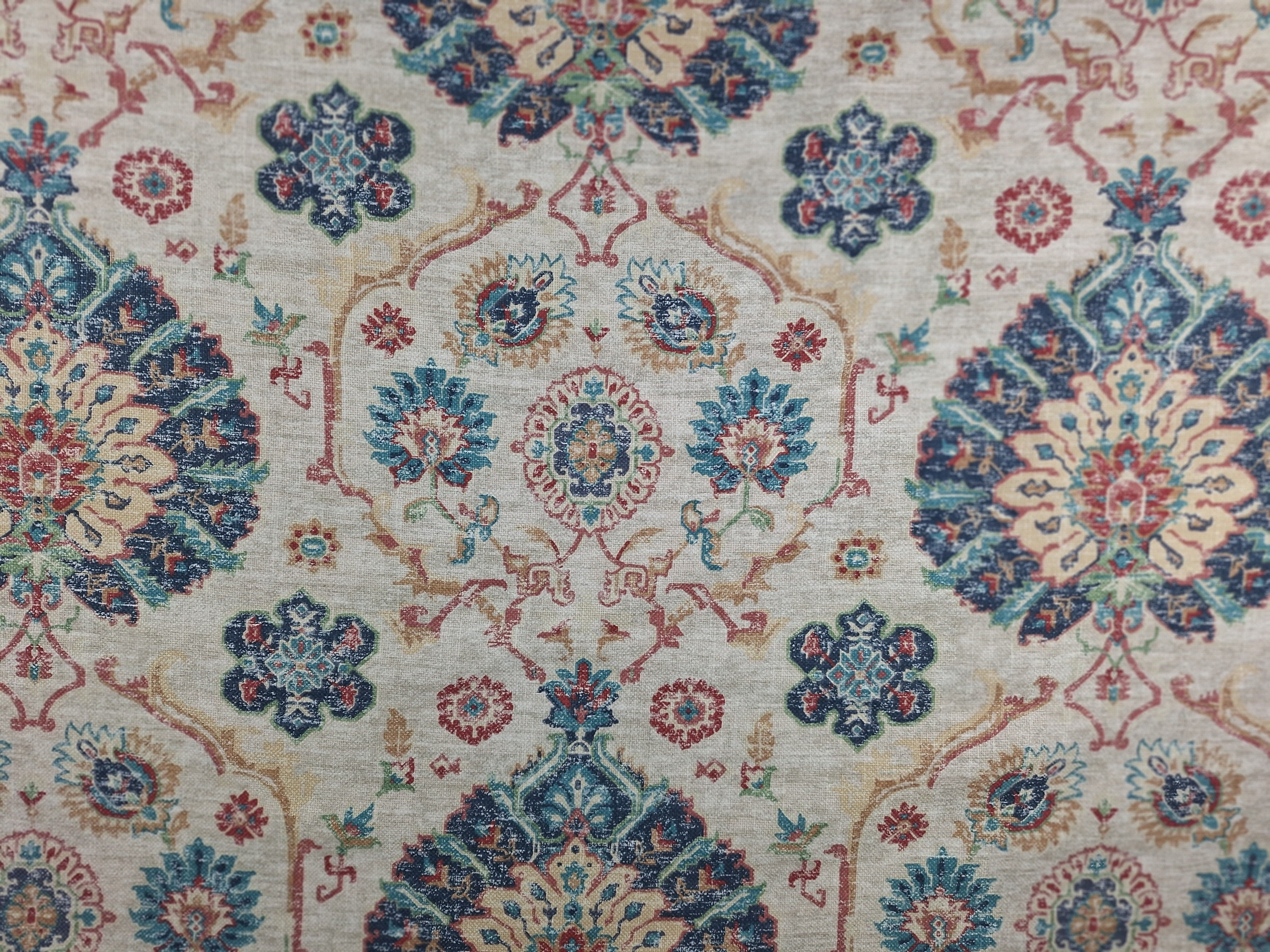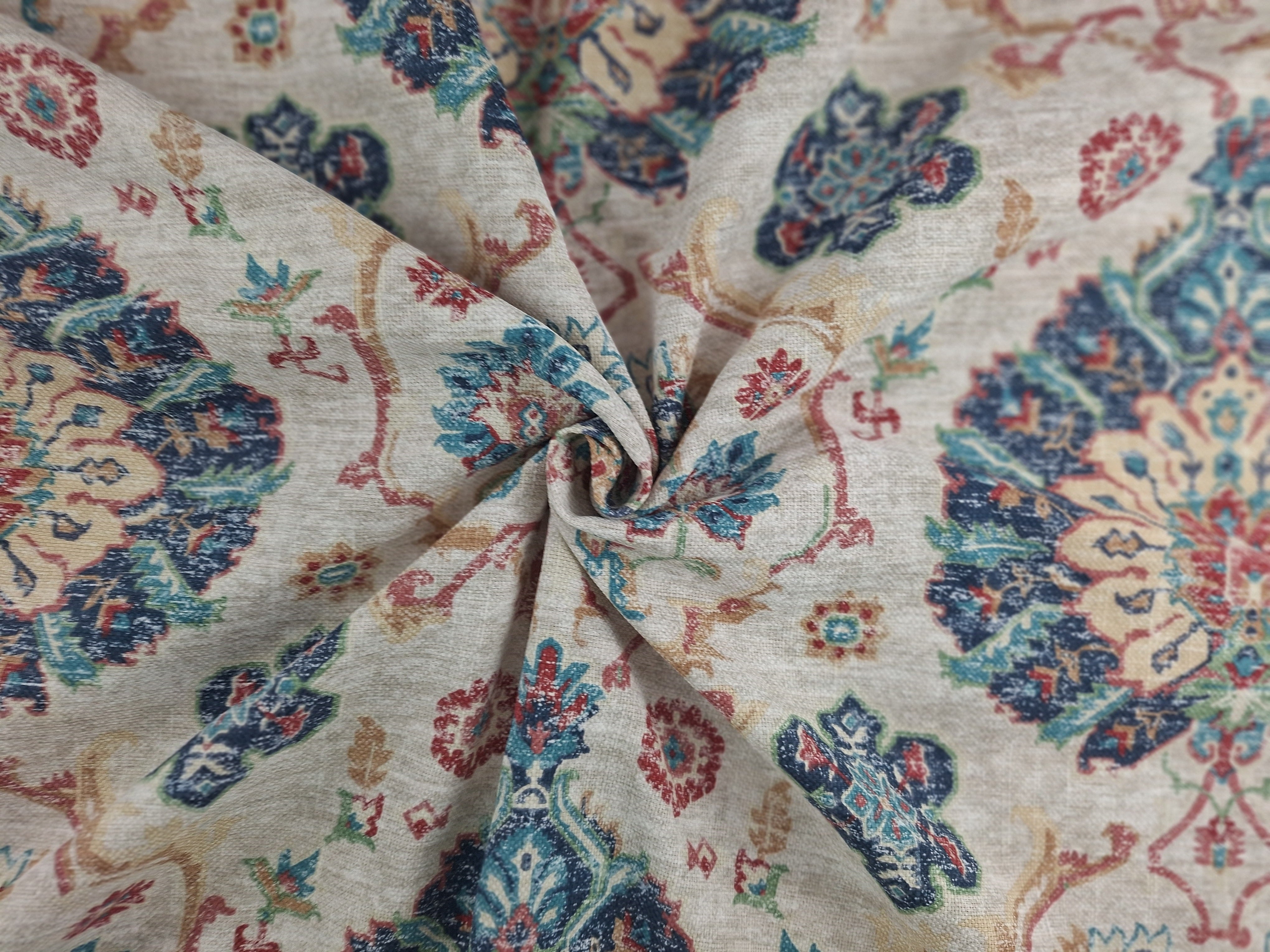 DESCRIPTION: Covington Fabrics Bashir Fabric in 100 Multi is a decorative fabric featuring an antique Turkmen Bashir style rug print. This design is updated with a washed linen effect background and intricate motifs in the colors navy, aquamarine, coral, cream, and red.