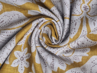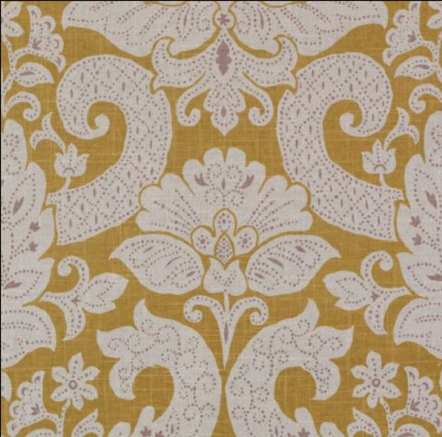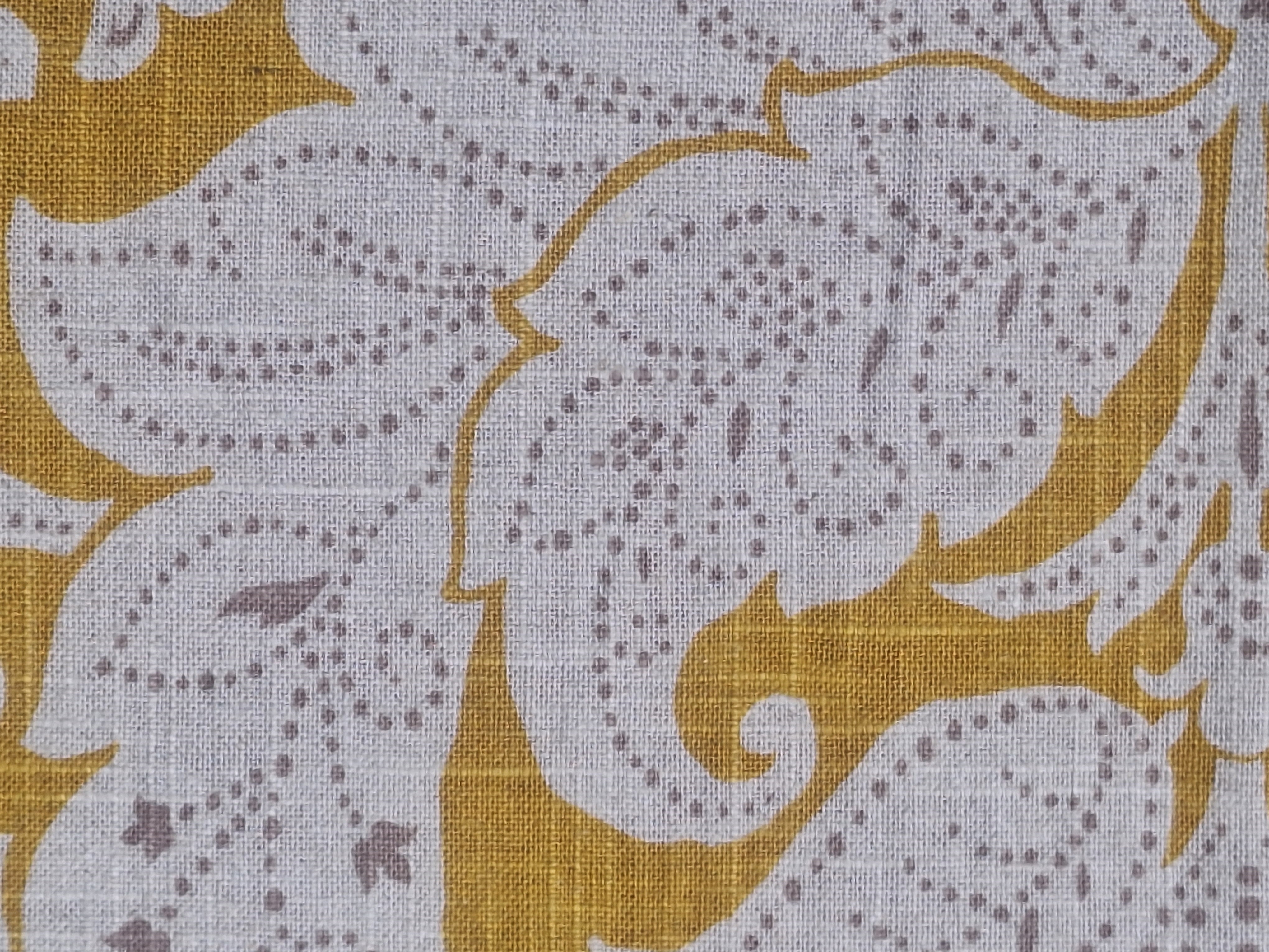 DESCRIPTION: This damask print fabric on fine linen fabric. Rayon is added to linen fabric to create a versatile fabric that combines the strength of linen with the drape of rayon. Linen-rayon blends are less likely to wrinkle than pure linen and the rayon makes the fabric softer. The color registration shows taupe, cream on a yellow/gold background. Fabric has been treated to be stain and soil resistant.