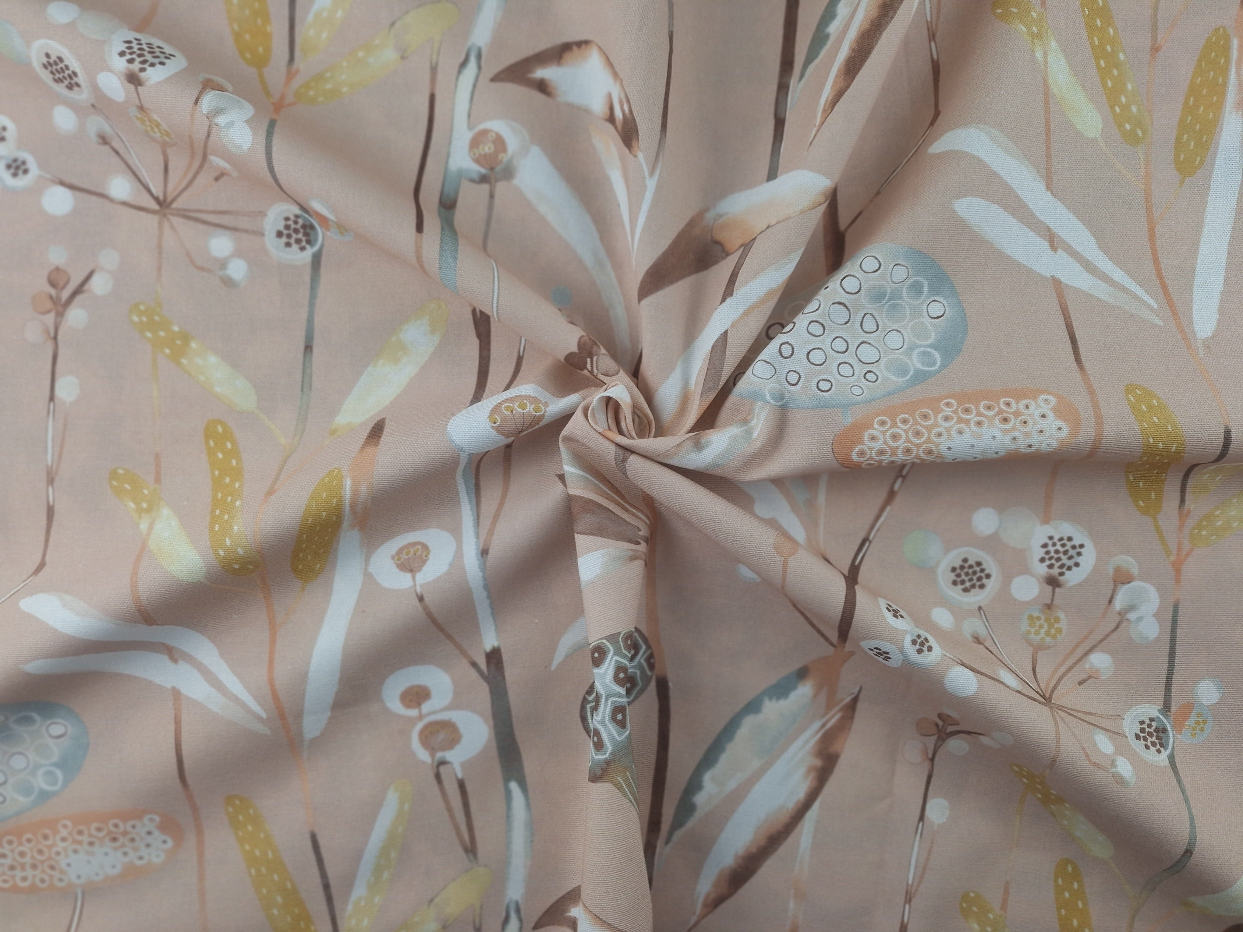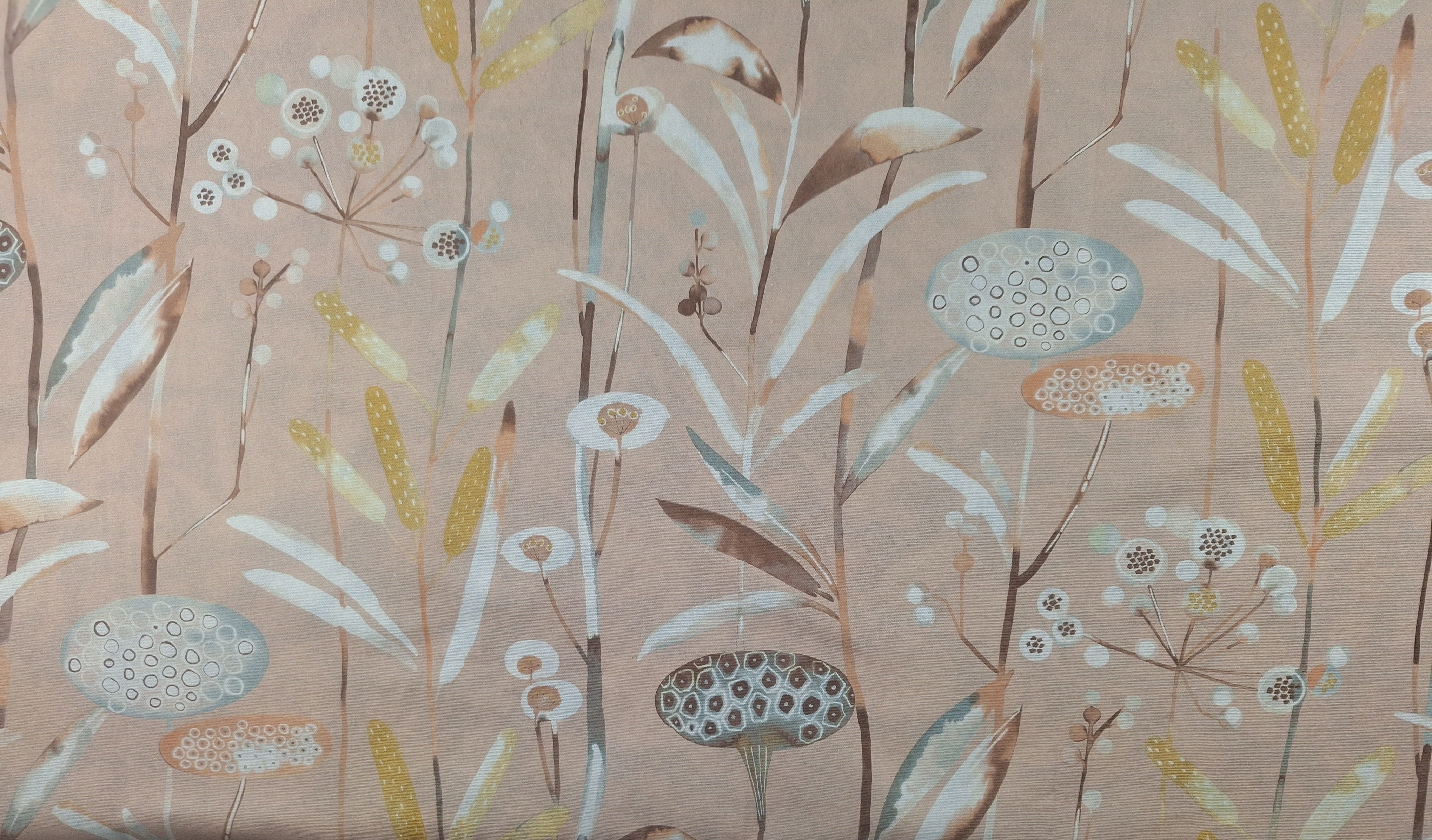 DESCRIPTION: Edinburgh Weavers' Katniss is beautiful modern English botanical design. Discover the exquisite quality of this fabric, a true testament to craftsmanship and timeless design. The color registration shows the colors peach, sky blue, dijon, white, brown, tan and teal on a pink colored background fabric. and tan on a dark teal background fabric.