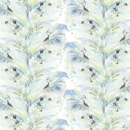 DESCRIPTION: Free Spirit Fabrics Must Have Flowers Quilting Fabric in Celadon by Shell Rummel features a delicate, watercolor-style floral and botanical pattern. It depicts various leaves and abstract floral elements in soft, flowing lines, evoking a sense of tranquility and natural elegance.