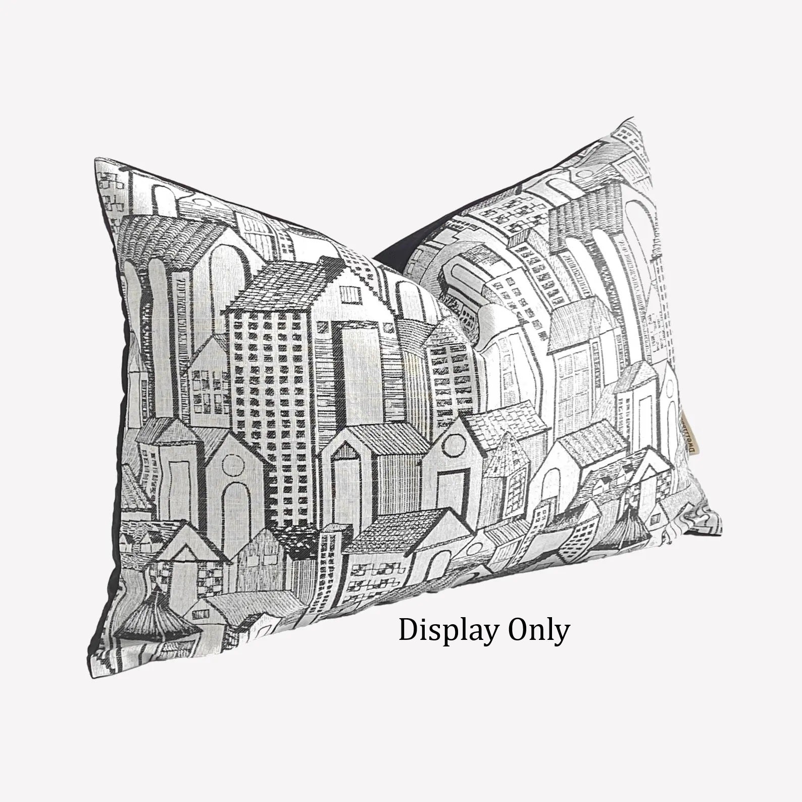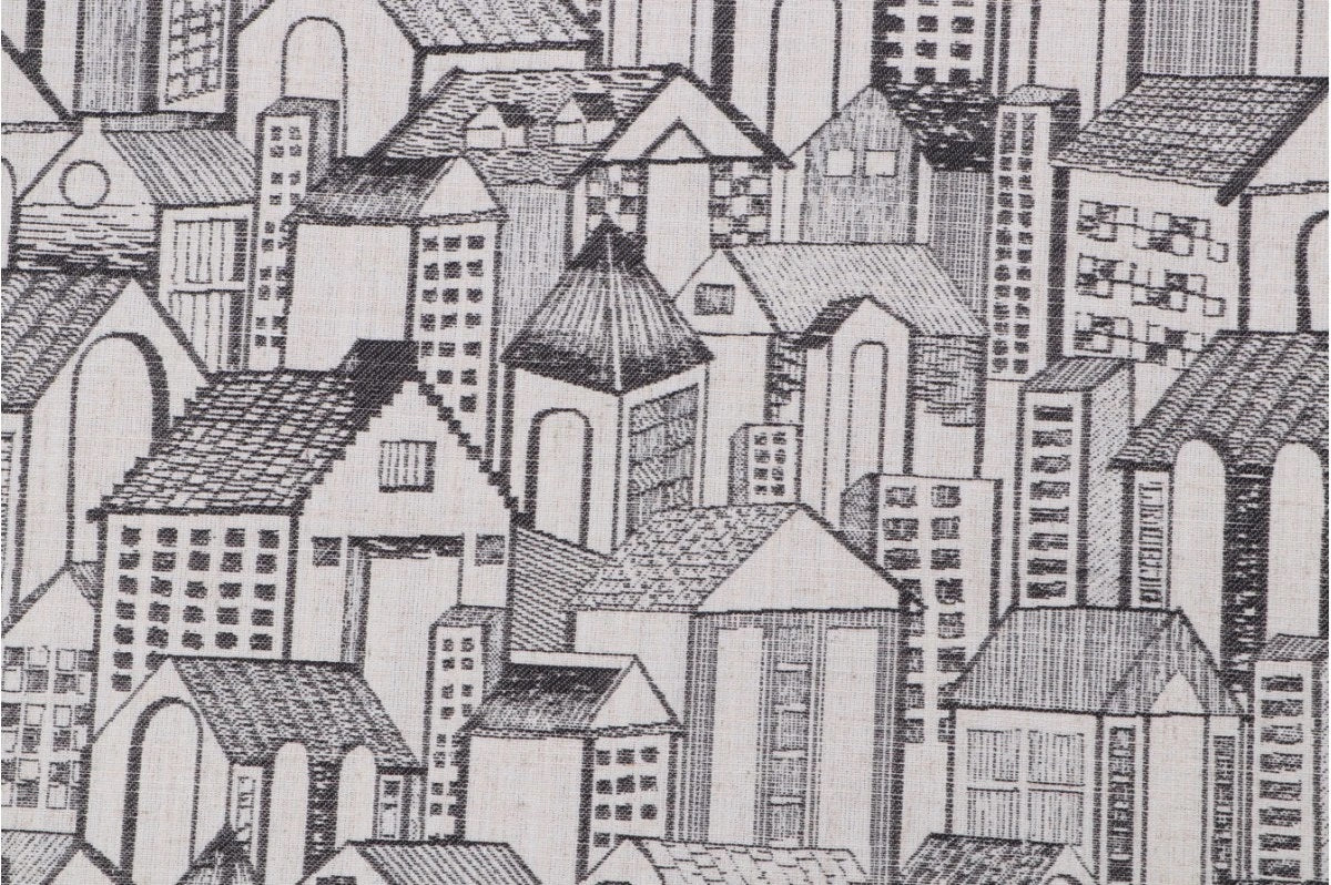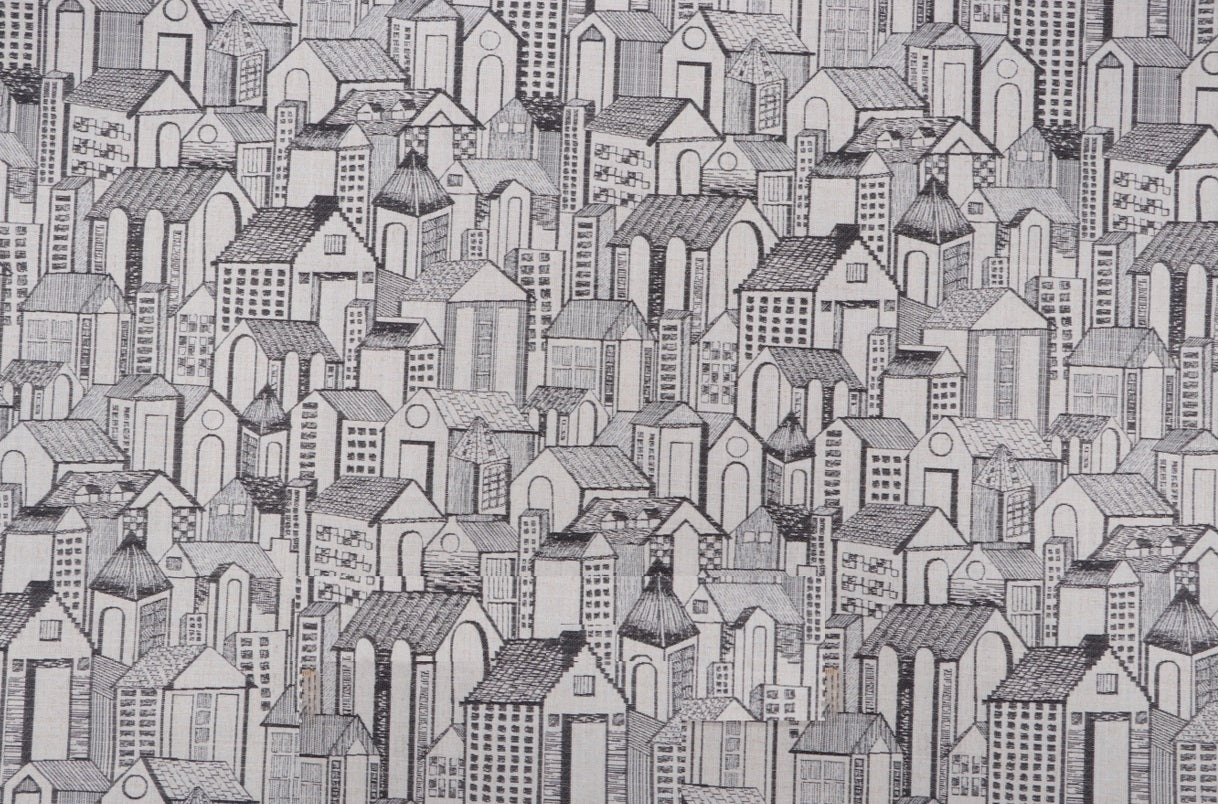 DESCRIPTION: Golding Abode Woven Jacquard Fabric in Domino features a clever and innovative design that combines geometrics with architectural details. The pattern depicts a dense, black and white cityscape with various buildings, including both houses and taller structures, rendered in a detailed, hand-drawn style.