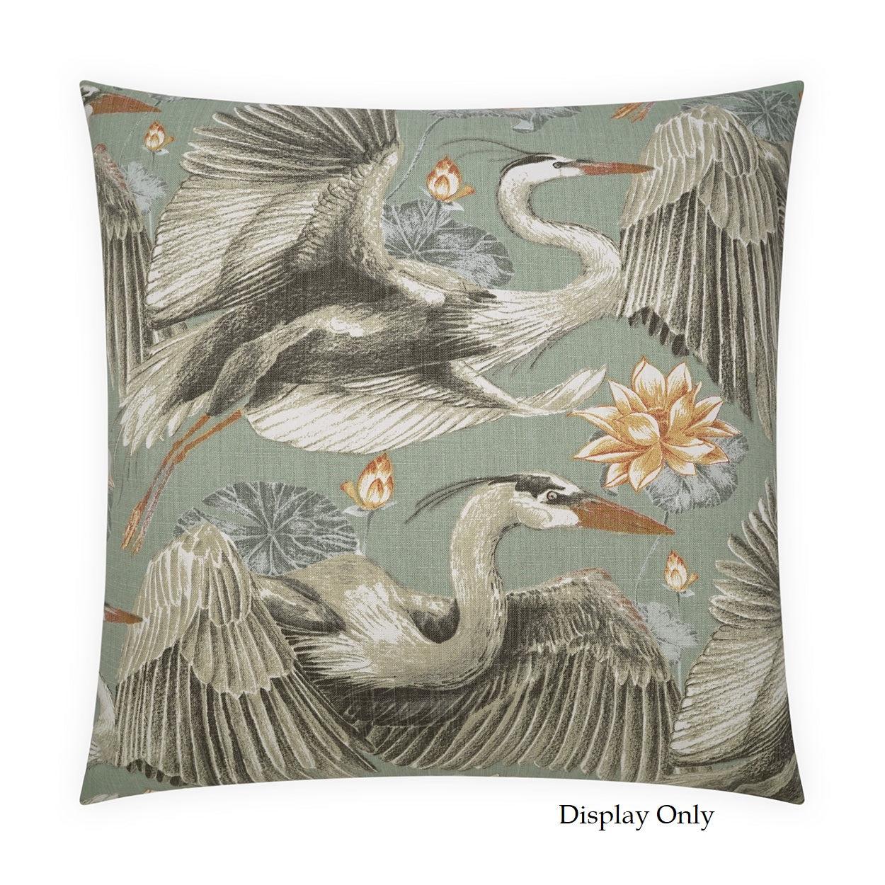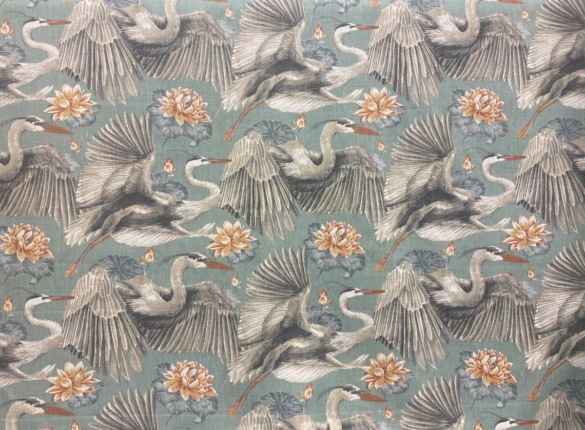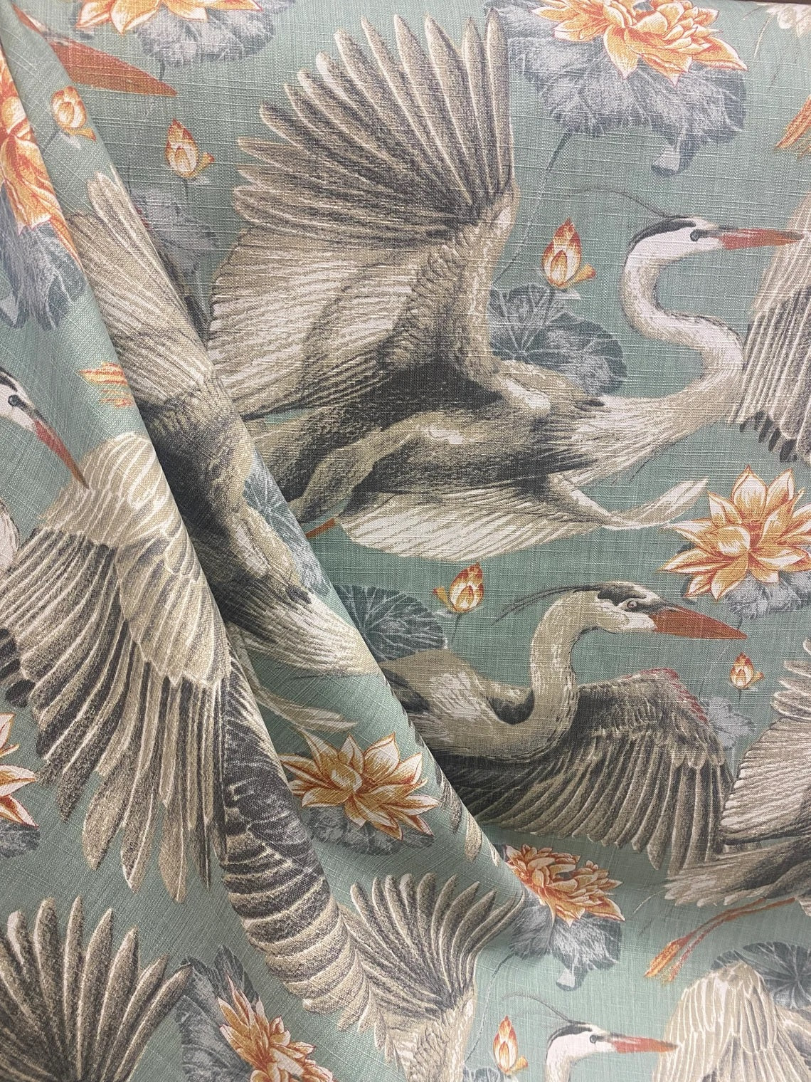 DESCRIPTION: A charming coastal fabric with a botanical pattern of herons and water lilies. The color pallet includes shades of brown, gray, cream and peach on a seafoam colored Background fabric.