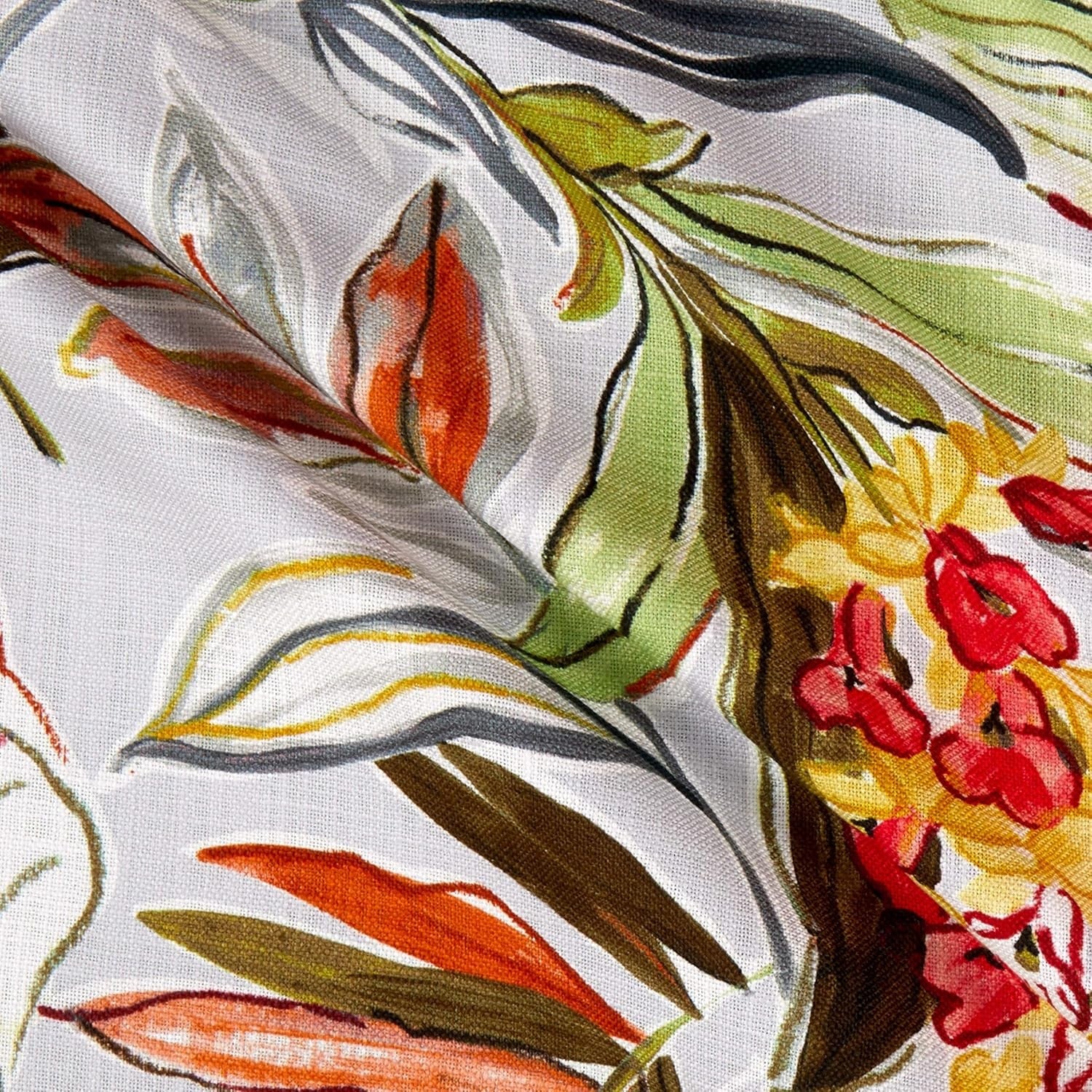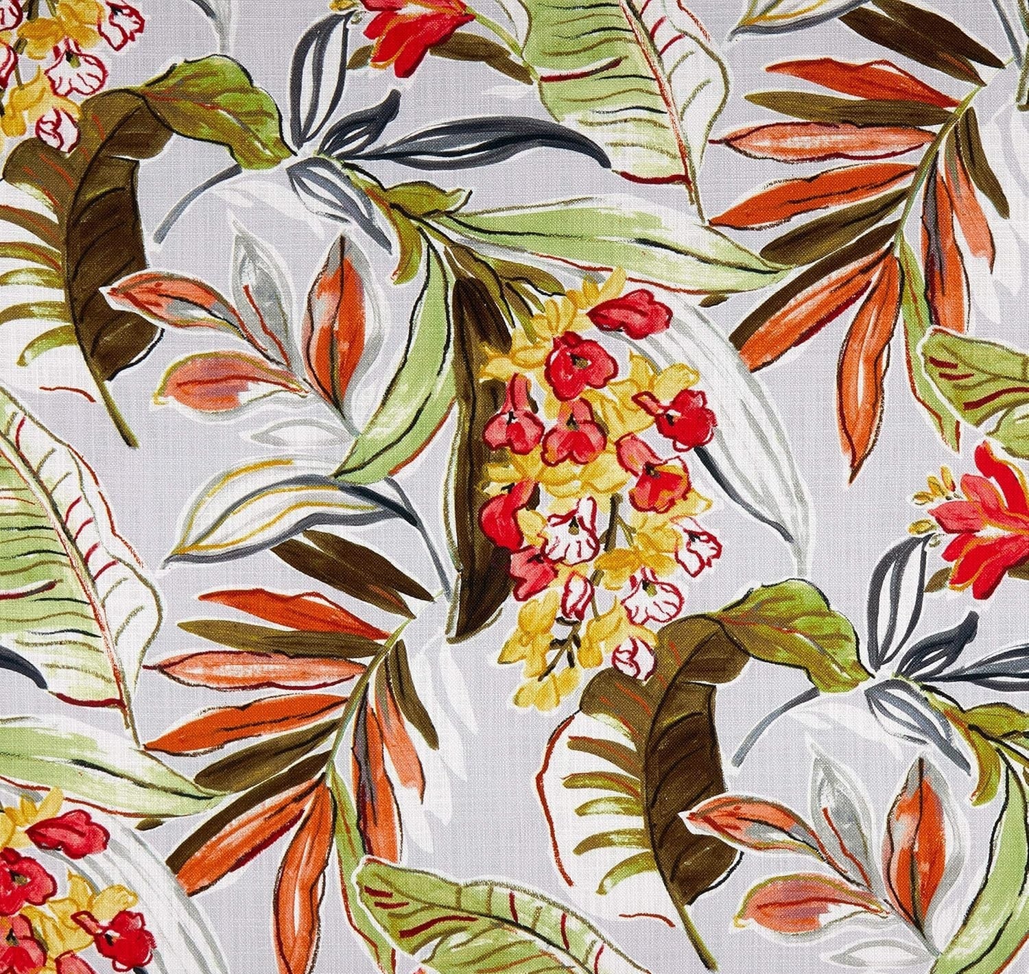 DESCRIPTION: Catalina Fabric in Melon is an incredibly colorful floral/foliage pattern is sure to add color to your home décor. Who needs a vacation when you can create a tropical oasis The color registration shows gunmetal grey, dark green, lime green, orange, coral, red, tan,, yellow on a light grey background.