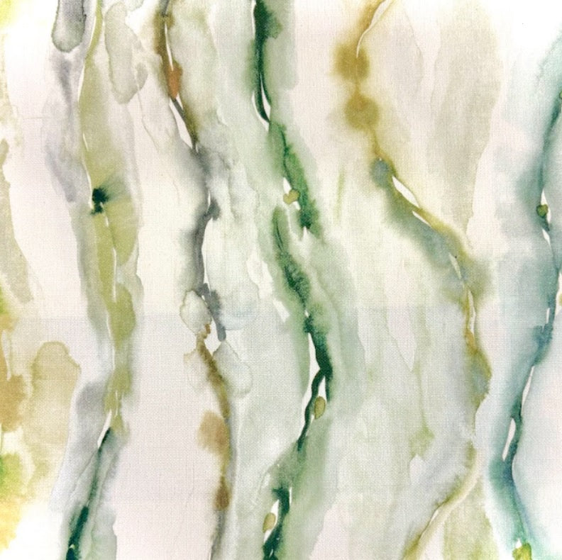 DESCRIPTION: Elevate your home décor with the luxurious Sagano in Jade watercolor stripe fabric. The soft, flowing texture and beautiful jade green watercolor stripes will add a touch of elegance to any room. Perfect for adding a pop of color and sophistication. The color registration shows green, teal, tan and yellow on a white background.