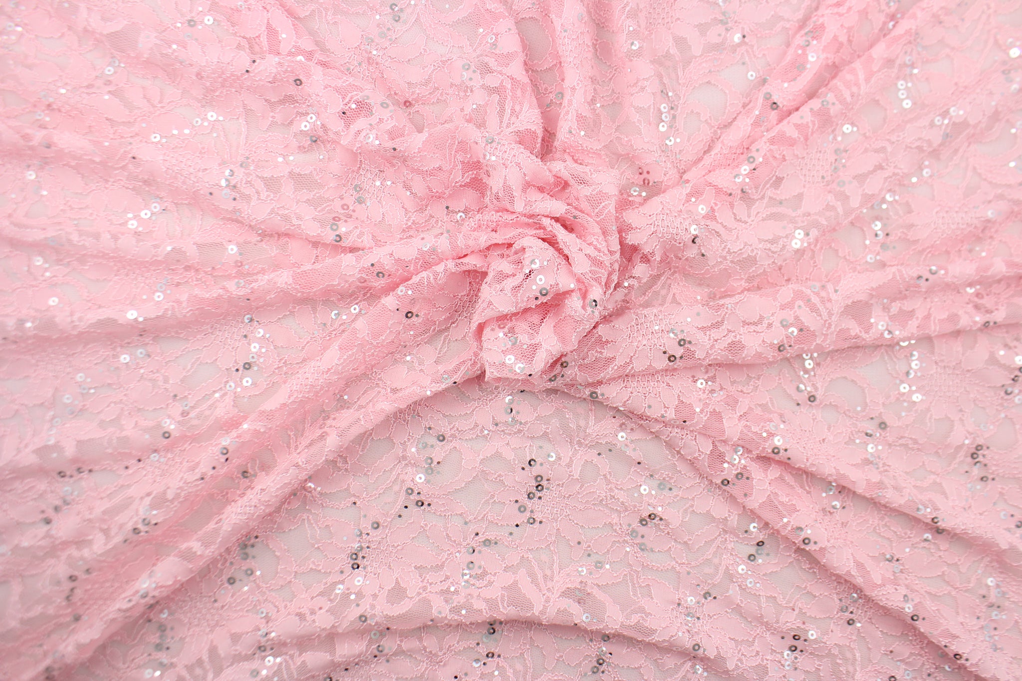 DESCRIPTION: Floral Stretch Lace Fabric in Sequin Pink is a pink, sequined stretch lace. It features a floral or curvy pattern created with embroidery on a mesh background. The fabric is sheer and has a two-way or four-way stretch, making it suitable for various apparel and crafting projects like dresses, dancewear, and formal attire. It is typically made of 100% polyester.