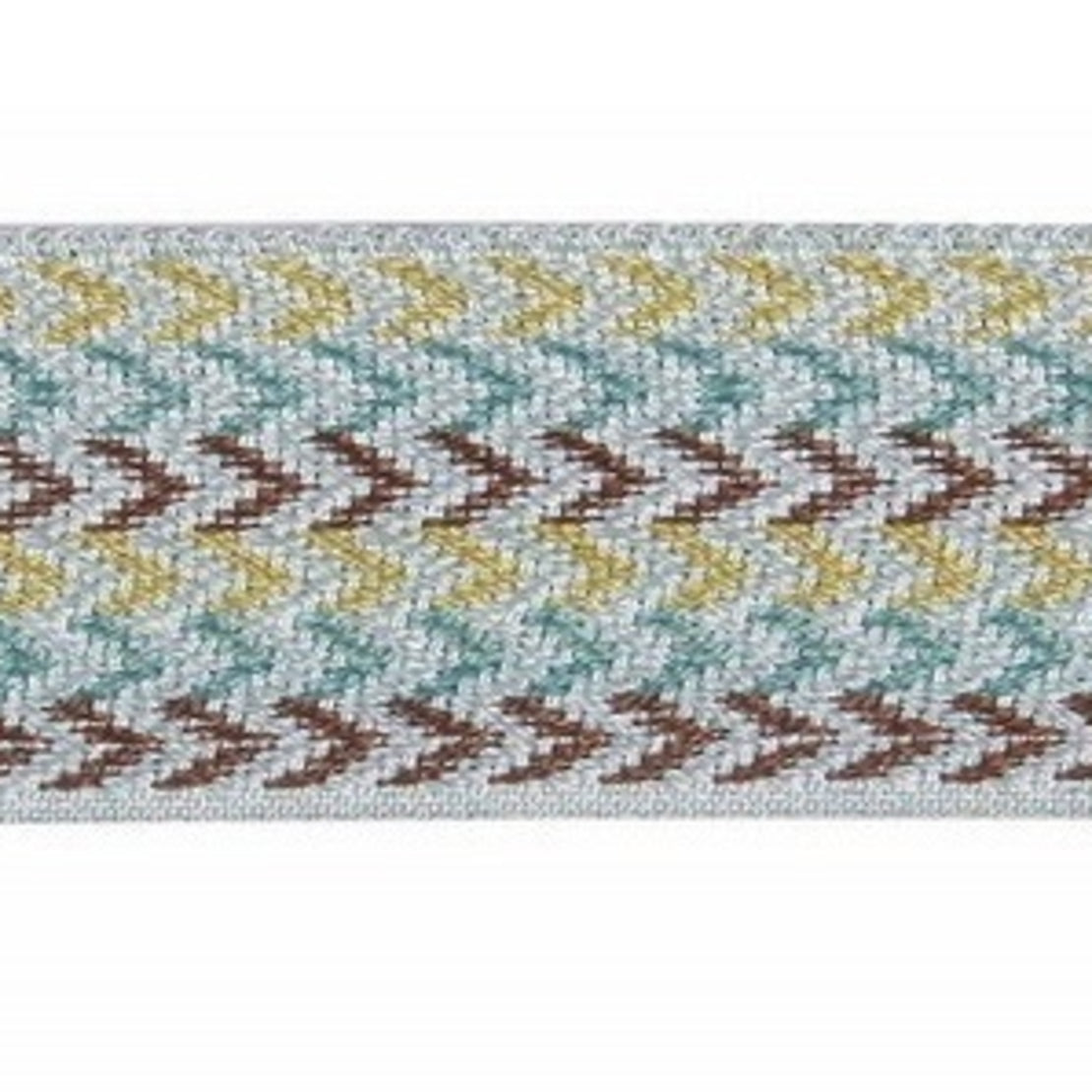 DESCRIPTION: Europatex ~HT-1692 ~ Color: Mudpie Trim features a repeating zigzag or chevron-like geometric design. The pattern is composed of several horizontal rows of small, pointed shapes. The colors used in the pattern include shades of light blue, teal, brownish-red, and yellowish-gold, creating a multi-colored design. Adding trim greatly enhances the look and offers a new level of elegance to your projects.