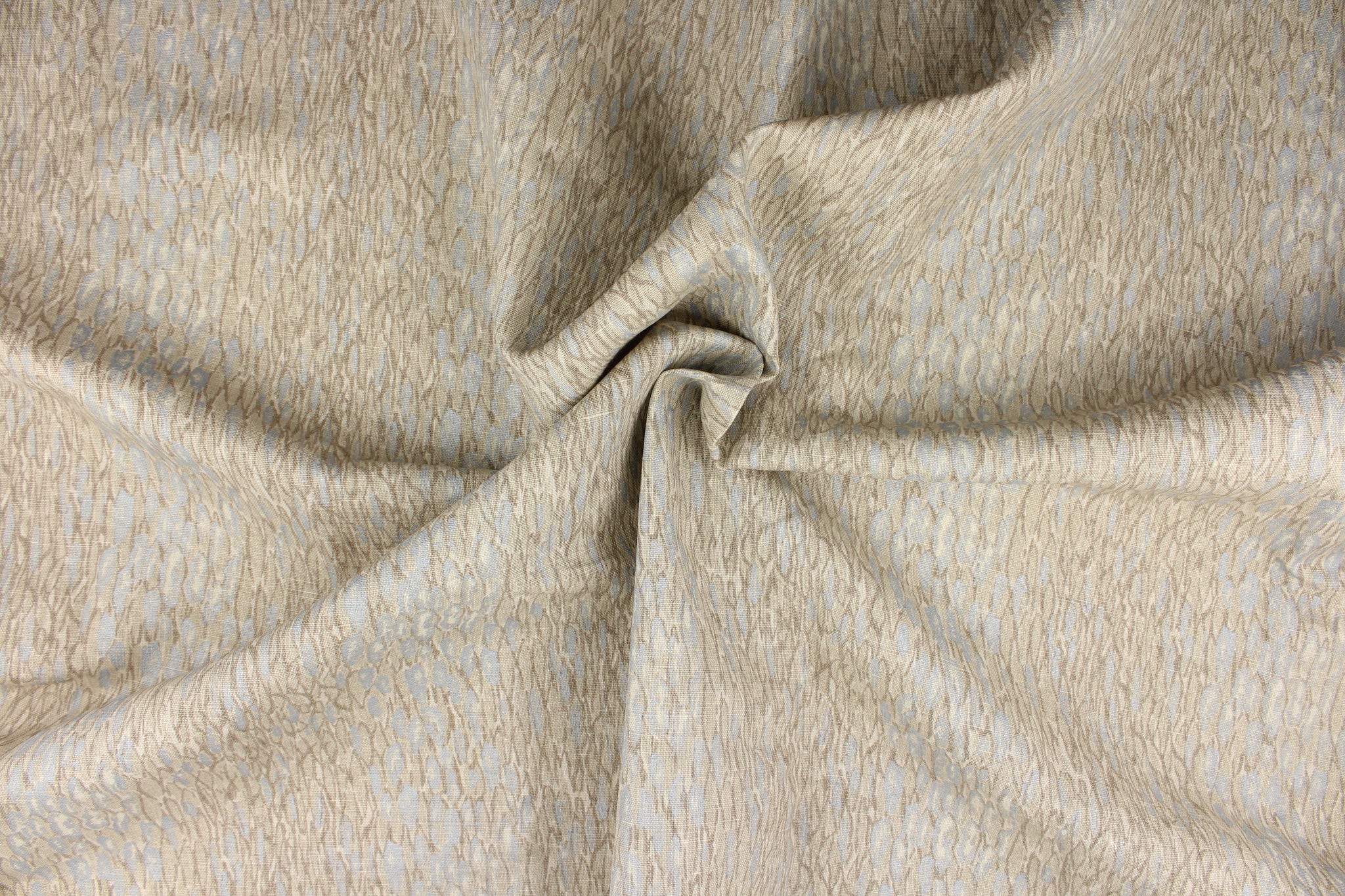 DESCRIPTION: This fabric features an abstract design in brown gray tones and silvery blue colors. Use this for bedding, upholstery, pillows, drapery, etc.
