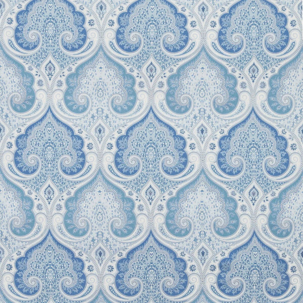 DESCRIPTION: Kravet's classic, Laticia is a damask paisley design. The color registration shows several shades of blue on a off-white background. The fabric has been treated to be stain and soil resistant.