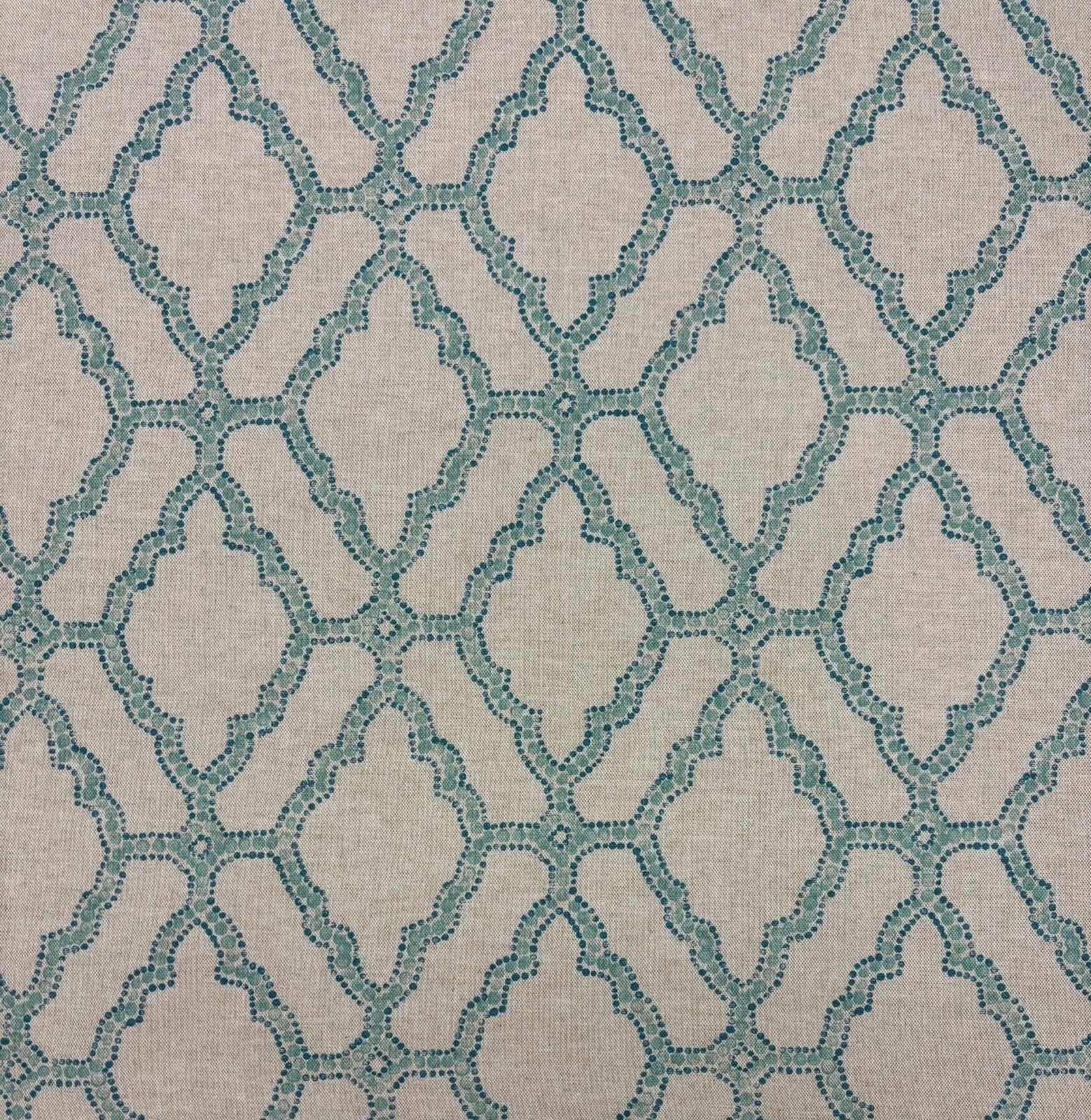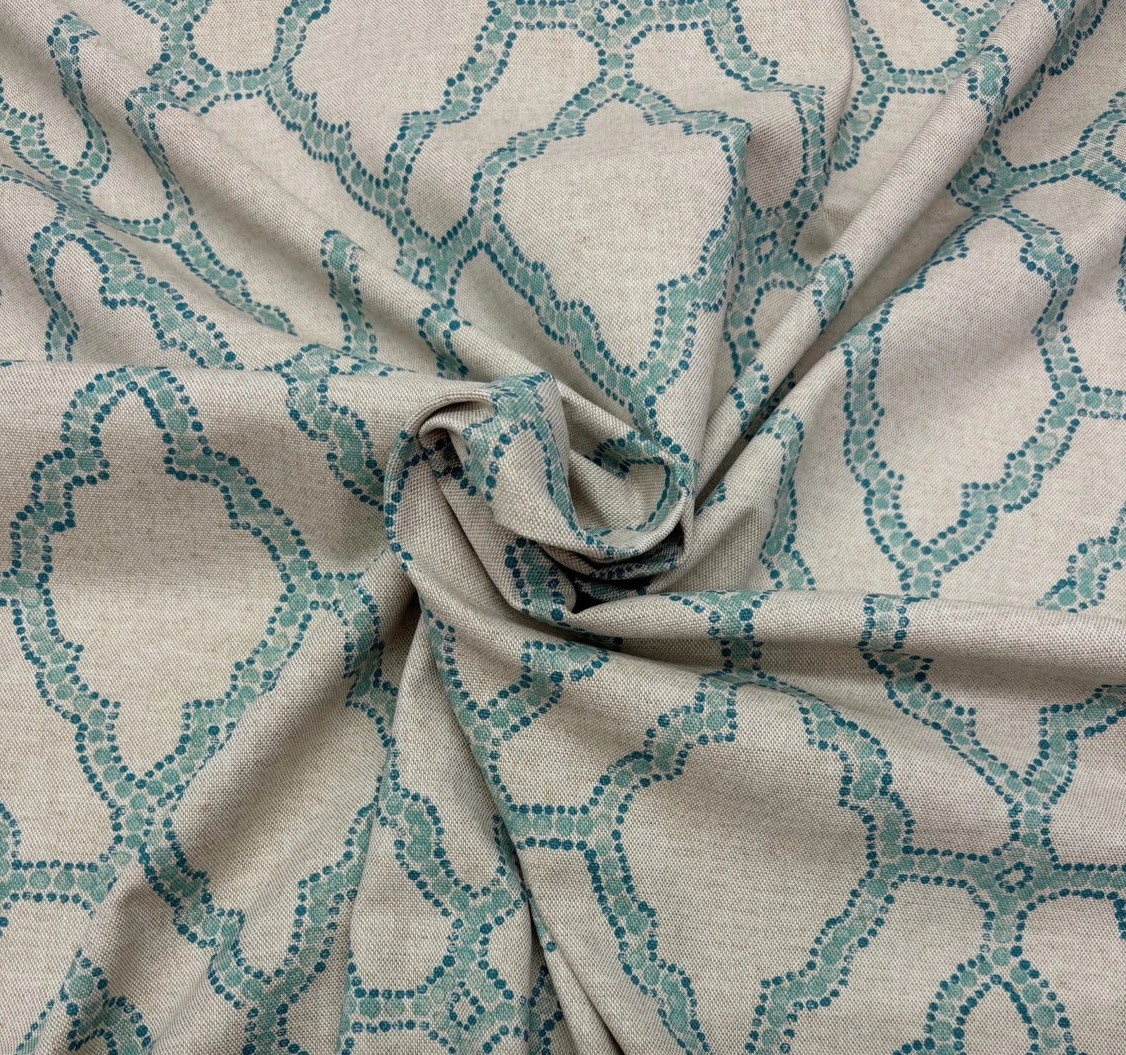 DESCRIPTION: Lacefield Designs Kia Fabric in Capri features a interlocking quatrefoil motifs, which are outlined with a small-scale, dotted design in a teal on a natural-colored, textured background. Rayon is added to cotton to enhance its properties, creating a blended fabric that combines cotton's breathability and durability with rayon's softer feel, drape, and silky sheen. This blend improves the fabric's texture, making it feel smoother and more luxurious, while also increasing its absorbency. However, rayon's weaknesses, such as being less durable and prone to wrinkling and shrinking, are mitigated by the presence of cotton.