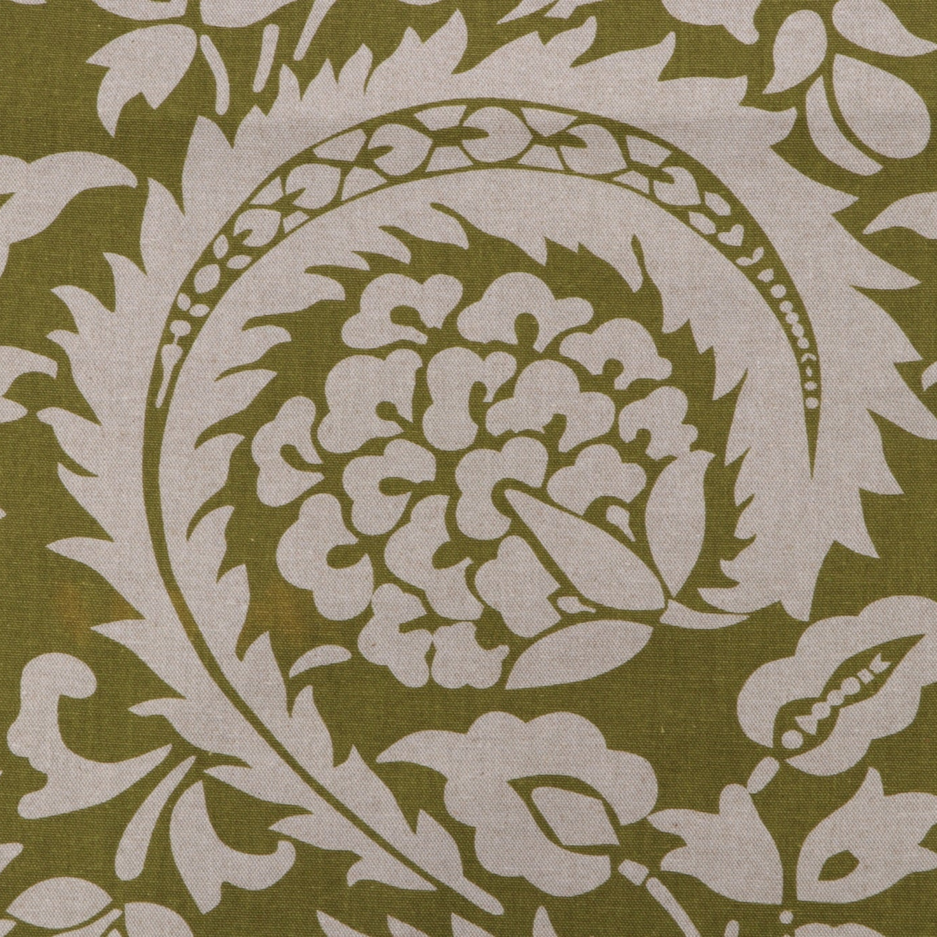 DESCRIPTION: Lacefield Designs Lisbon Fabric in Olive features a large-scale, intricate floral damask pattern in natural tan set against a vibrant olive background. The pattern includes flowing scrolls, stylized floral elements, and leaf motifs, creating a classic and elegant aesthetic.