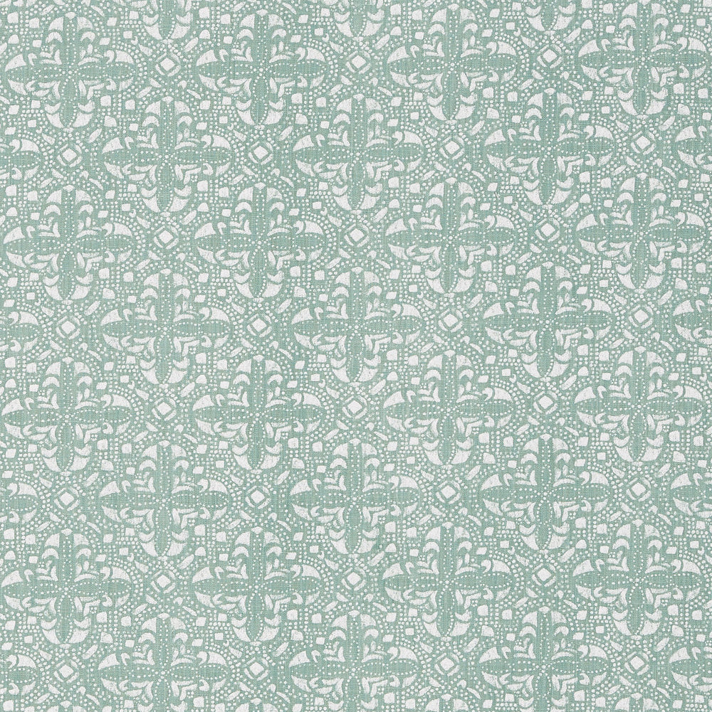 DESCRIPTION: Lacefield Designs Sandoval Fabric in Verde featuring an intricate, repeating medallion and stylized fleur-de-lis pattern. The design is a muted blue-green color on a white or natural background. The pattern is created with a detailed, stippled or dotted texture, giving it a slightly distressed or block-printed appearance.