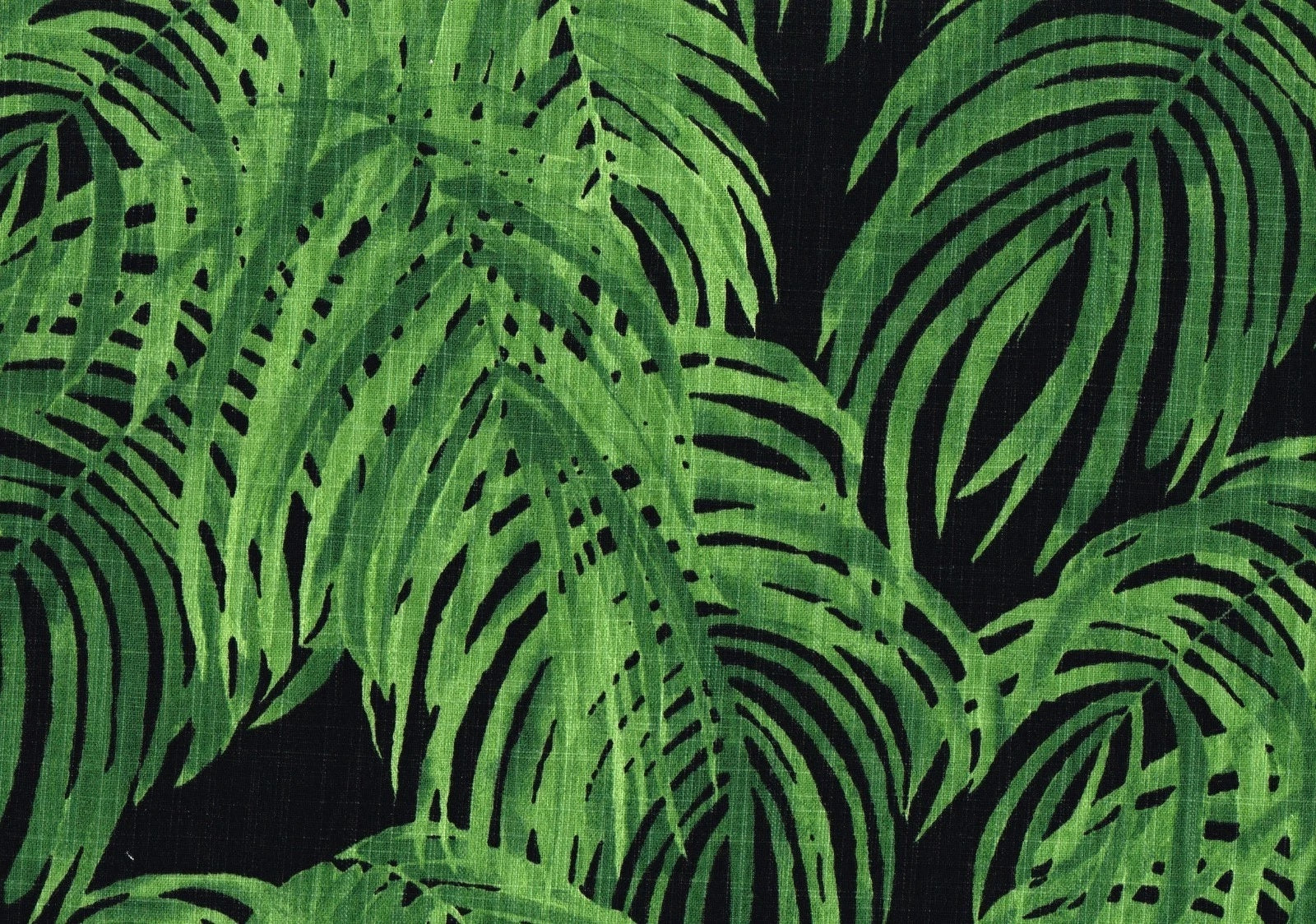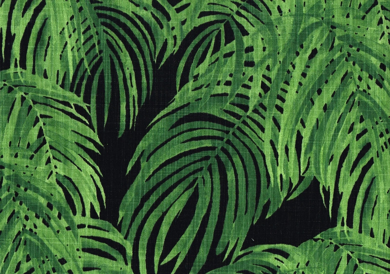 DESCRIPTION: Lacefield Designs Villa Fabric in Cayman features a pattern of bright green palm leaves on a black background. The design is described as sophisticated and globally inspired.