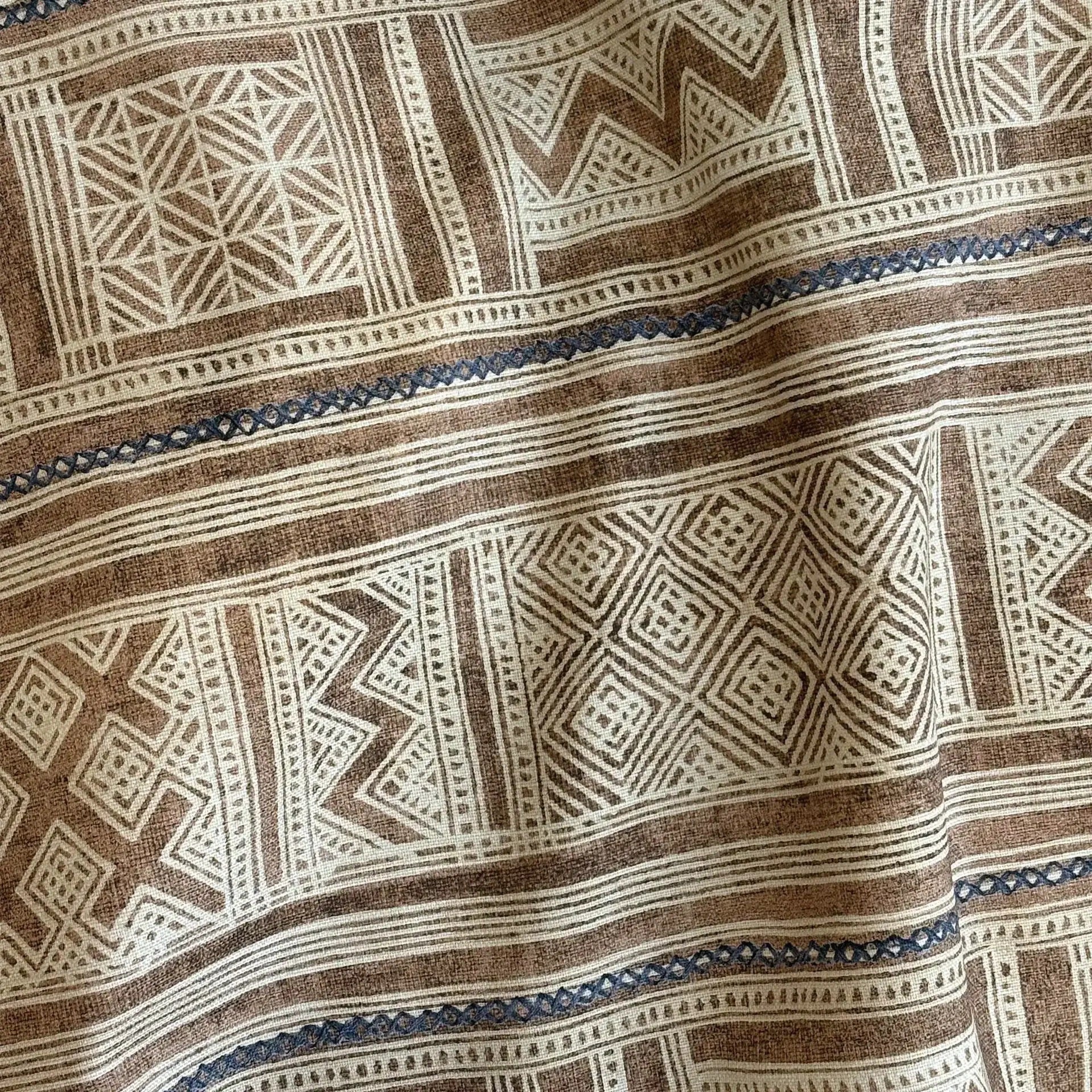DESCRIPTION: From the Lemieux Et Cie Heirloom Collection, Inlet features bold geometric patterns, ethnic motifs, and earthy color palettes, creating unique and eye-catching designs. The color registration shows brown, and blue on an off-white background.
