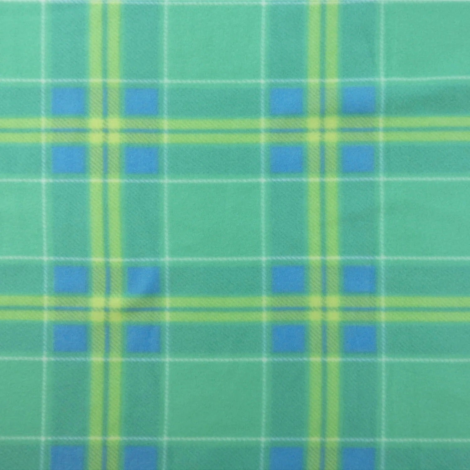 DESCRIPTION: Mario Plaid Polar Fleece Fabric in Mint is a soft plush fabric, that is cozy, warm, lightweight, and easy to care for. Get creative with this versatile fabric and show-off your DIY skills! The color registration shows the colors blue, yellow and white on a mint green colored background.