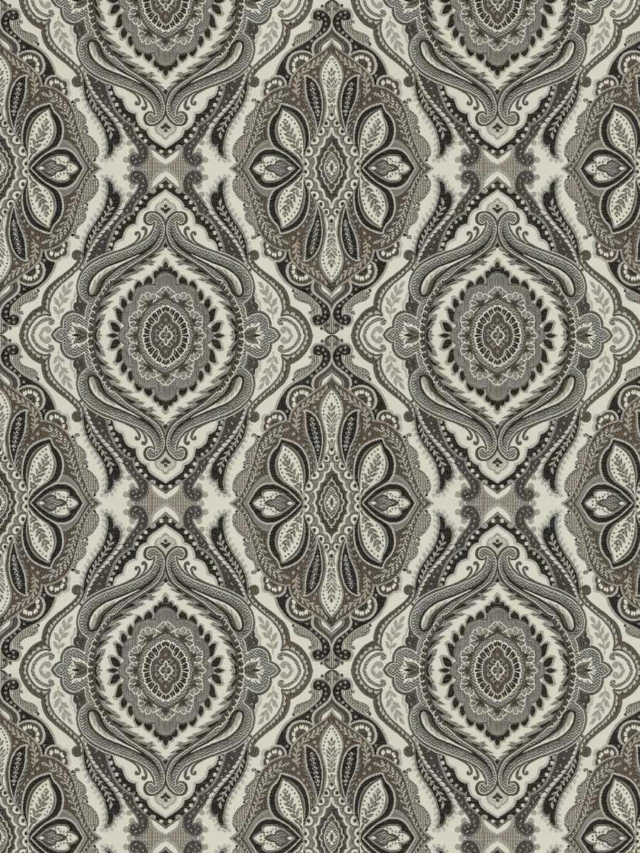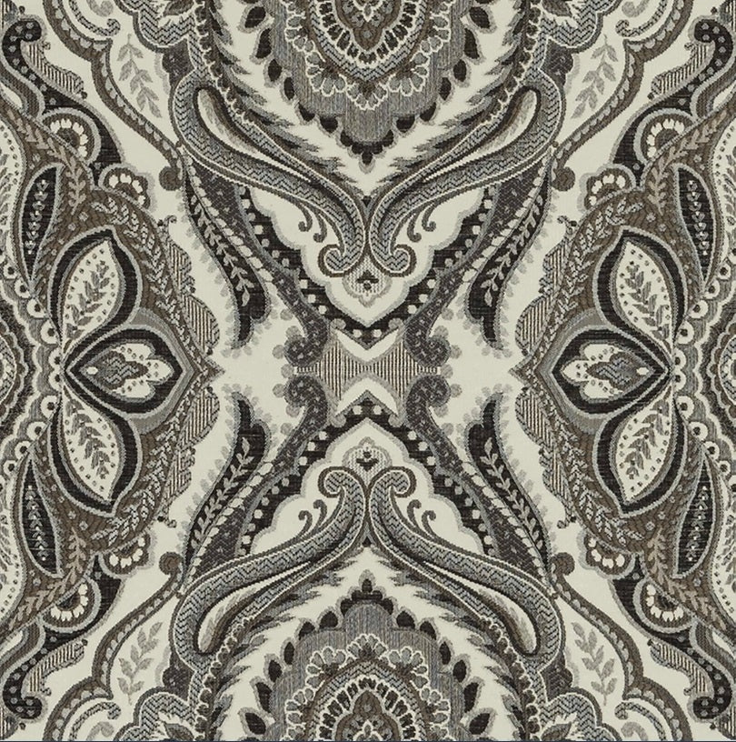 DESCRIPTION:  A woven  jacquard pattern, featuring a paisley/medallion design.  The color registration shows black, brown, taupe and cream.