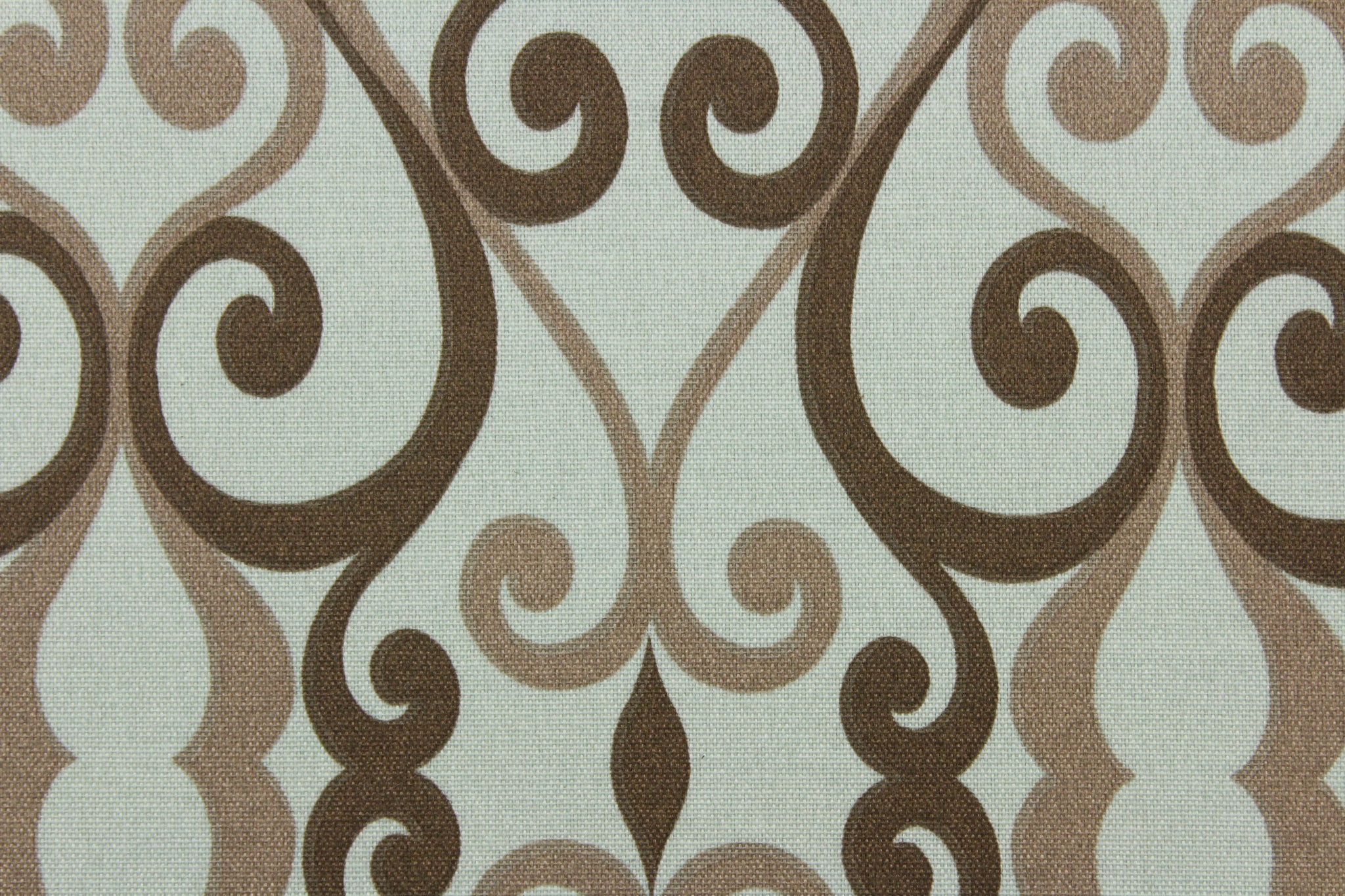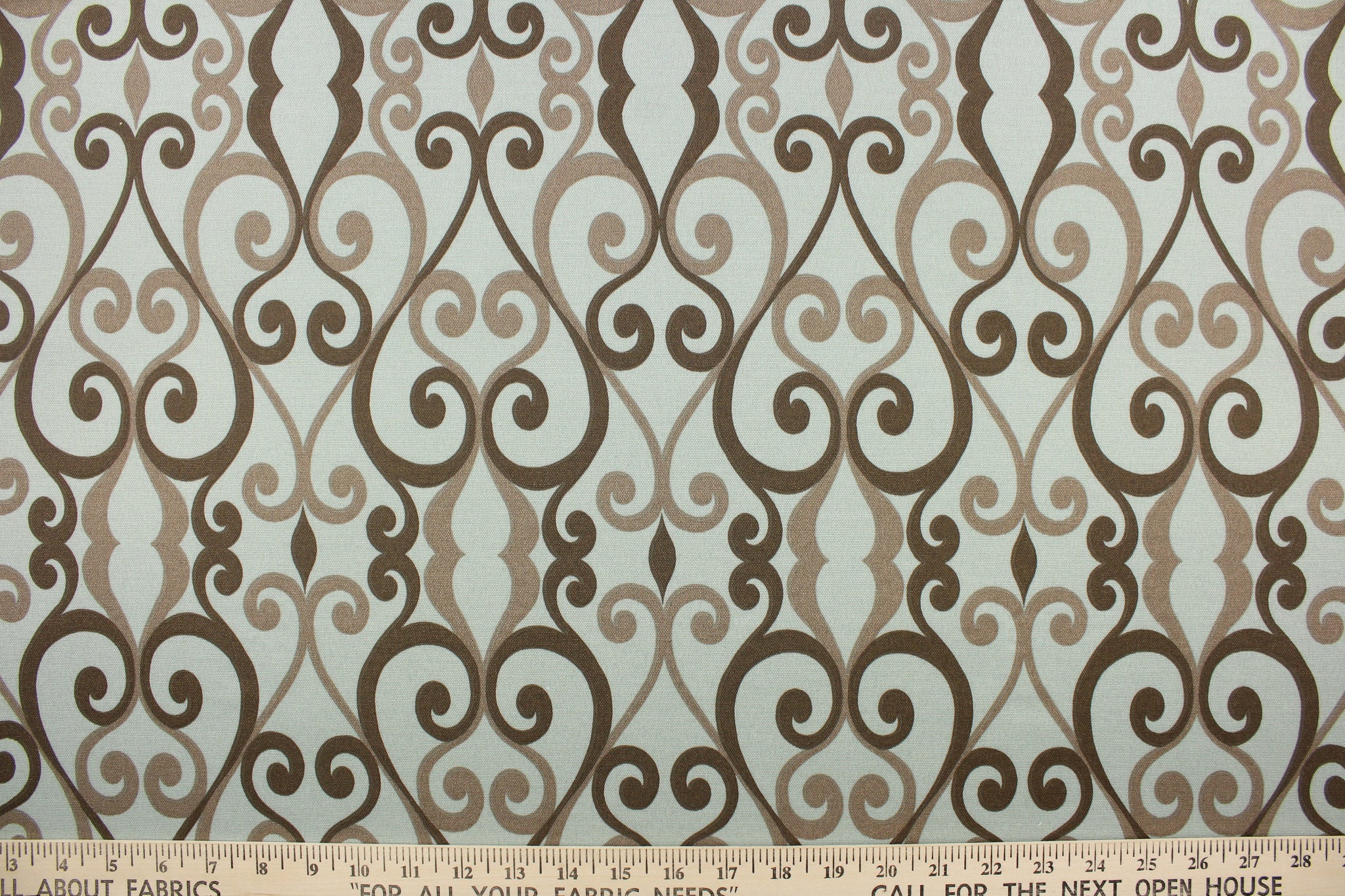 DESCRIPTION: This indoor/outdoor fabric features a scroll design in taupe, and brown against a gray blue. Use this for pillows, cushions, upholstery, etc.