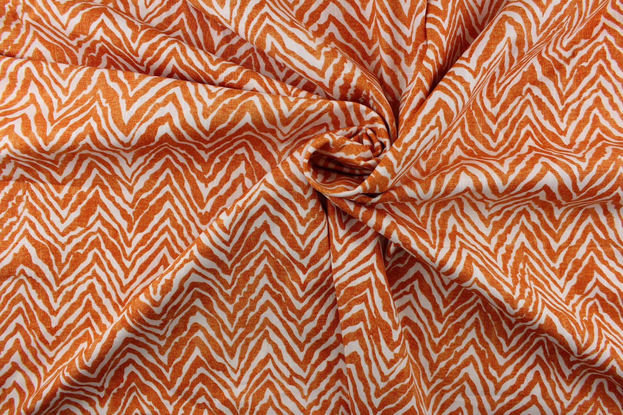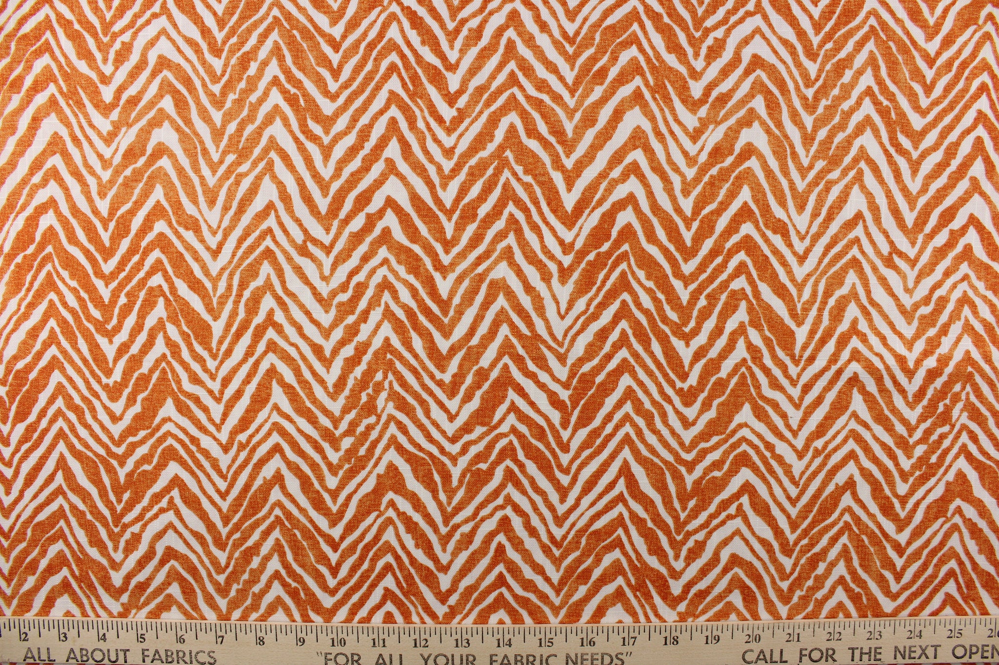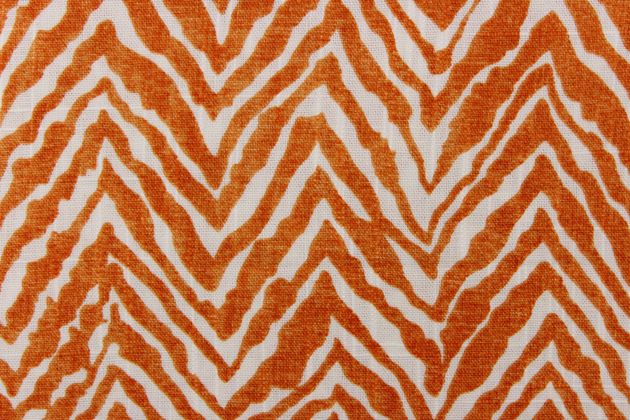 DESCRIPTION: Calling all tiger fans! This fabric features a chevron tiger stripe in orange against a white background. Use this for drapery, pillows, totes, light upholstery. etc. This fabric offers a soft workable feel yet maintains its durability. It also has a soil and stain repellant finish making clean up a breeze.  We offer this design in one other color also.