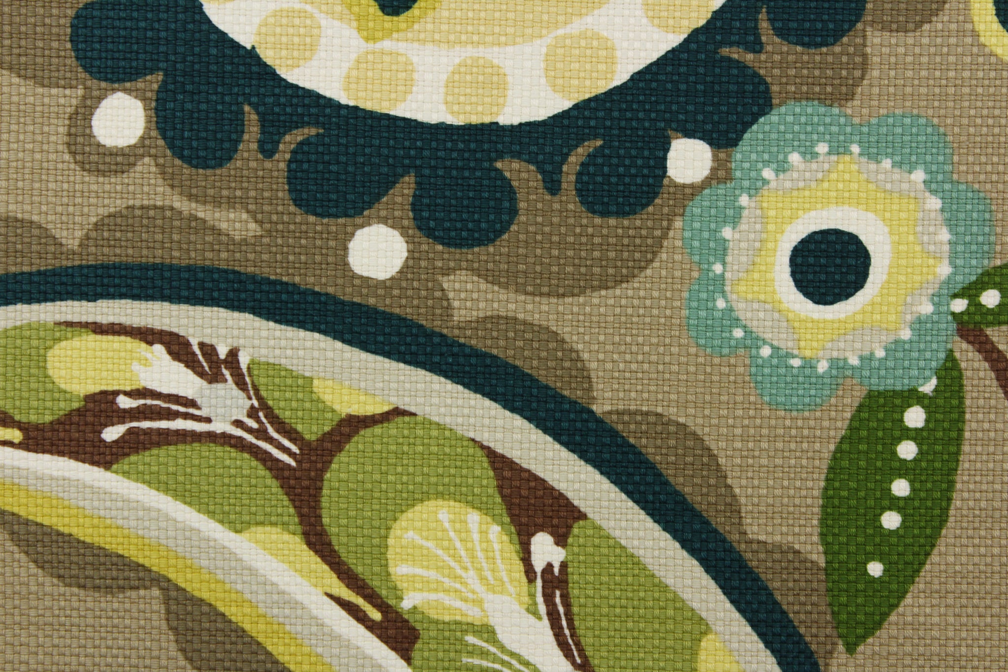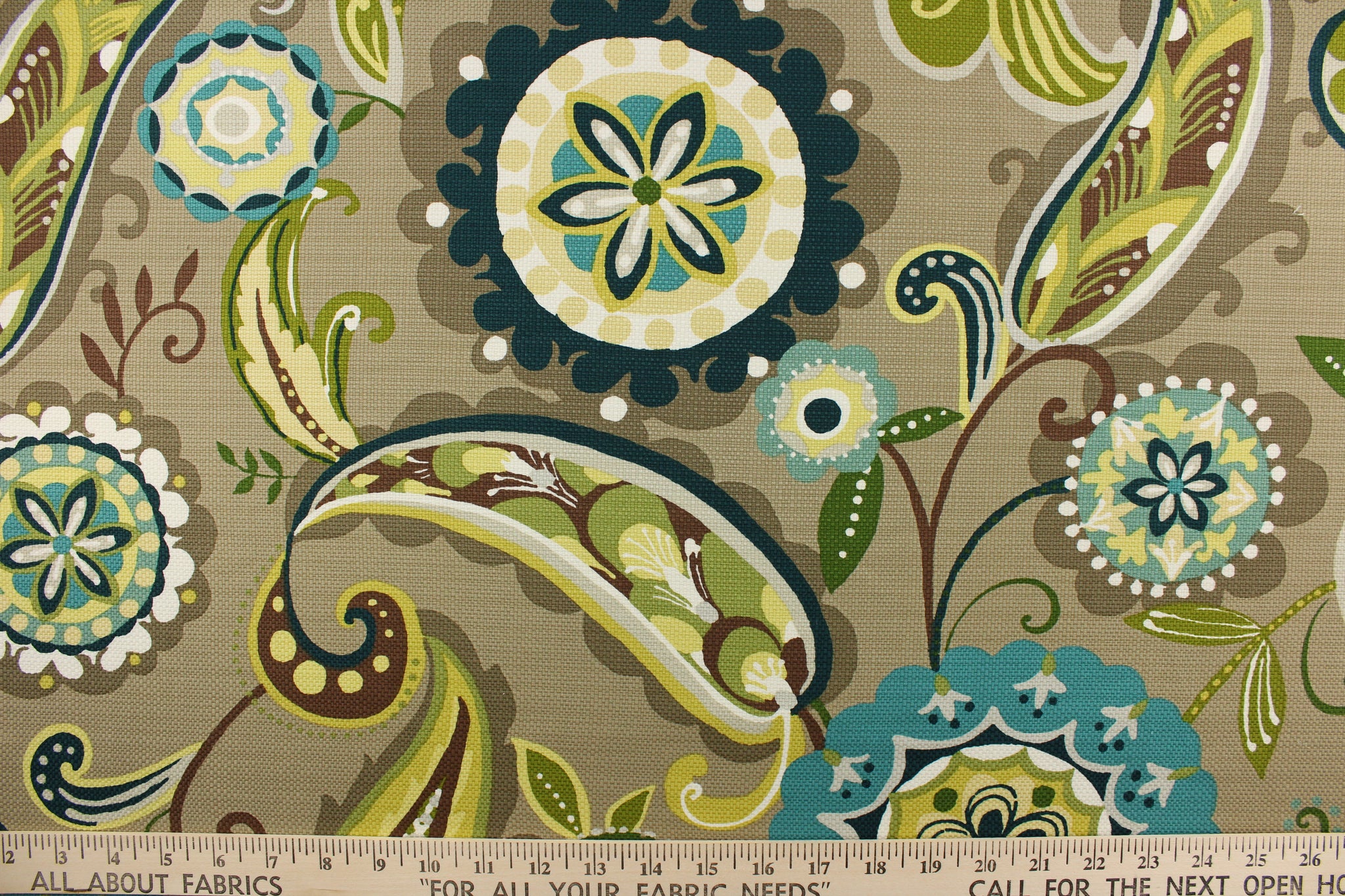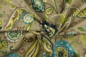 DESCRIPTION: This fabric features a brightly colored whimsical floral design in shades of green and teal with white, brown, pale yellow, hints of light gray and light khaki mixed in against a taupe background. This fabric also has a texture that enhances the design. Use this for drapery, pillows, totes, upholstery, etc. This fabric offers a soil and stain repellant finish.