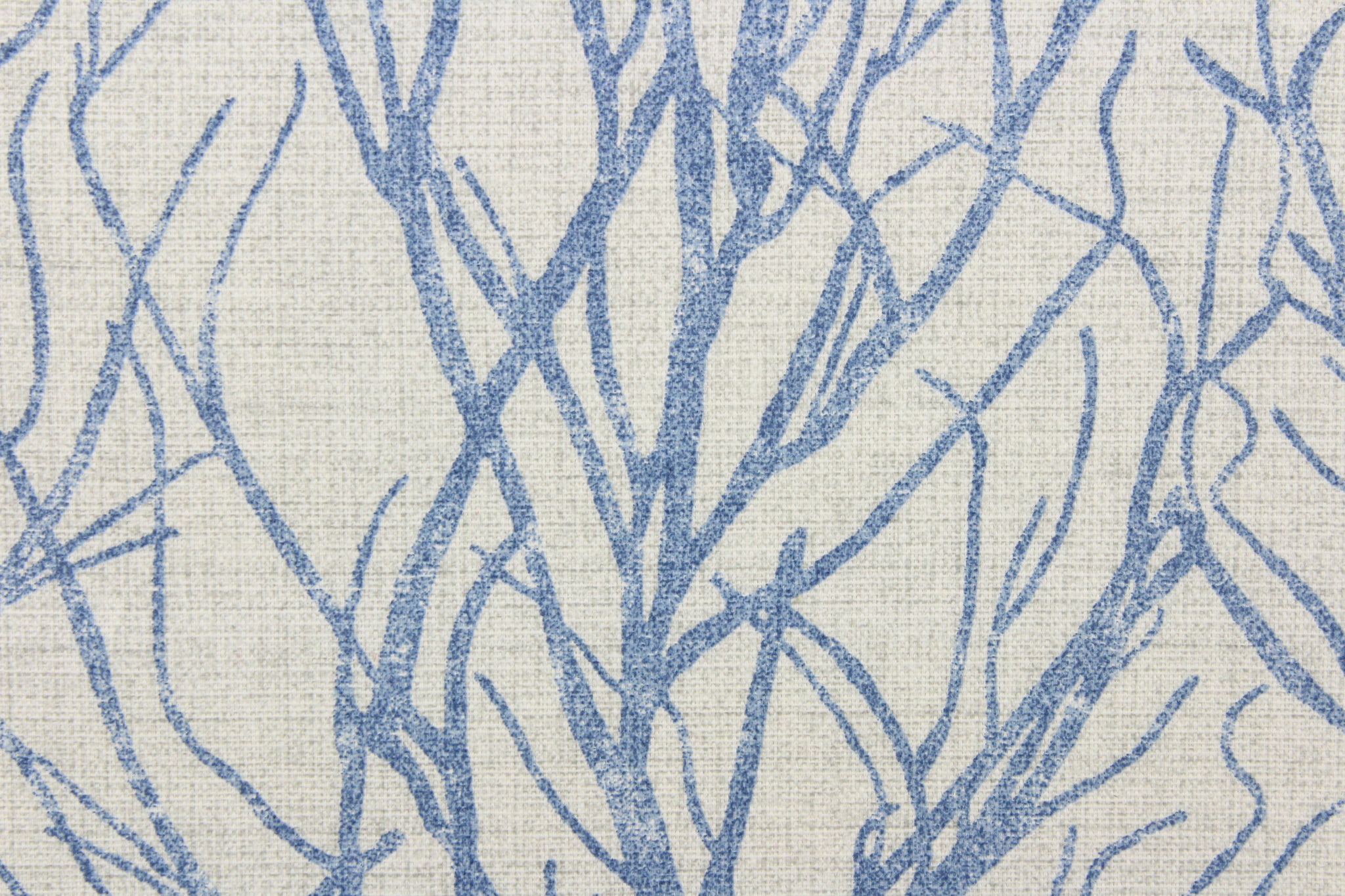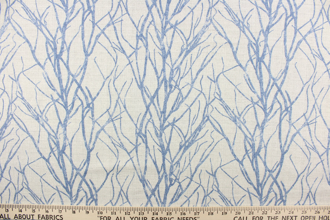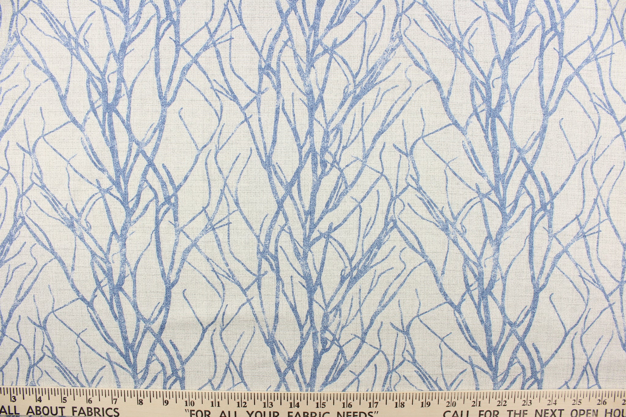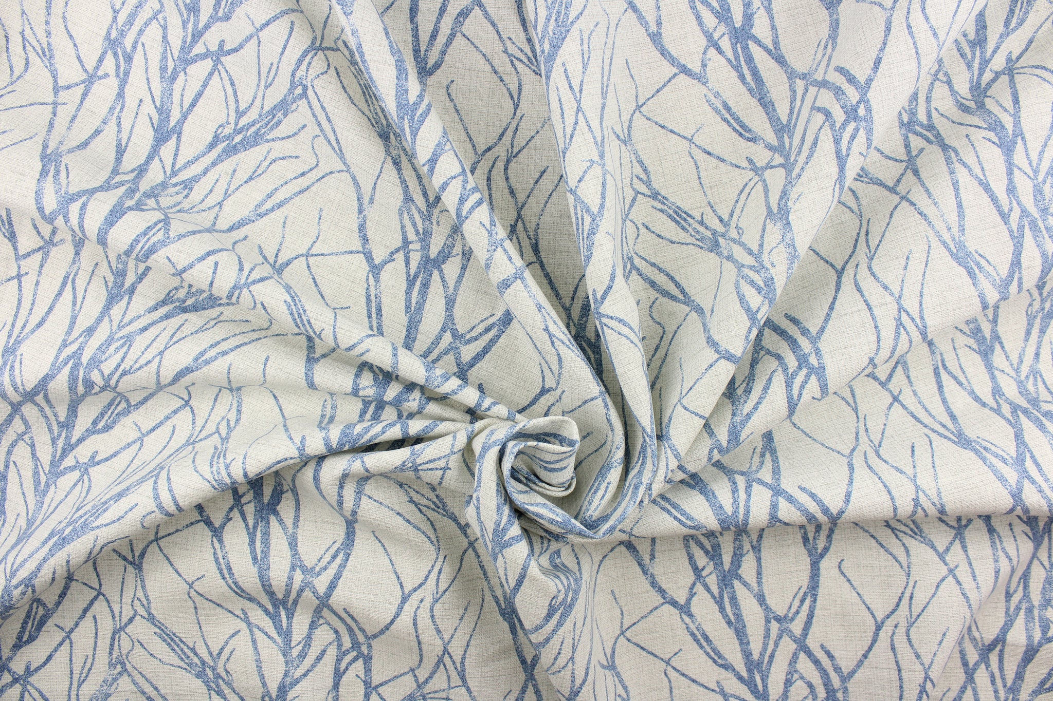 DESPRIPTION: This fabric features a branch design in blue against a pale gray background. Use this for drapery, light upholstery, pillows, handbags, etc. This fabric offers a soft workable hand yet is durable and sturdy. We offer this design in one other color.