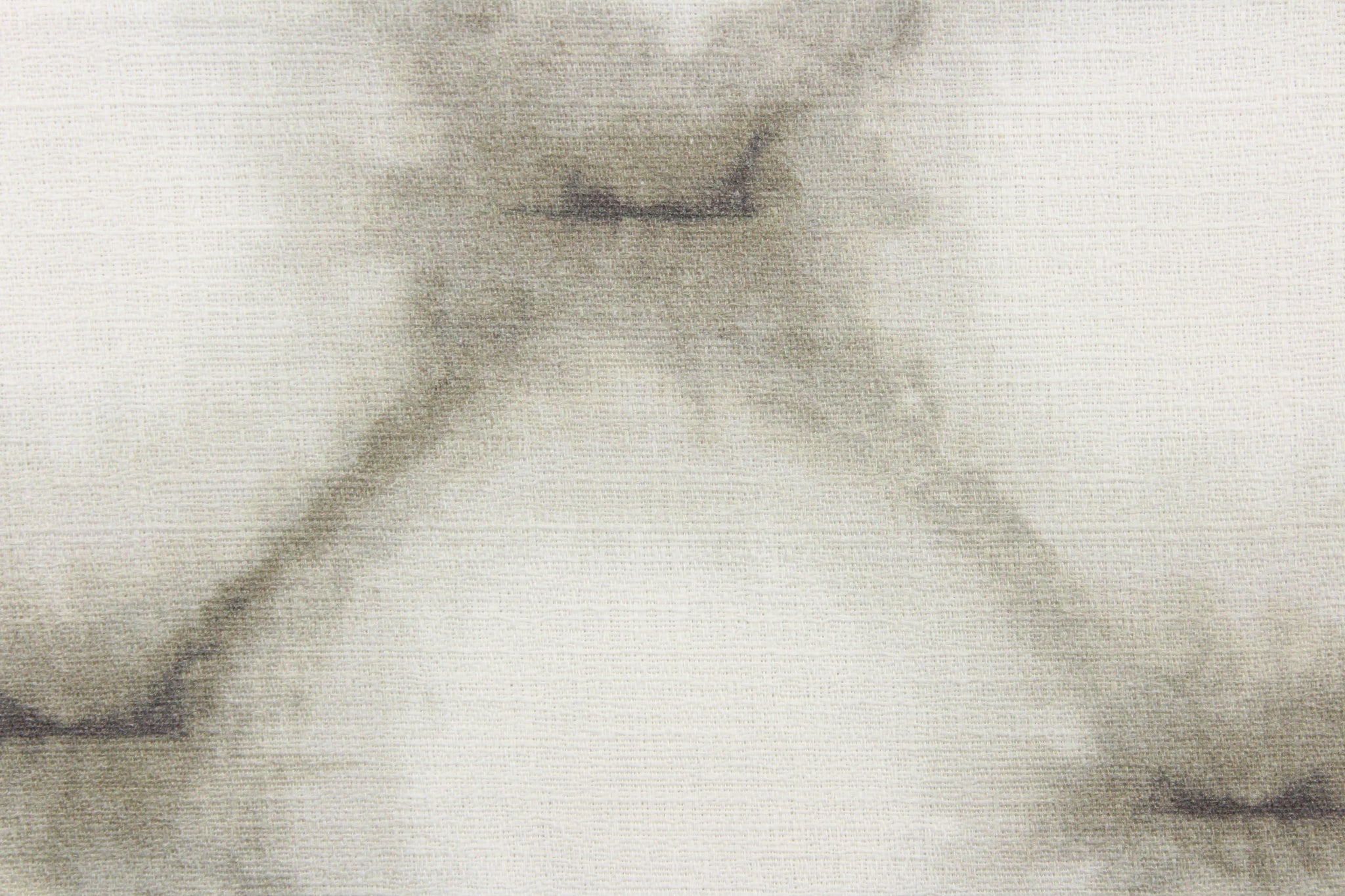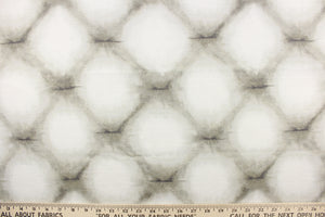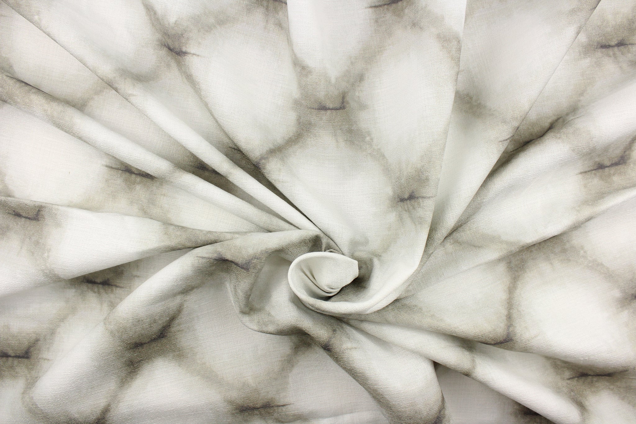 DESCRIPTION: This fabric features a geometric design in brownish gray against white. Use this for drapery, pillows, light upholstery, handbags, etc. This fabric has a distress look enhancing the design. This fabric has a soil and stain repellant finish.