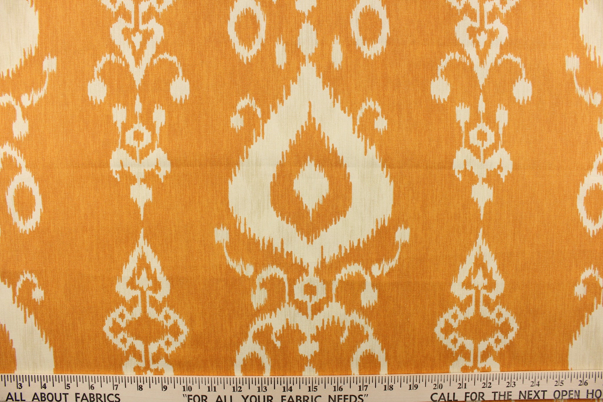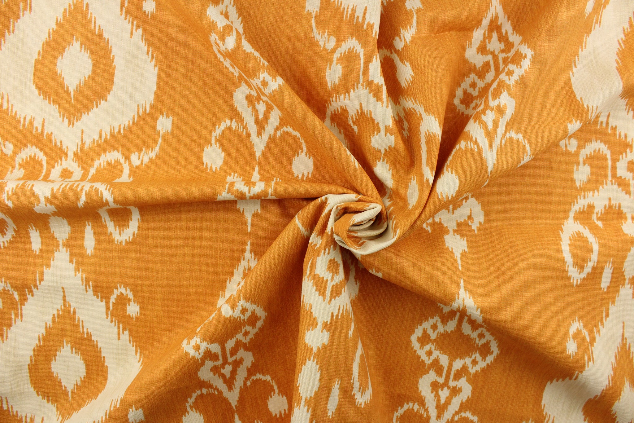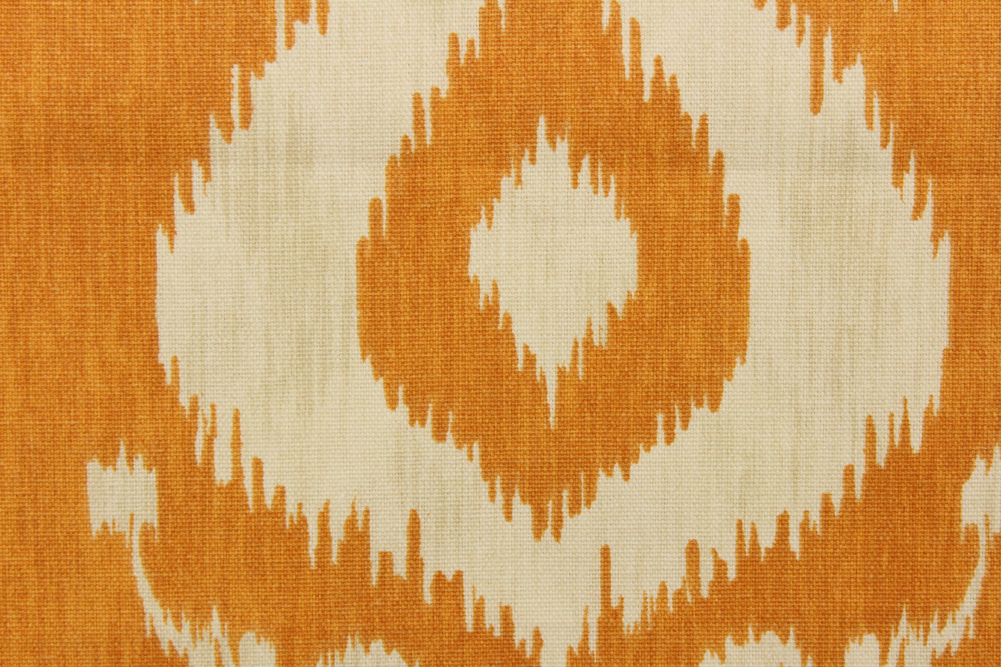 DESCRIPTION: This fabric features an ikat design in a yellow orange and off white. Use this for drapery, upholstery, pillows, home décor, etc. We offer this design in several different colors.