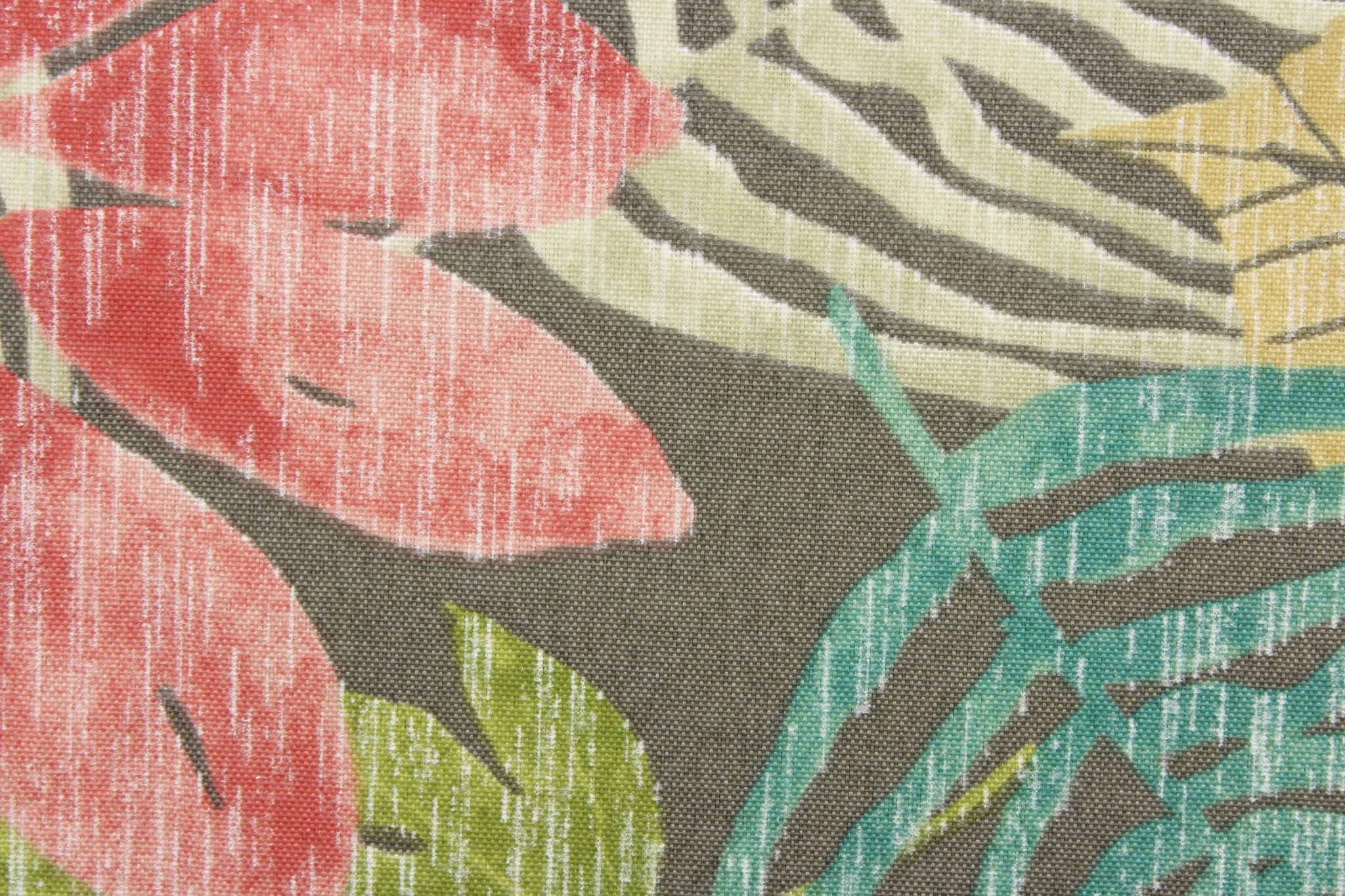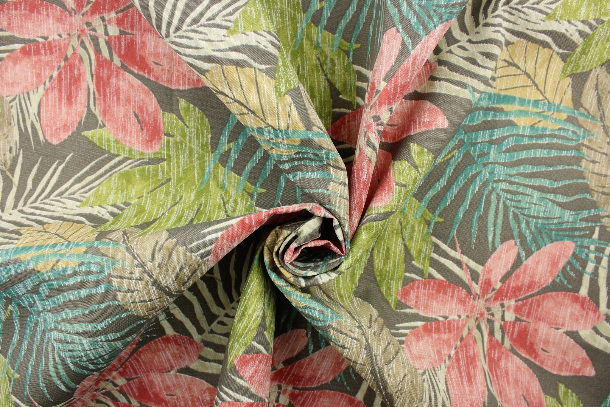 DESCRIPTION: This outdoor fabric features a floral design in green, turquoise, khaki, beige, pink, and off white against a taupe background. Use this for outdoor upholstery, cushions, pillows, etc. This fabric has a durability rating of a minimum of 15000 double rubs and has a UV protection. We offer this design in one other color.
