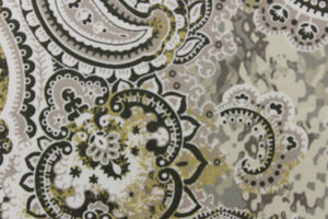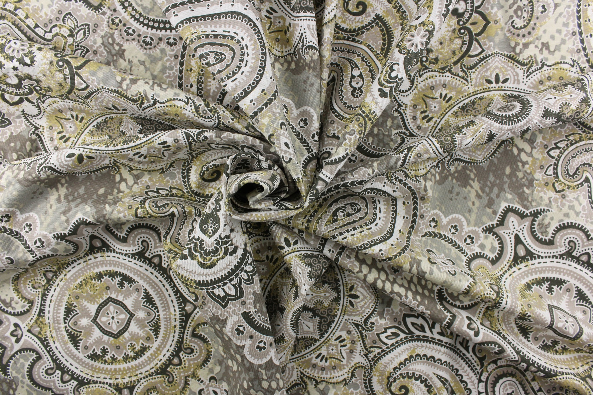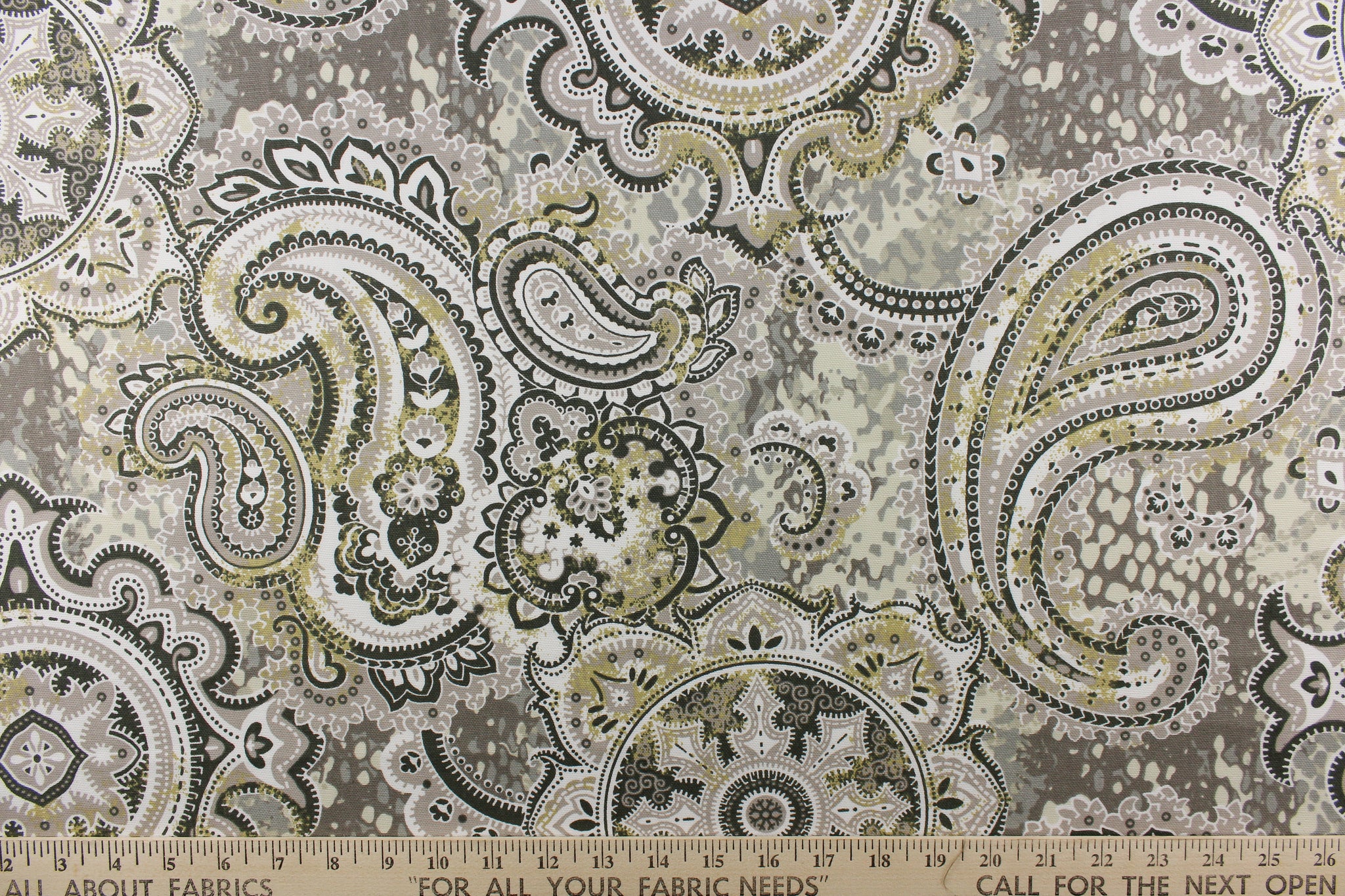 DESCRIPTION: This fabric features a beautiful paisley design in colors gray, mute gold, dark green, and white with hints of off white. Uses this in a variety of designs from drapery to bedding, upholstery, tote bags, etc. It also has a soil and stain repellant finish making clean up a breeze. We offer this design in one other color.