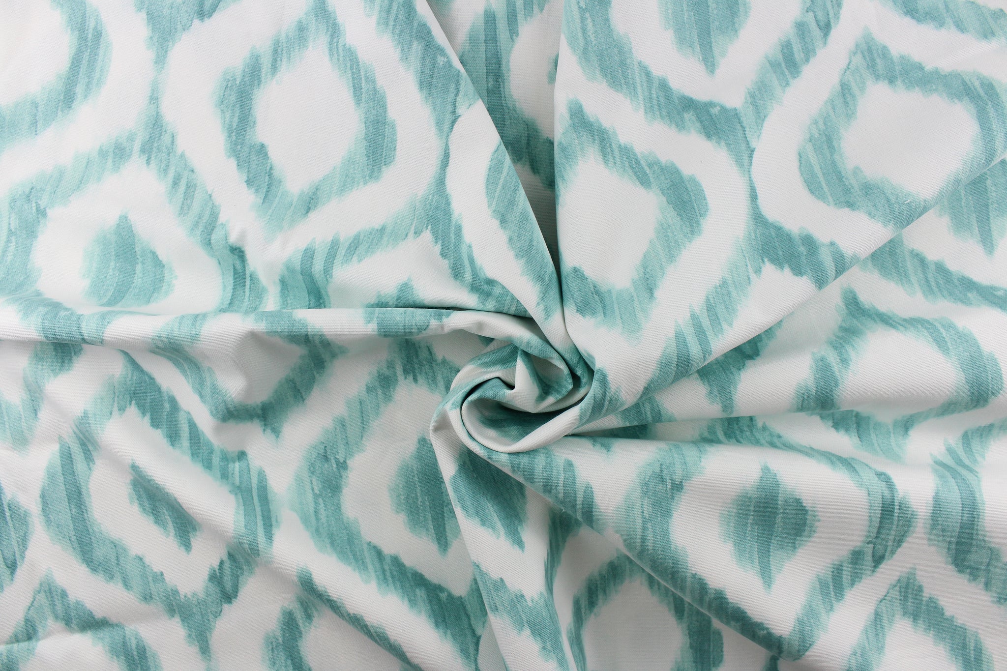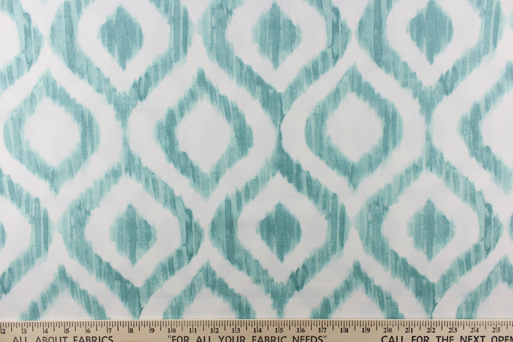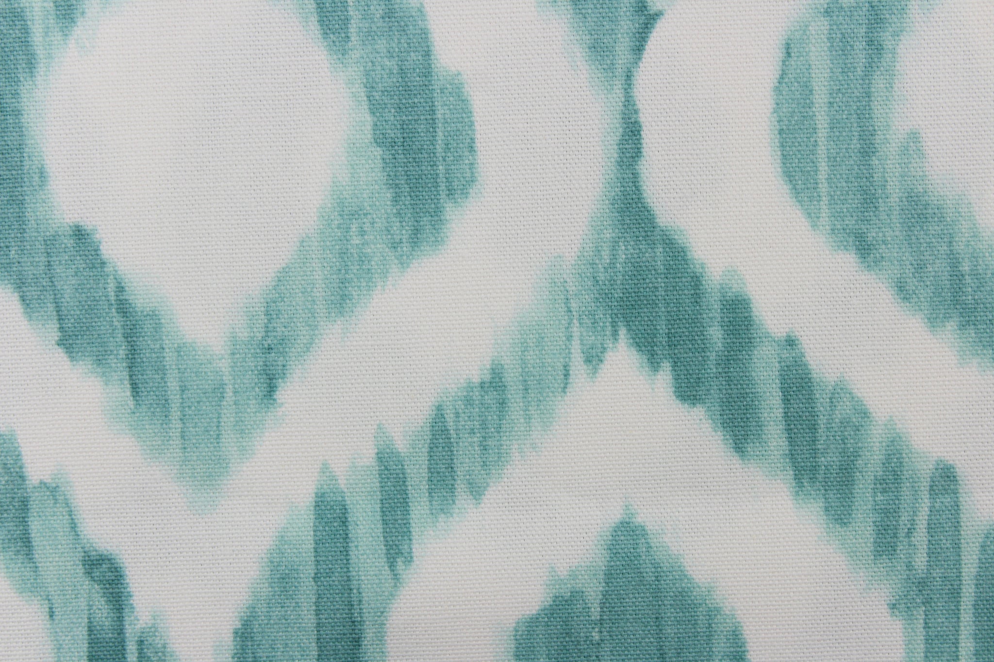 DESCRIPTION: Zanya, meaning "beauty" and "grace", in Ocean Breeze is a lovely designed fabric featuring a spa or muted aqua painterly pattern (characteristics of a traditional painting, often featuring visible brushstrokes, loose forms, and an emphasis on color and texture rather than sharp lines) over a cream background.