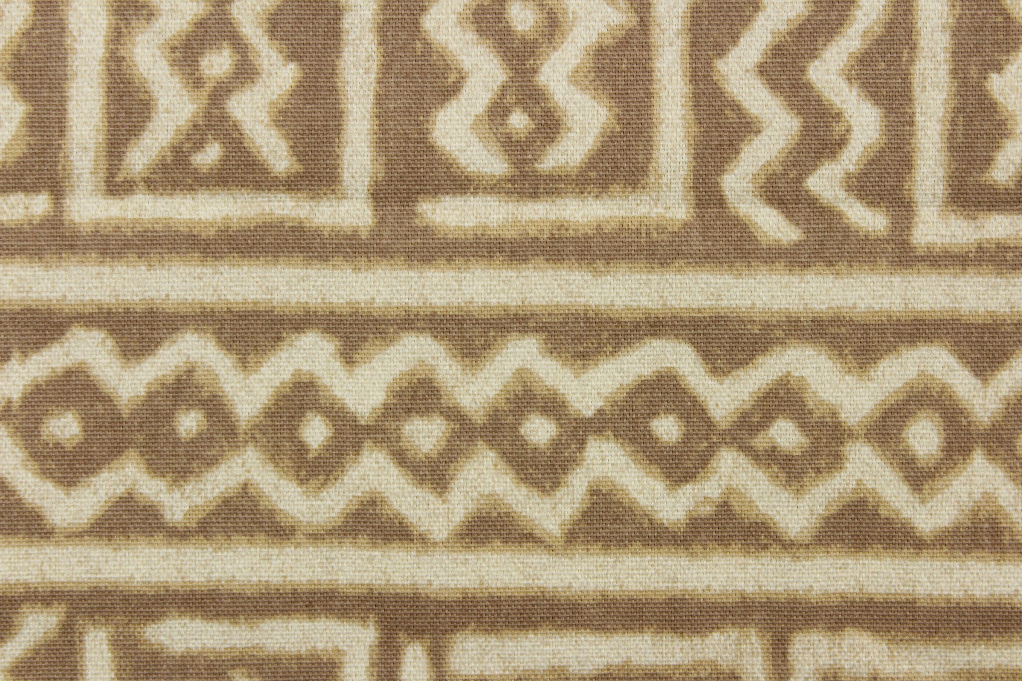 DESCRIPTION: This fabric features a Aztec design in off white against a taupe background. Use for drapery, pillows, light upholstery, handbags, etc. We offer this design in one other color.