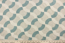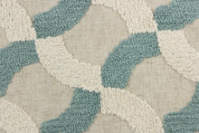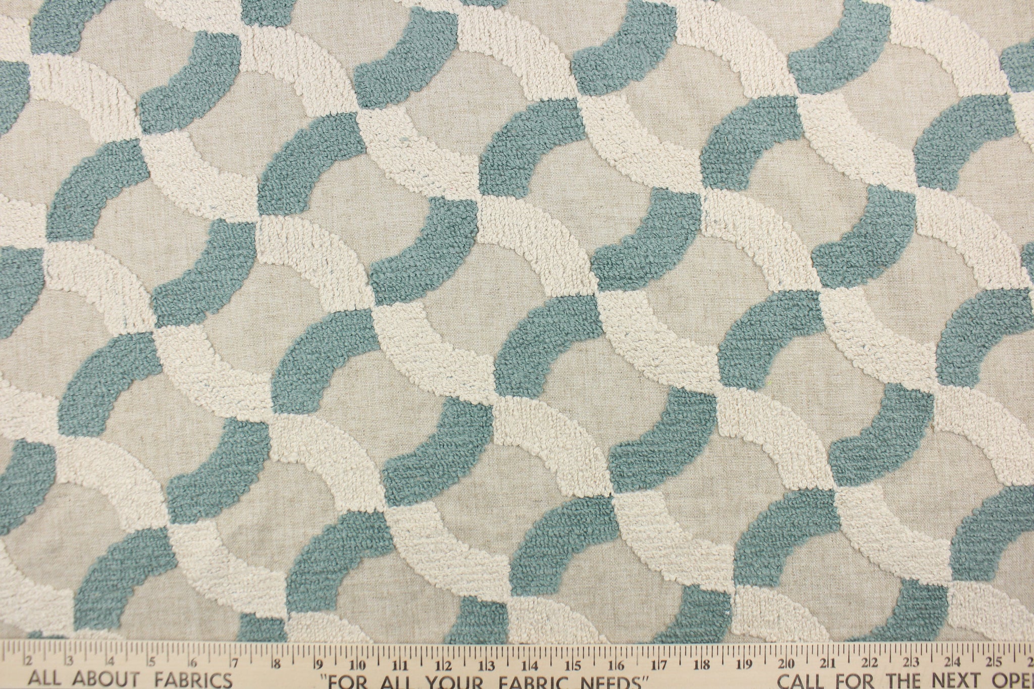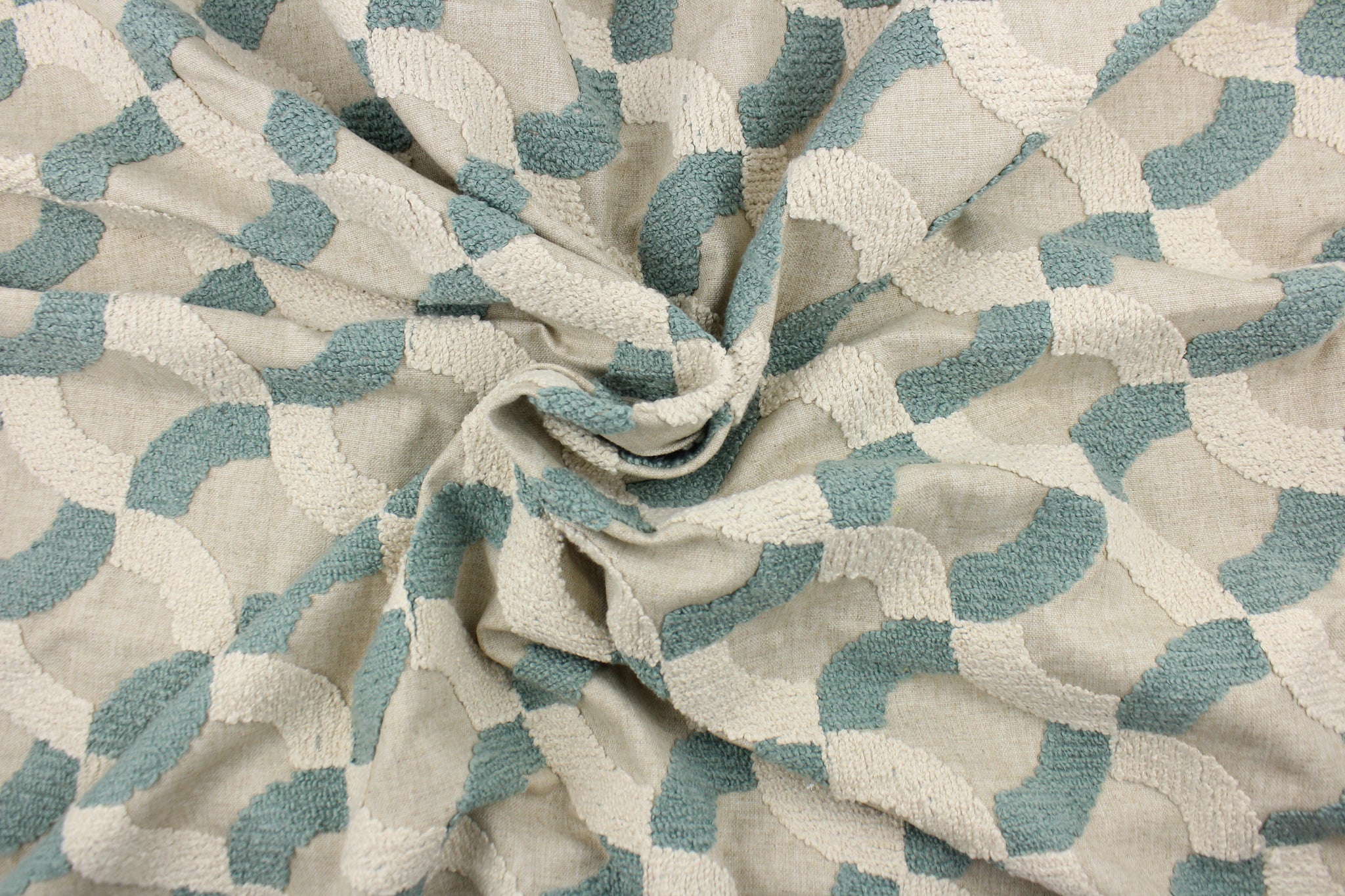 DESCRIPTION: This fabric features an embossed lattice design in seafoam green and beige on an oatmeal colored background. Use this for light upholstery, pillows, bedding and window treatments. We offer Nash in other colors.