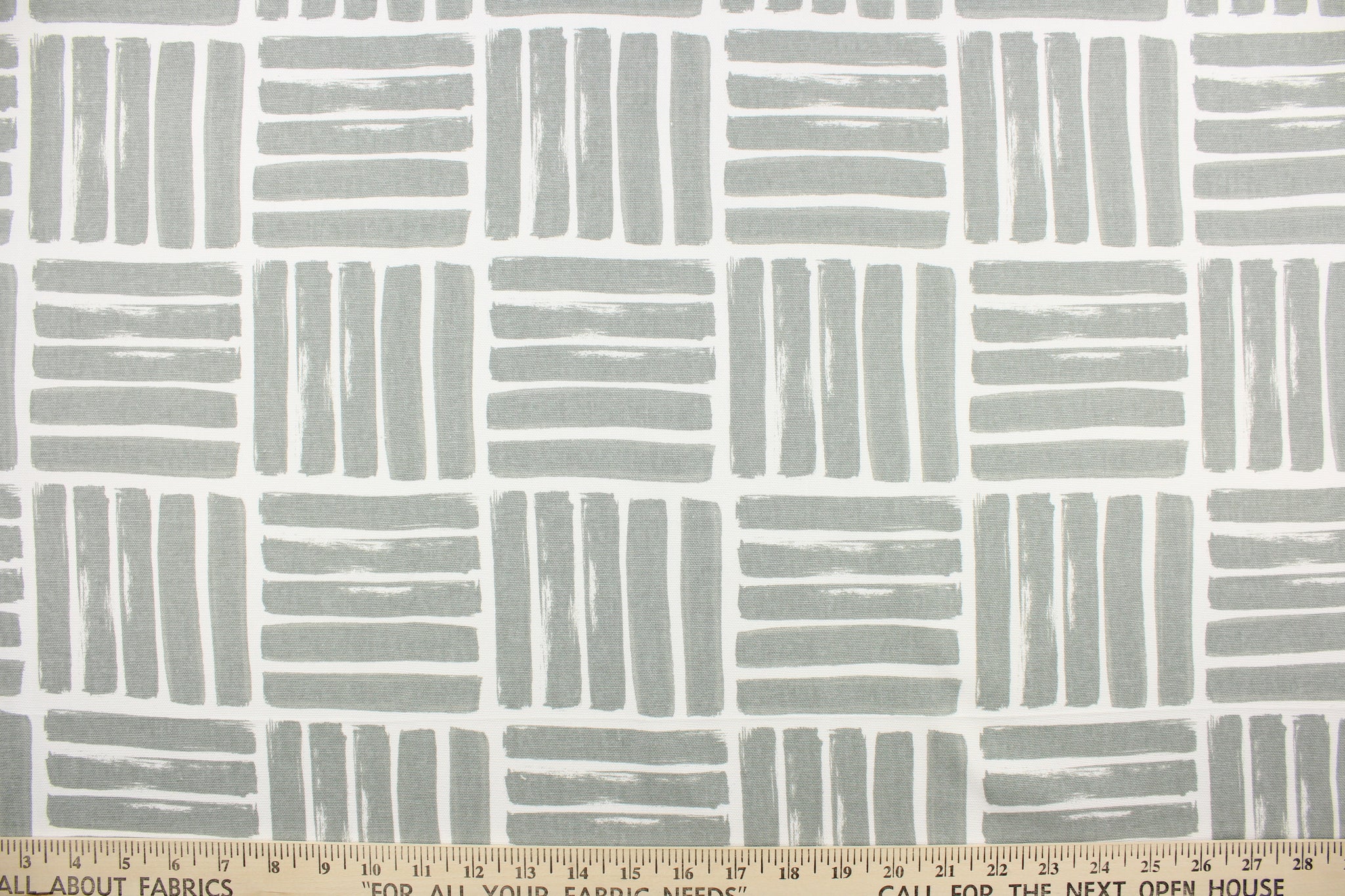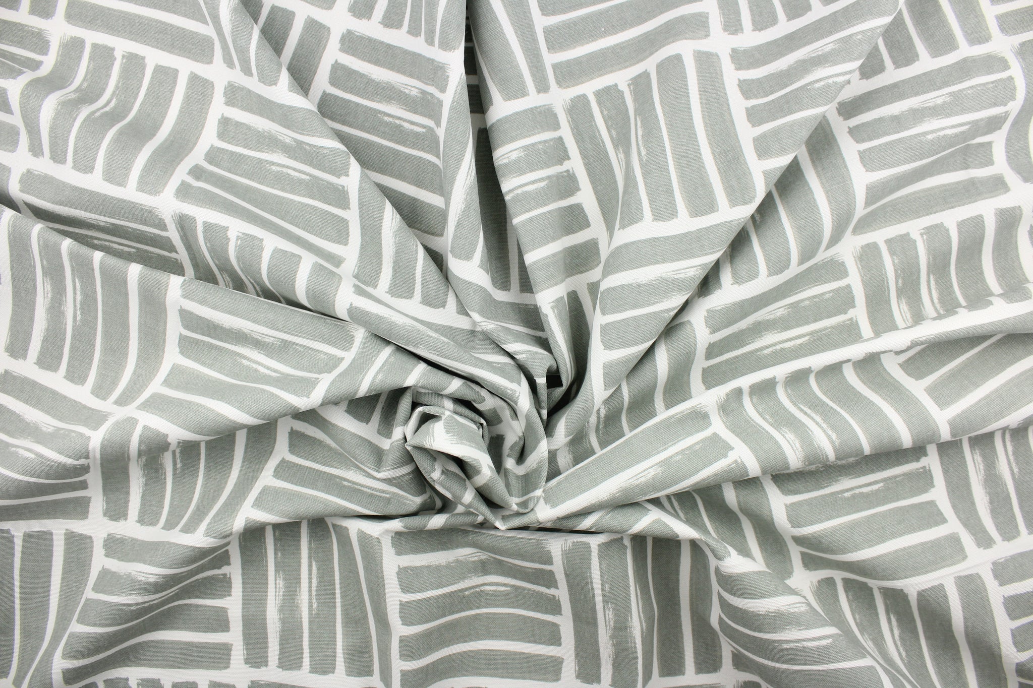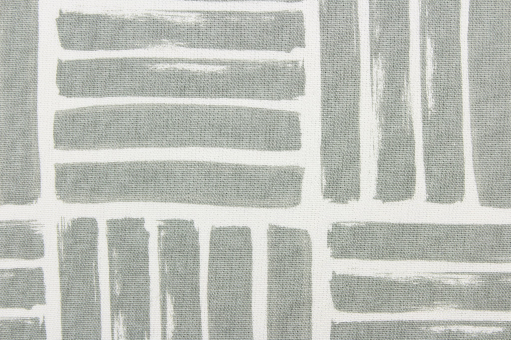 DESCRIPTION: This fabric features a geometric design of thick short stripes in gray against white. Use this for drapery, light upholstery, pillows, etc.