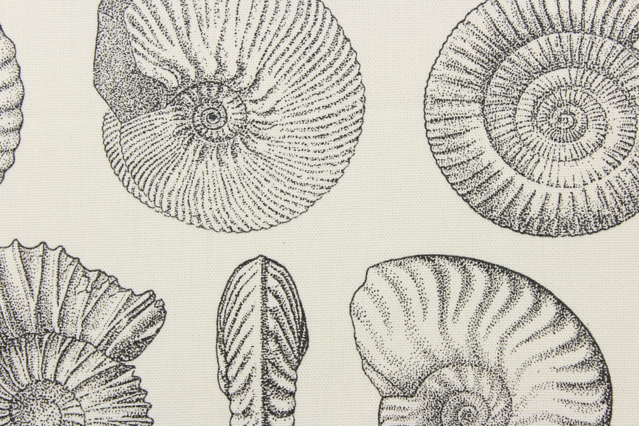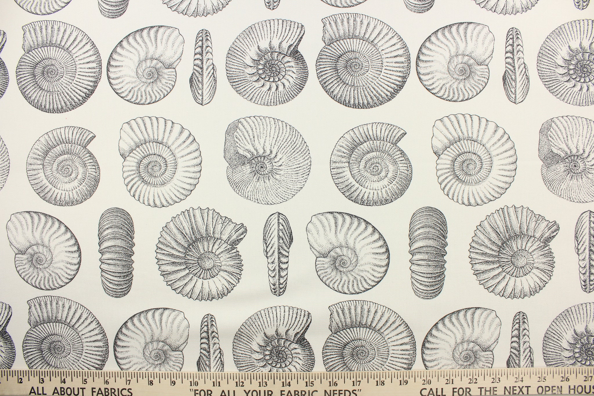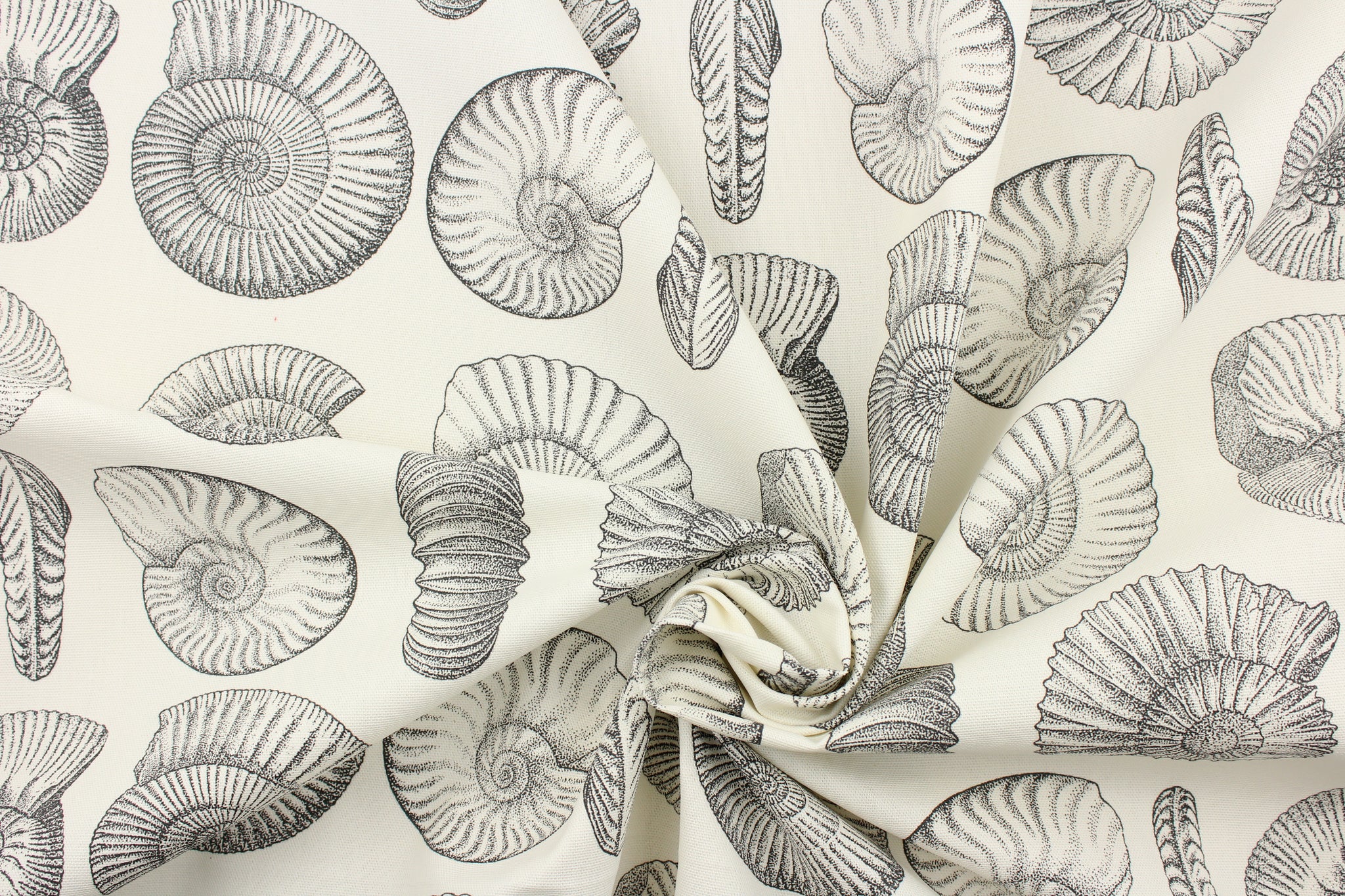 DESCRIPTION: This fabric features a seashell design in gray and black against a dull white . Use this for bedding, pillows, upholstery, drapery, etc. It has a durability rating of a minimum 15000 double rubs.