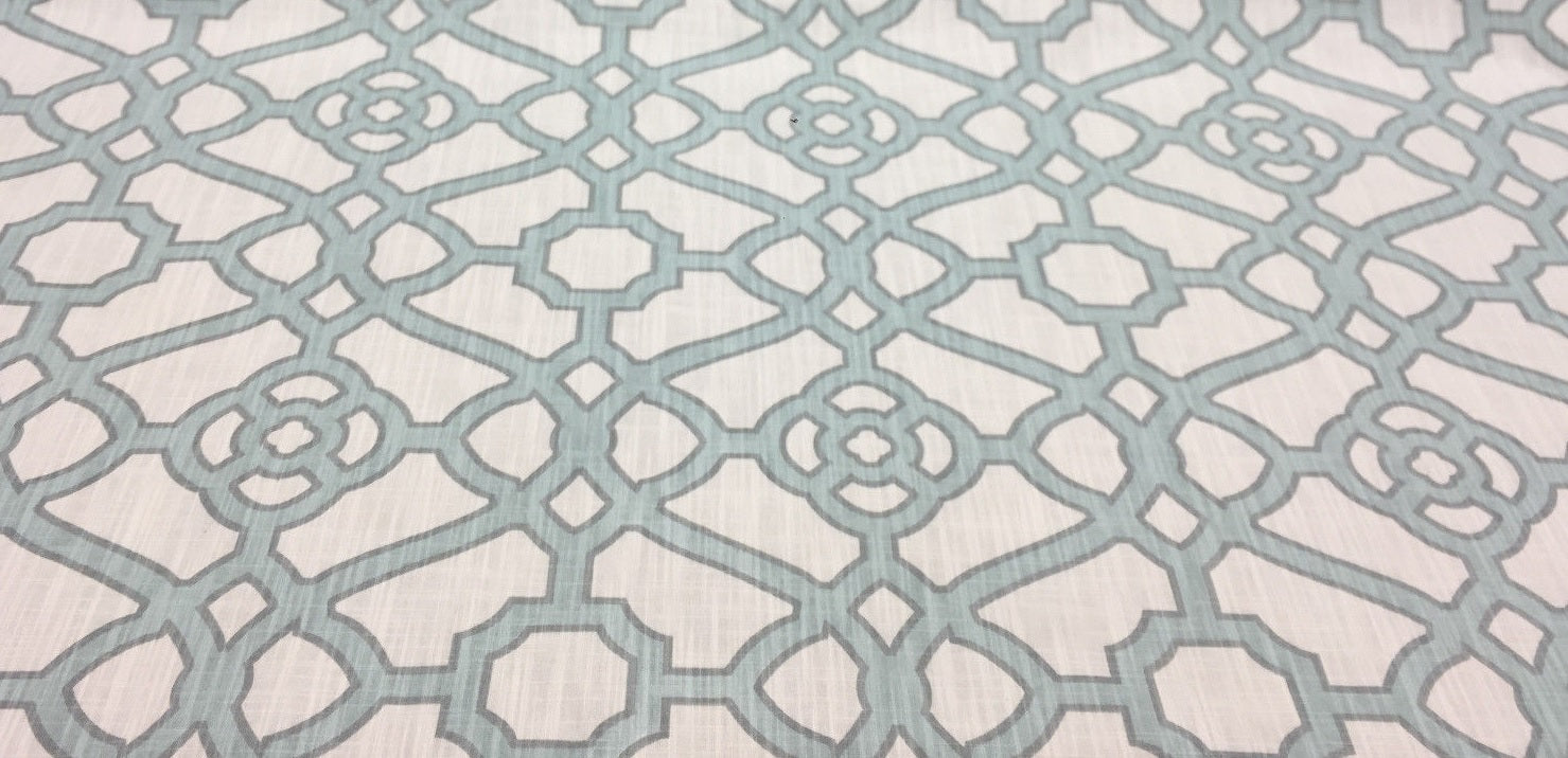 DESCRIPTION:  Pavilion Fretwork fabric features an intricate, ornamental design inspired by geometric lattice patterns with interlacing or scrollwork.   The color registration shows a blue design on an-off-white fabric.