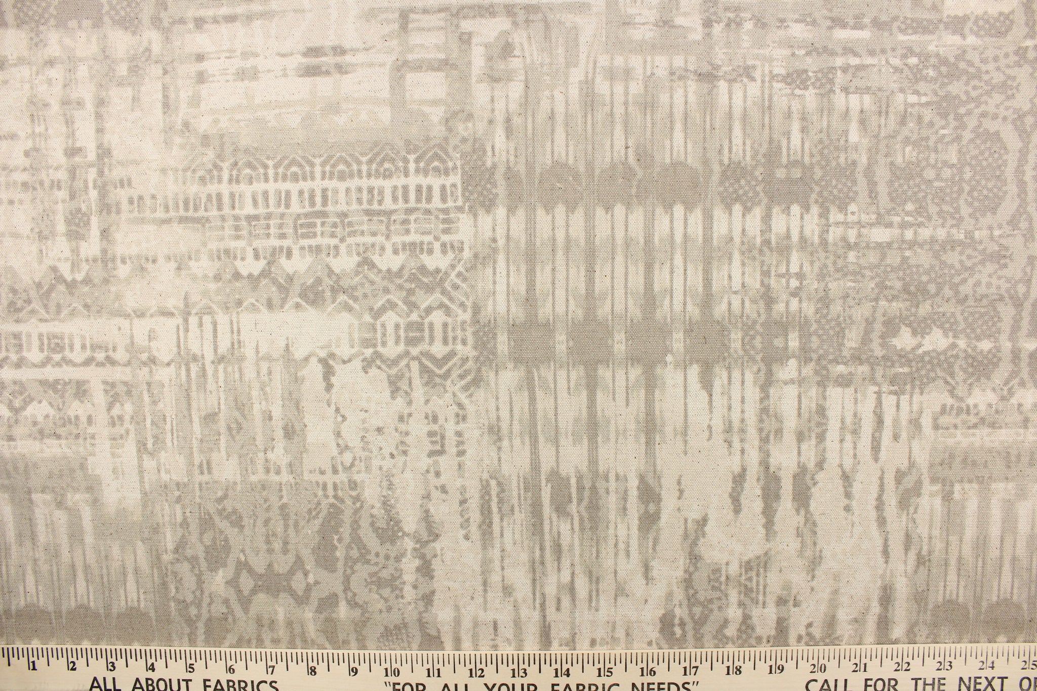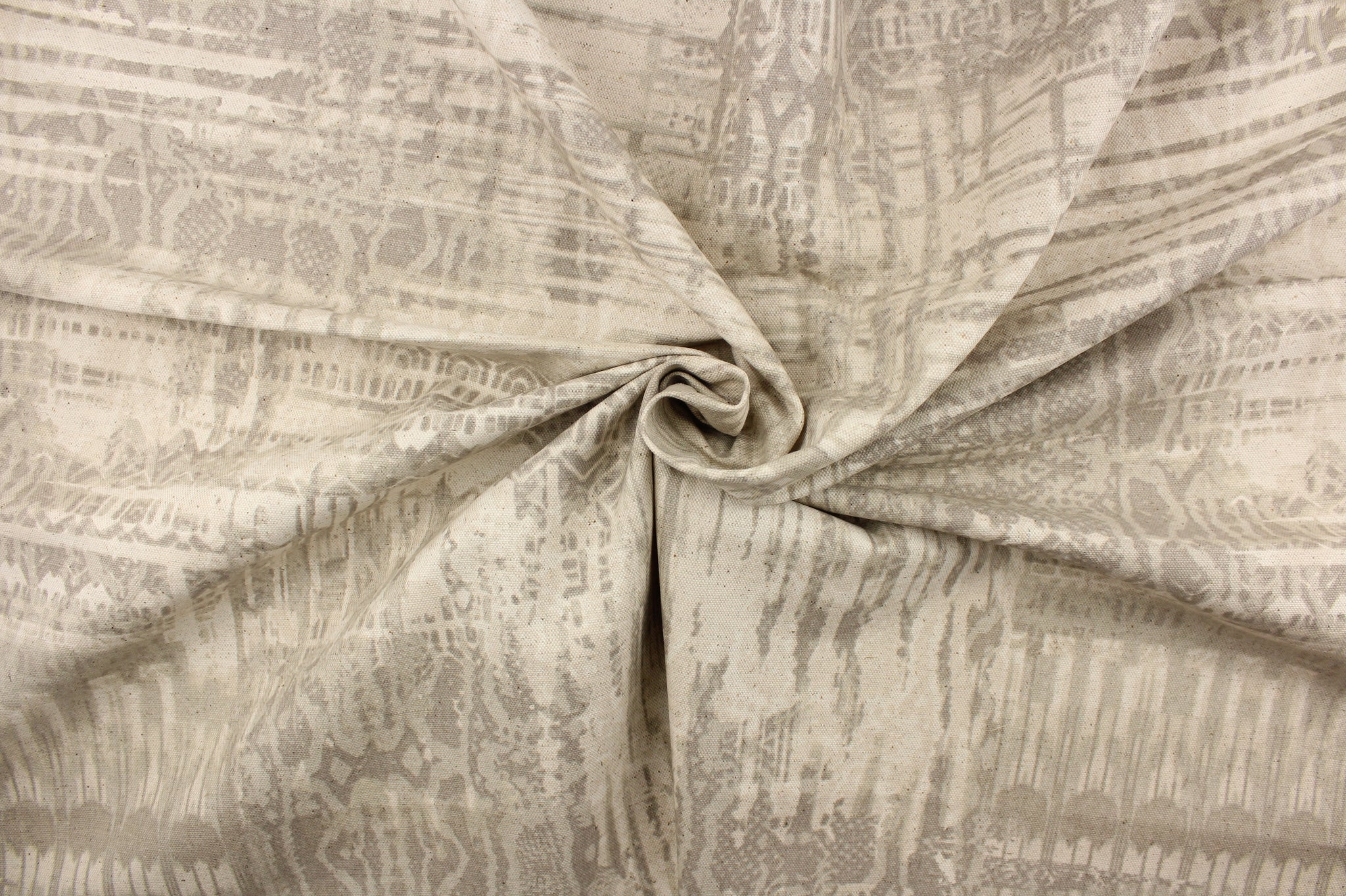 DESCRIPTION: This multi functional fabric features an abstract design in taupe on a beige background. It can be used for several different statement projects including window accents (drapery, curtains and swags), decorative pillows, hand bags, bed skirts, duvet covers, light duty upholstery and craft projects. It has a soft workable feel yet is stable and durable.