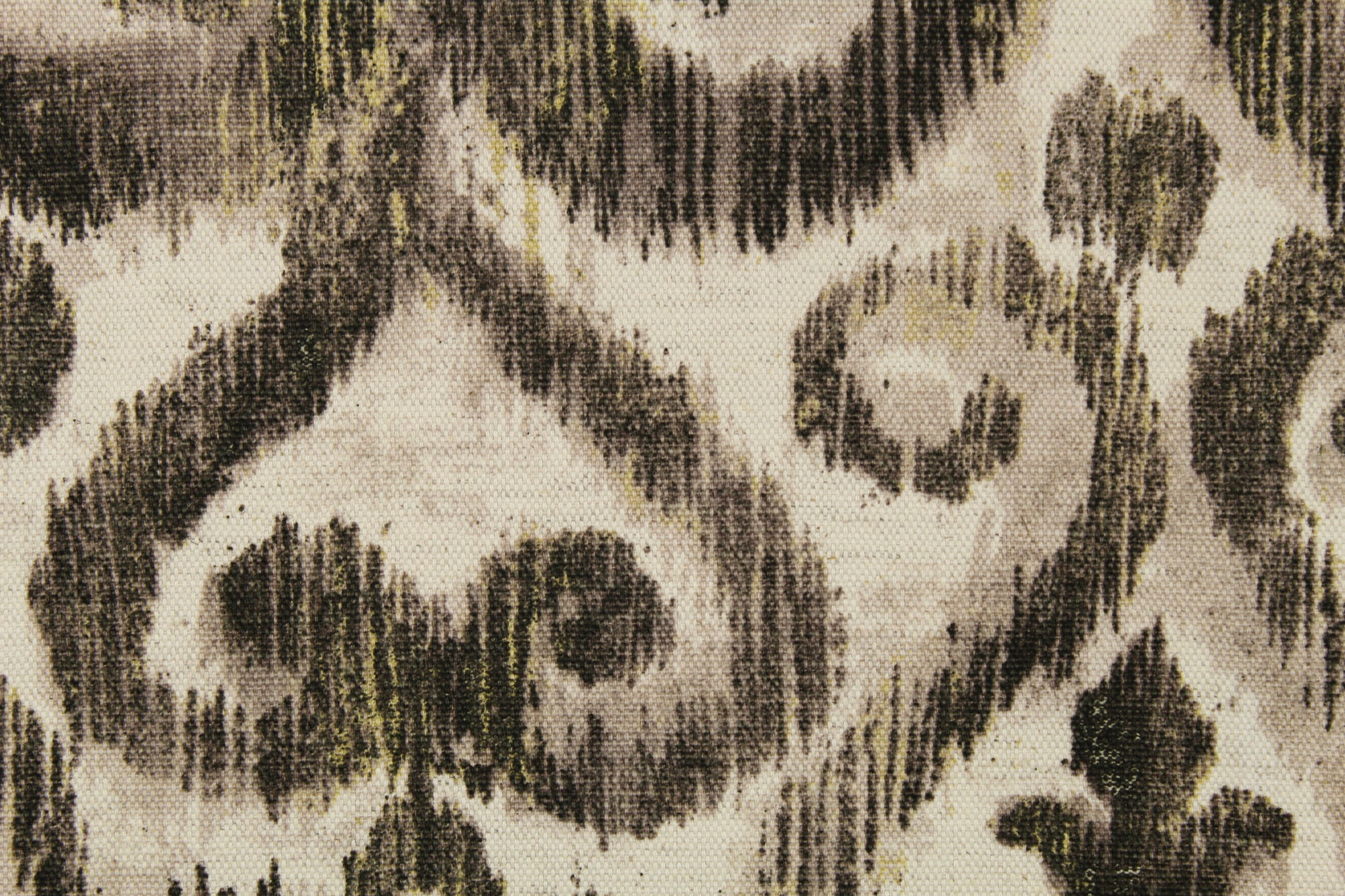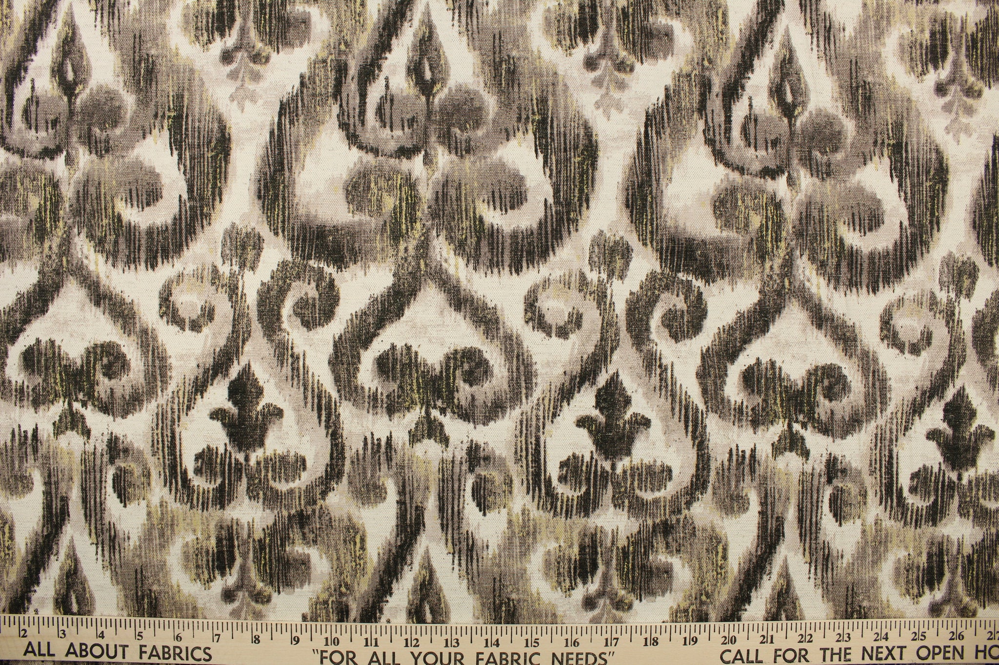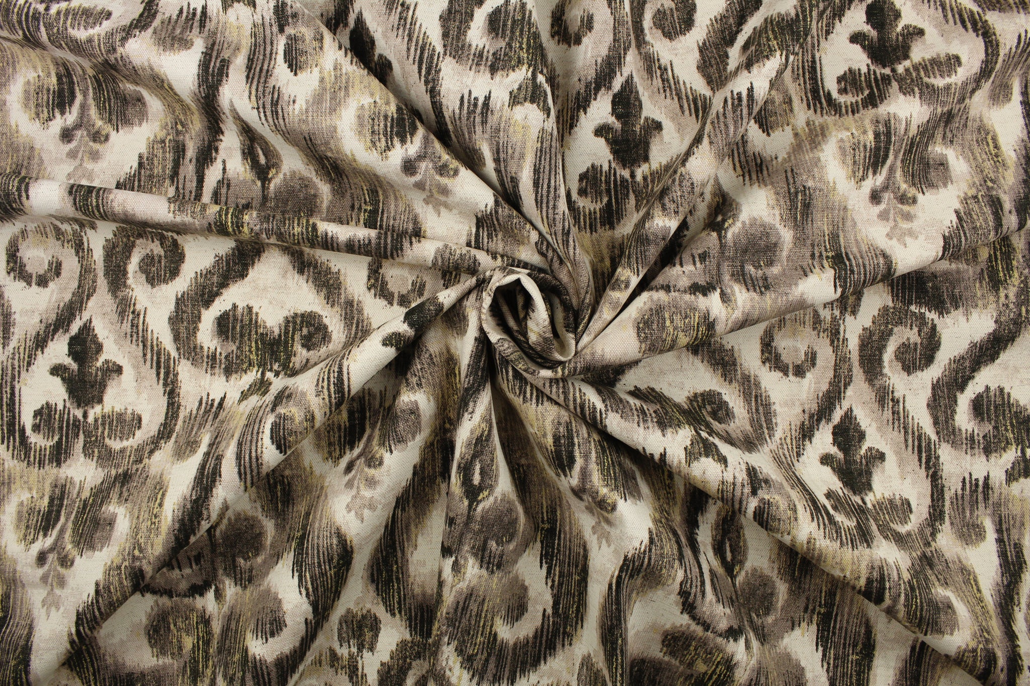 DESCRIPTION: This fabric features a demask design in black, taupe, pale gray, and dull white. Use this for upholstery, drapery, pillows, etc.